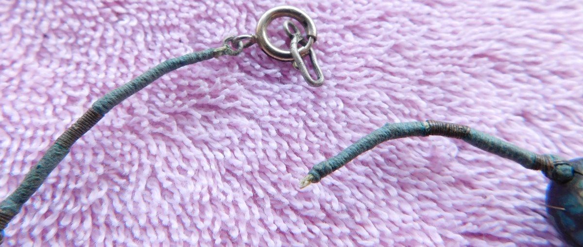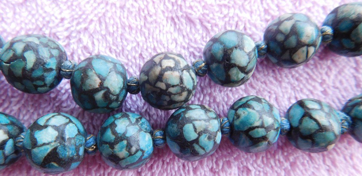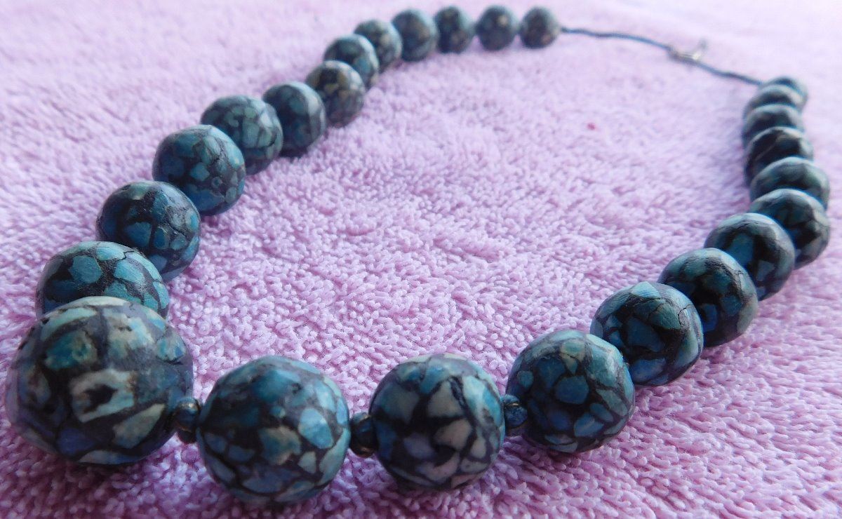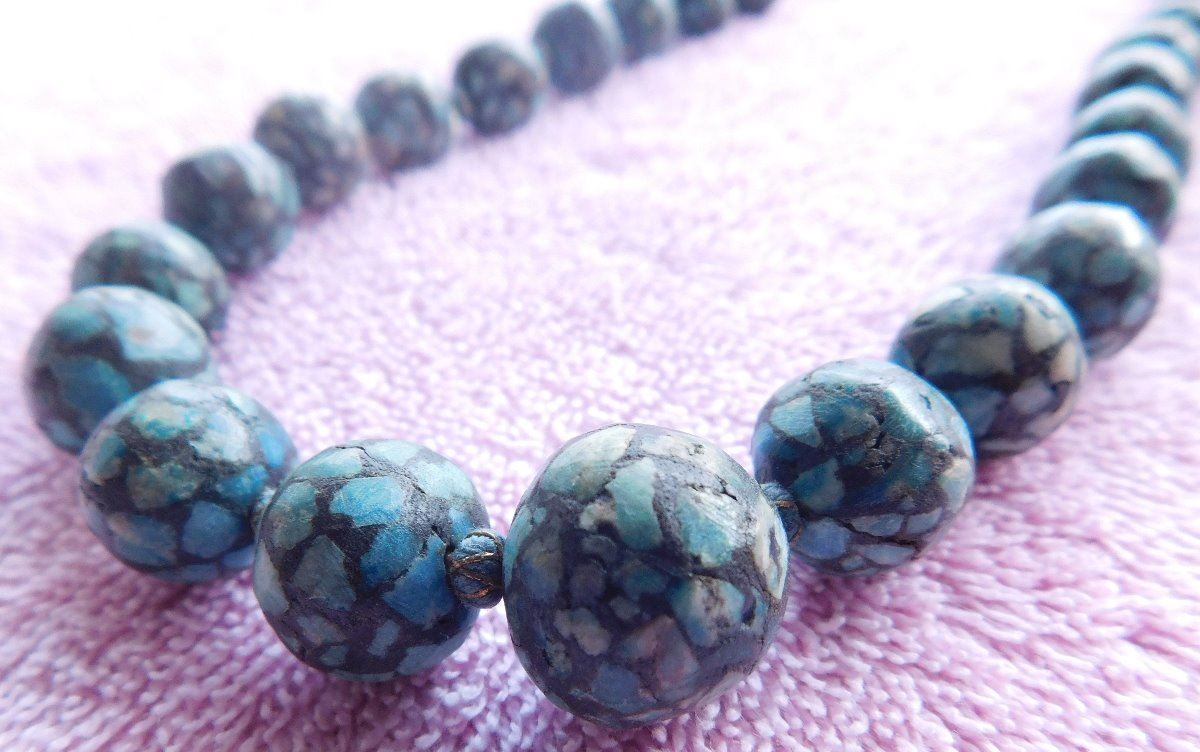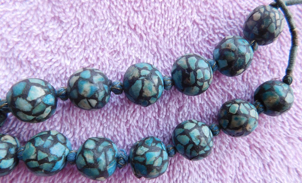 Turquoise Necklace, circa 1940s. Made of turquoise and silver, the item is 16" long, beads being approx. 0.5" to 1.25". Tibet. Old necklace from a San Diego estate. Condition: Clasp is damaged, see images. Shipping: $15.50 w/insurance and signature.