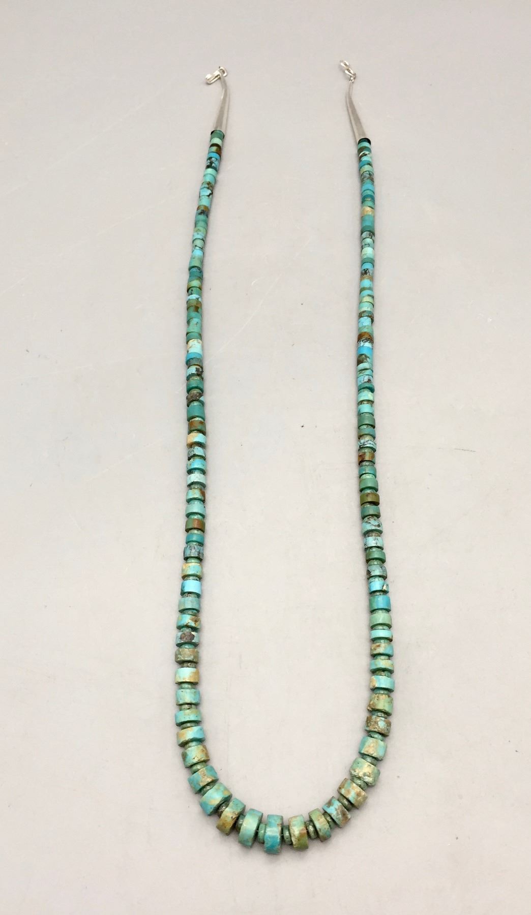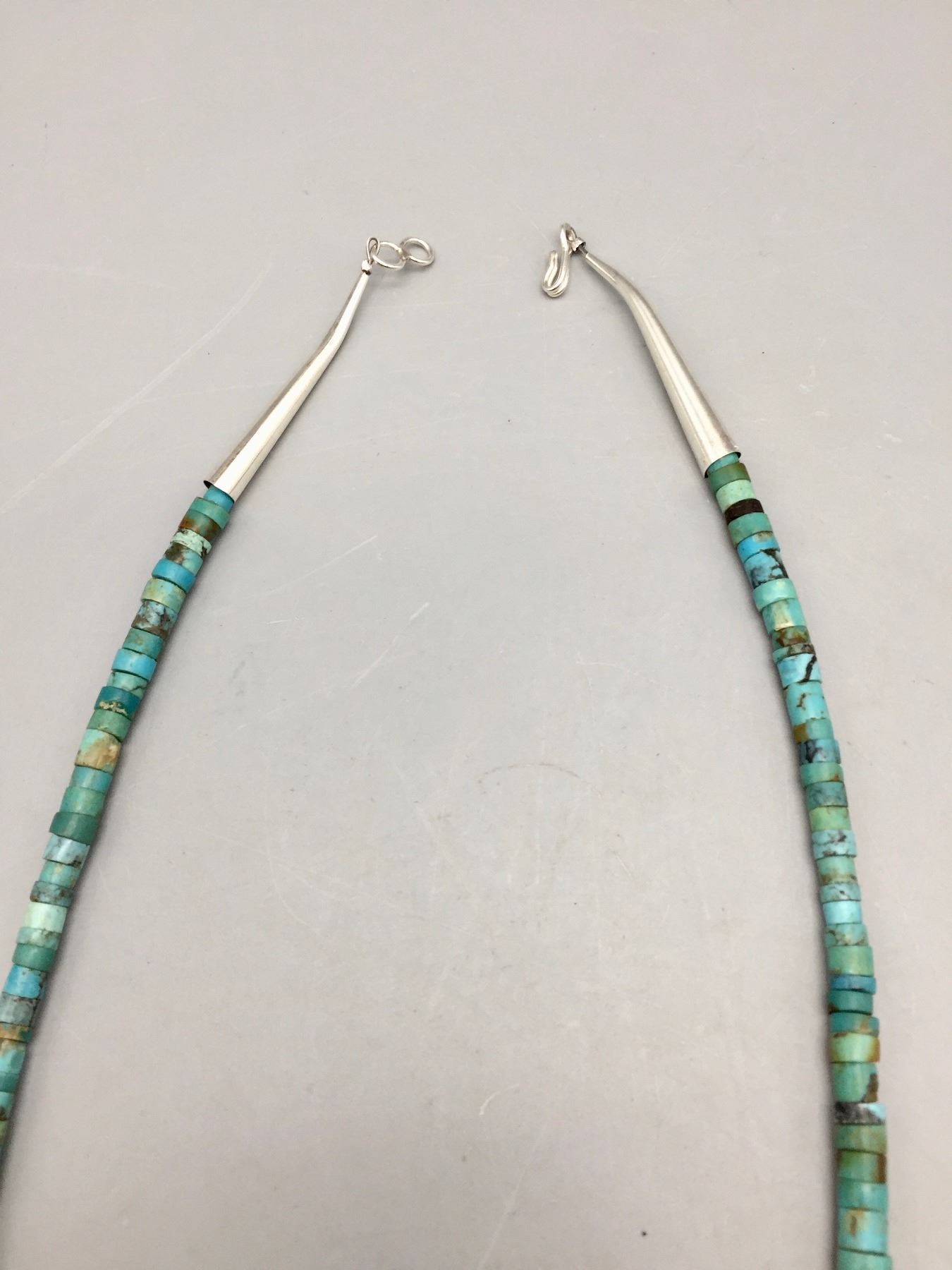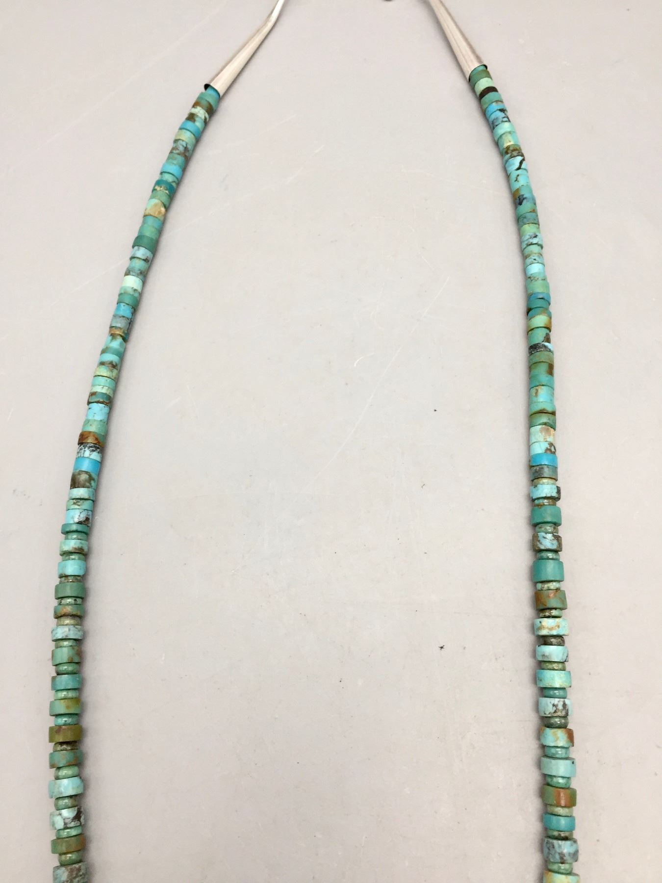 Description: Featured for sale in this lot is a gorgeous turquoise necklace with sterling silver findings. Maker: No hallmark. Approx. Age: Vintage. Size: Fits a 26” neck. Weighs 42 grams. Condition: Good for its age, normal wear expected. Please look closely at the pictures - they are an important part of our description. Shipping: There will be a $5 handling / packaging fee for shipping this lot. The actual cost of postage will be added on top of that.