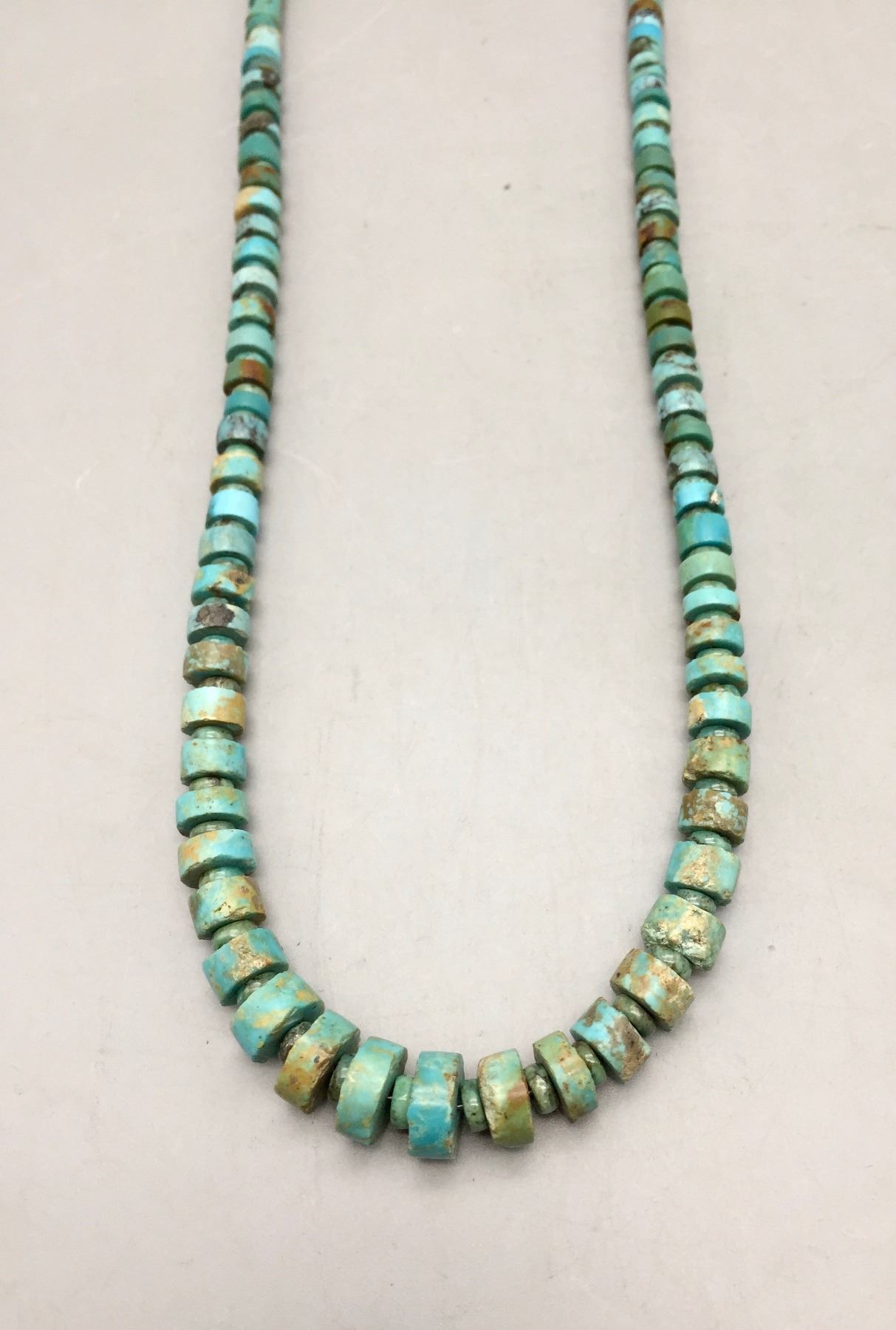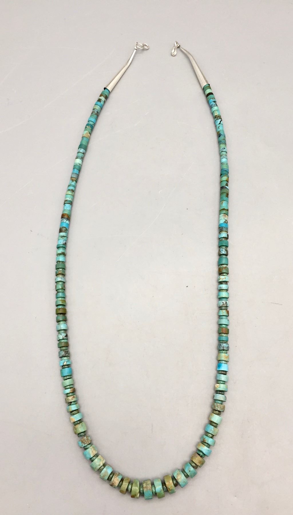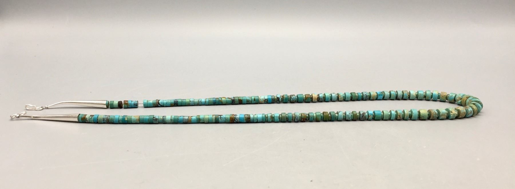 Description: Featured for sale in this lot is a gorgeous turquoise necklace with sterling silver findings. Maker: No hallmark. Approx. Age: Vintage. Size: Fits a 26” neck. Weighs 42 grams. Condition: Good for its age, normal wear expected. Please look closely at the pictures - they are an important part of our description. Shipping: There will be a $5 handling / packaging fee for shipping this lot. The actual cost of postage will be added on top of that.