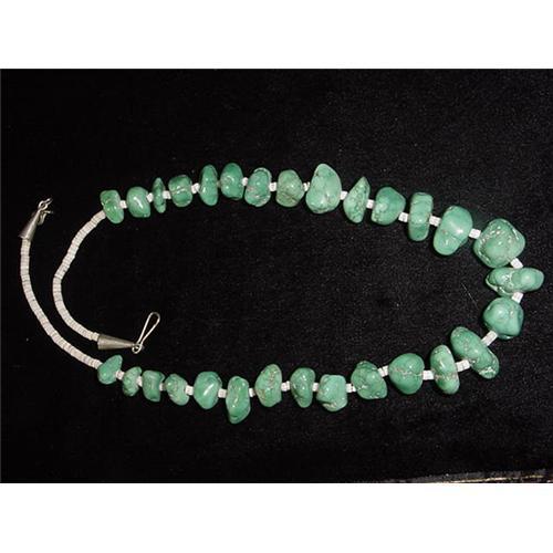 20 1/2 inches Long ** Gorgeous Kings Blue Green Natural Polished Graduated Turquoise Nuggets Spaced with Shell Heishe and Silver Findings ** Museum Quality ** Circa 60s