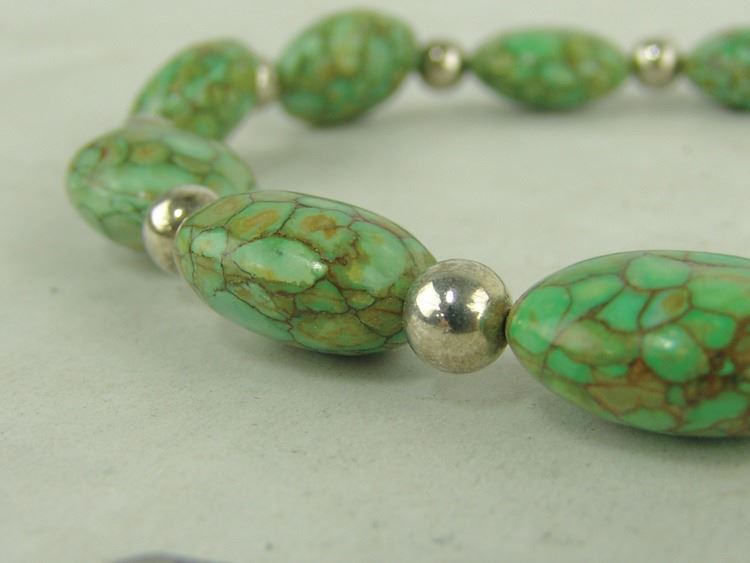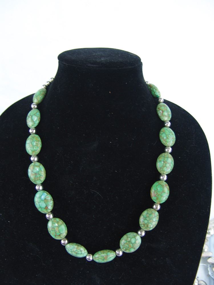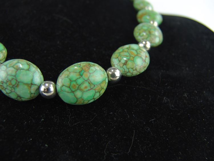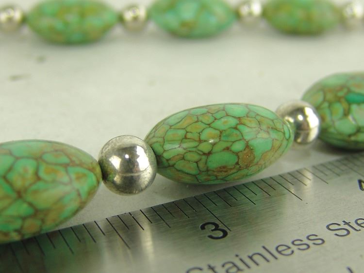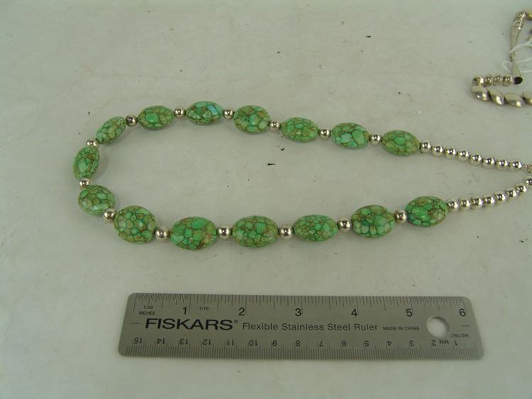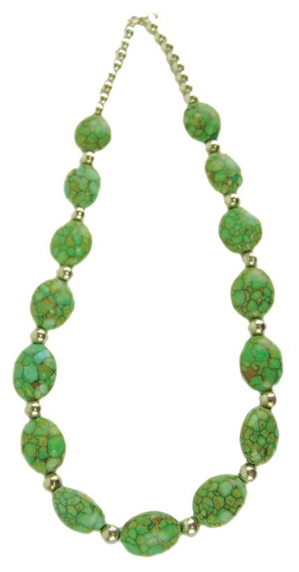 Single strand of large beautiful green composite turquoise beads strung on bright nickel silver beads. Very good condition.,Early 2000s,21"