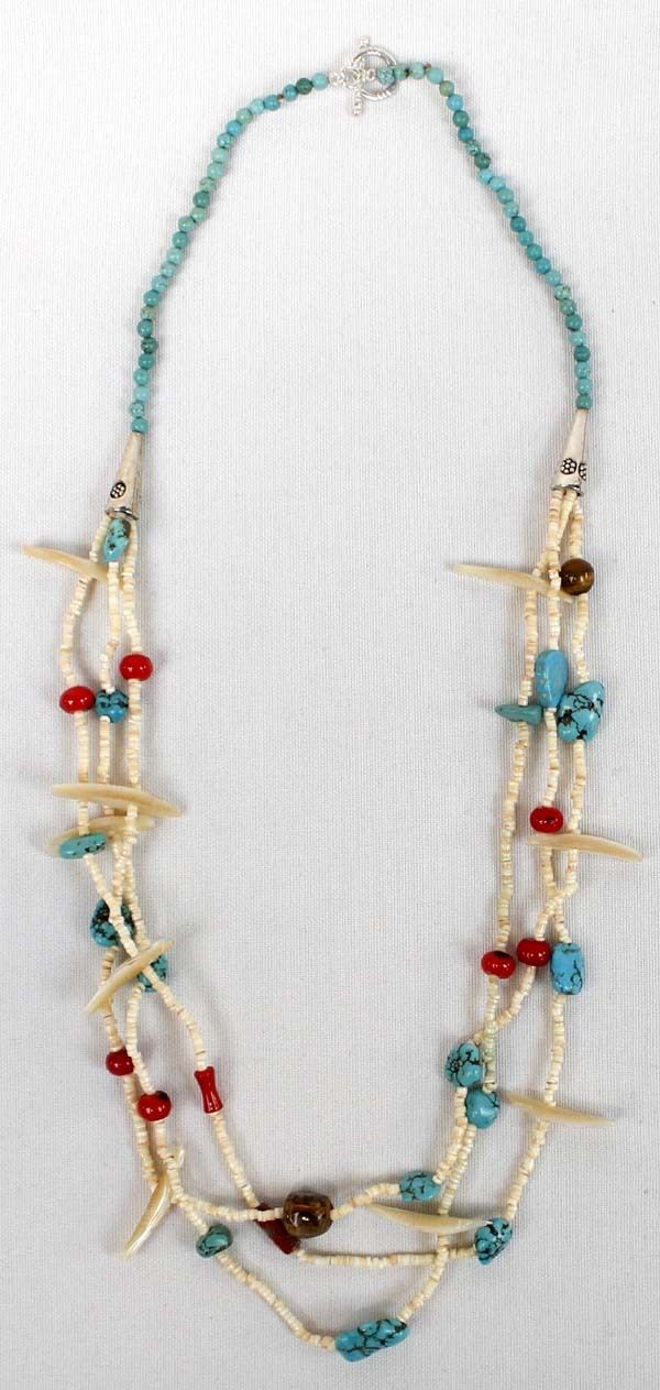 3 Strand Turquoise Nugget and Shell Bird Fetish Necklace, silvertone cones, shell heishi, multi-stone bead accents, measures 24''L end to end, toggle closure