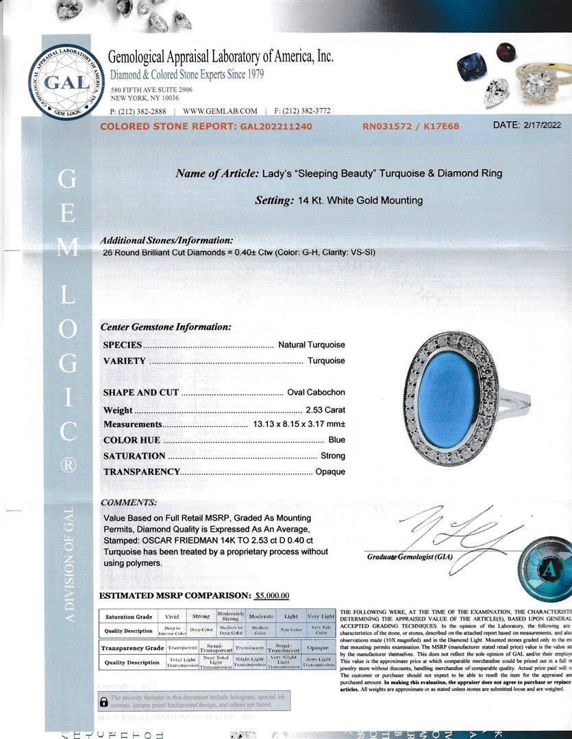 Turquoise Oval Ring. Please see Photos and Description for all available information. This oval shaped turquoise ring features a 2.53ct oval shaped turquoise stone surrounded by .40cts of round diamonds. This ring is crafted in 14kt white gold and is available in 4 different sizes.