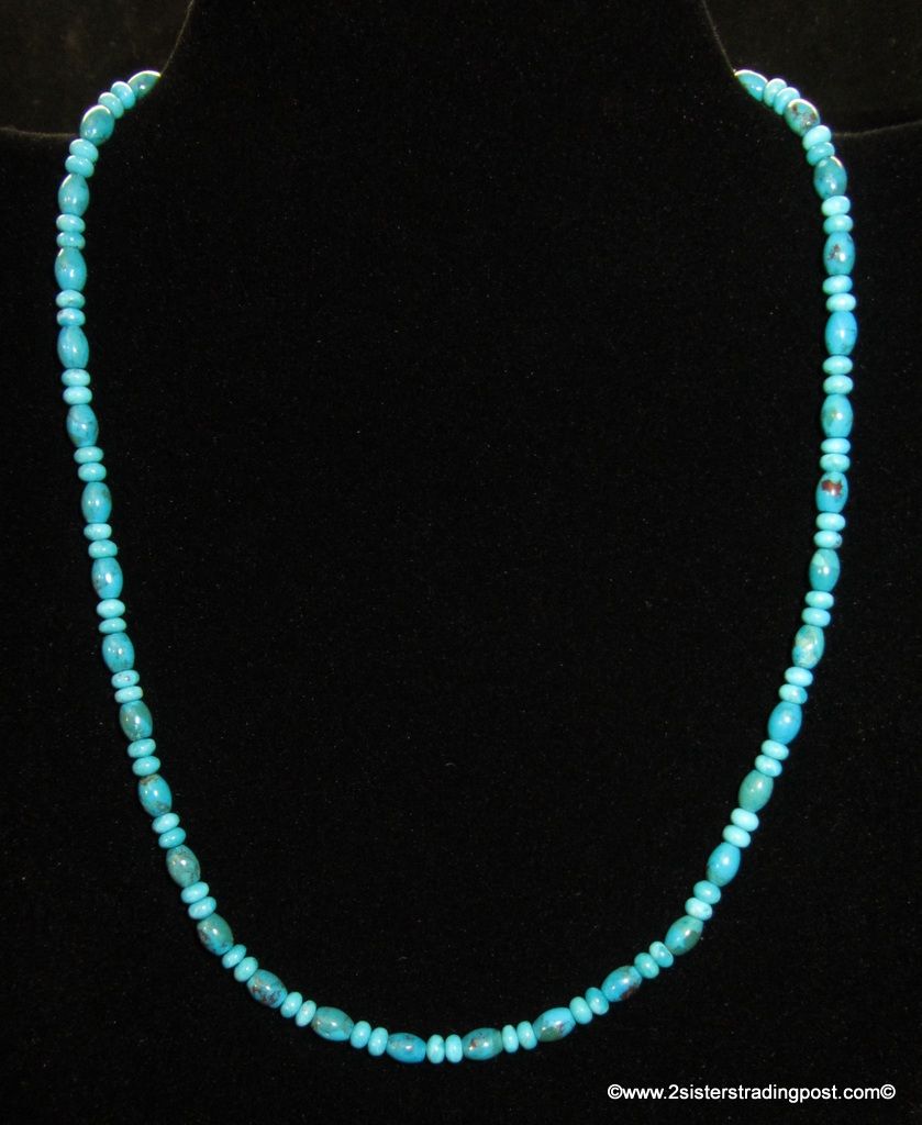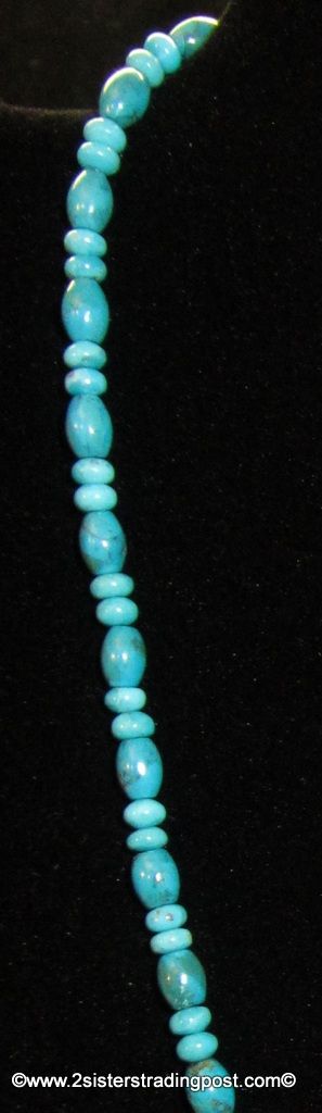 17" Oval & Rondelle turquoise necklace made up of 6 mm x 4.5 mm oval beads and 4.1 mm diameter x 2.5 mm thickness rondelle's. The necklace is uniform in size and style with two rondelle's between each oval bead. Very simple yet elegant style. Necklace weighs 11.5 g, has a 4 mm silver bead at each end that is capped with cone tips and a lobster claw closure. Piece is stamped sterling & .925 but is not signed by the artist.