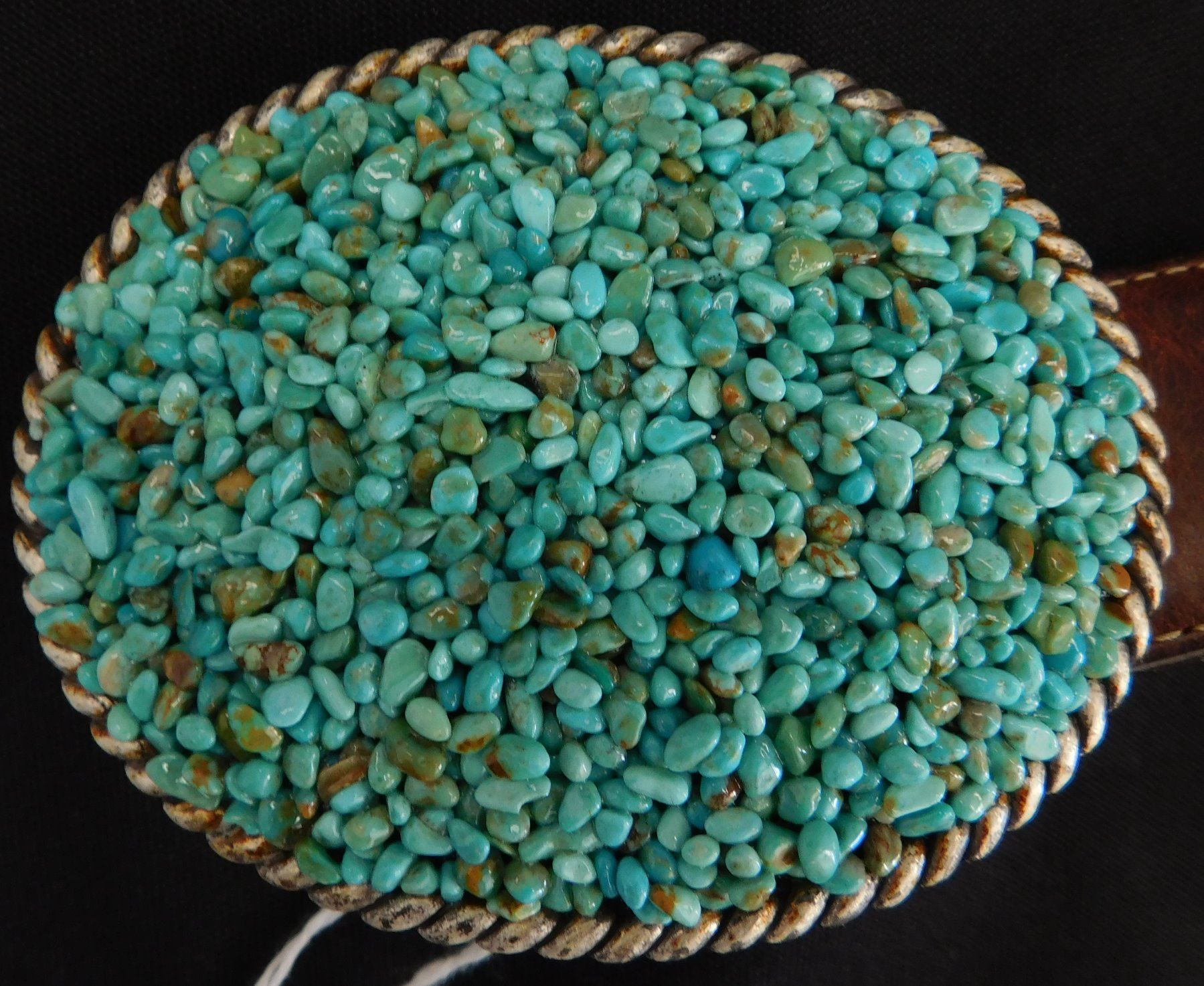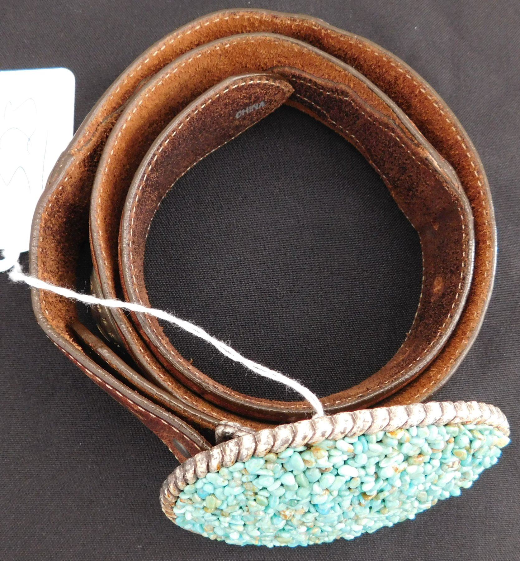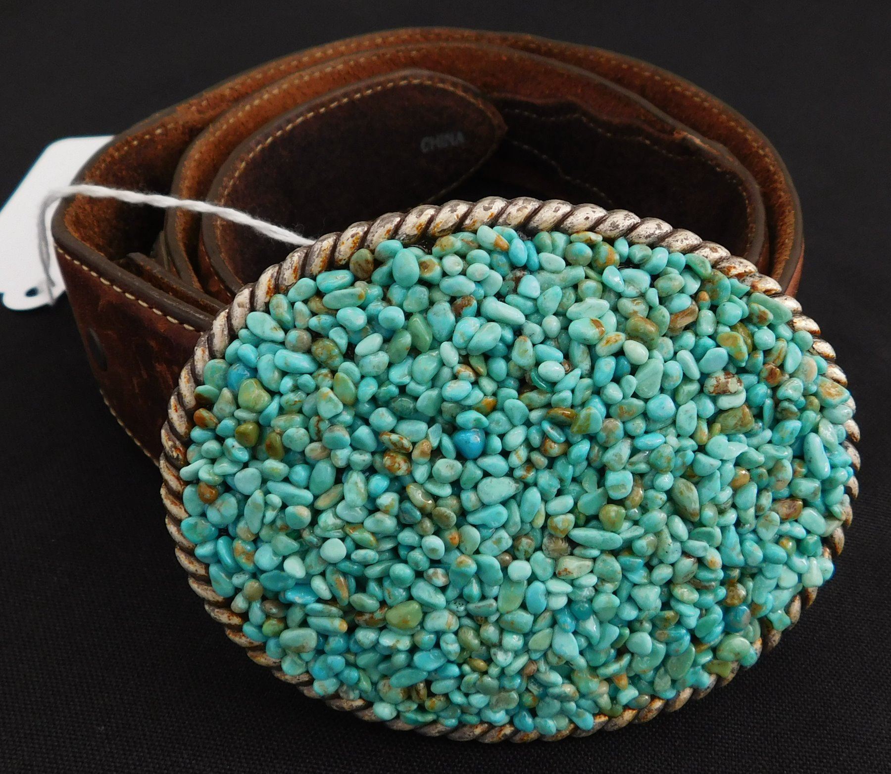 Turquoise Pebble Buckle w/Leather Belt, modern item. Made of turquoise pebbles on metal buckle with brass, steel and leather, the buckle measures 4" x 3" and the belt is a size 30". 2 metal conchos with star design on leather belt, buckle detaches easily from small Chinese leather belt. Condition: Good, see images. Shipping: $14.50 w/insurance and signature.