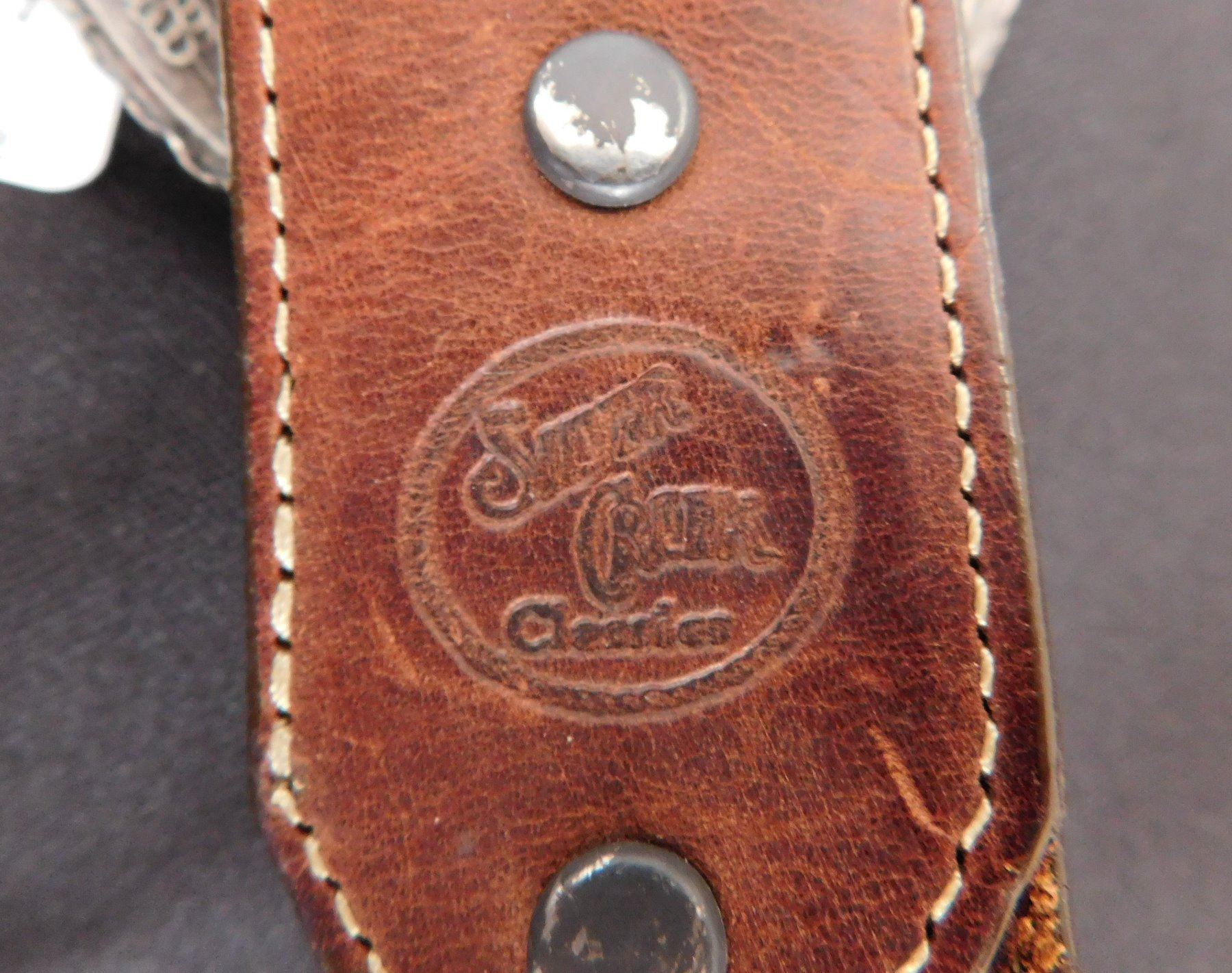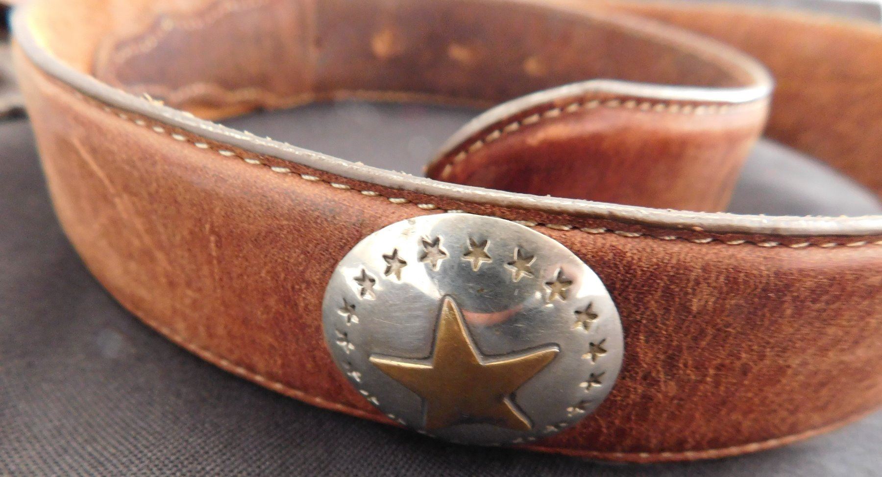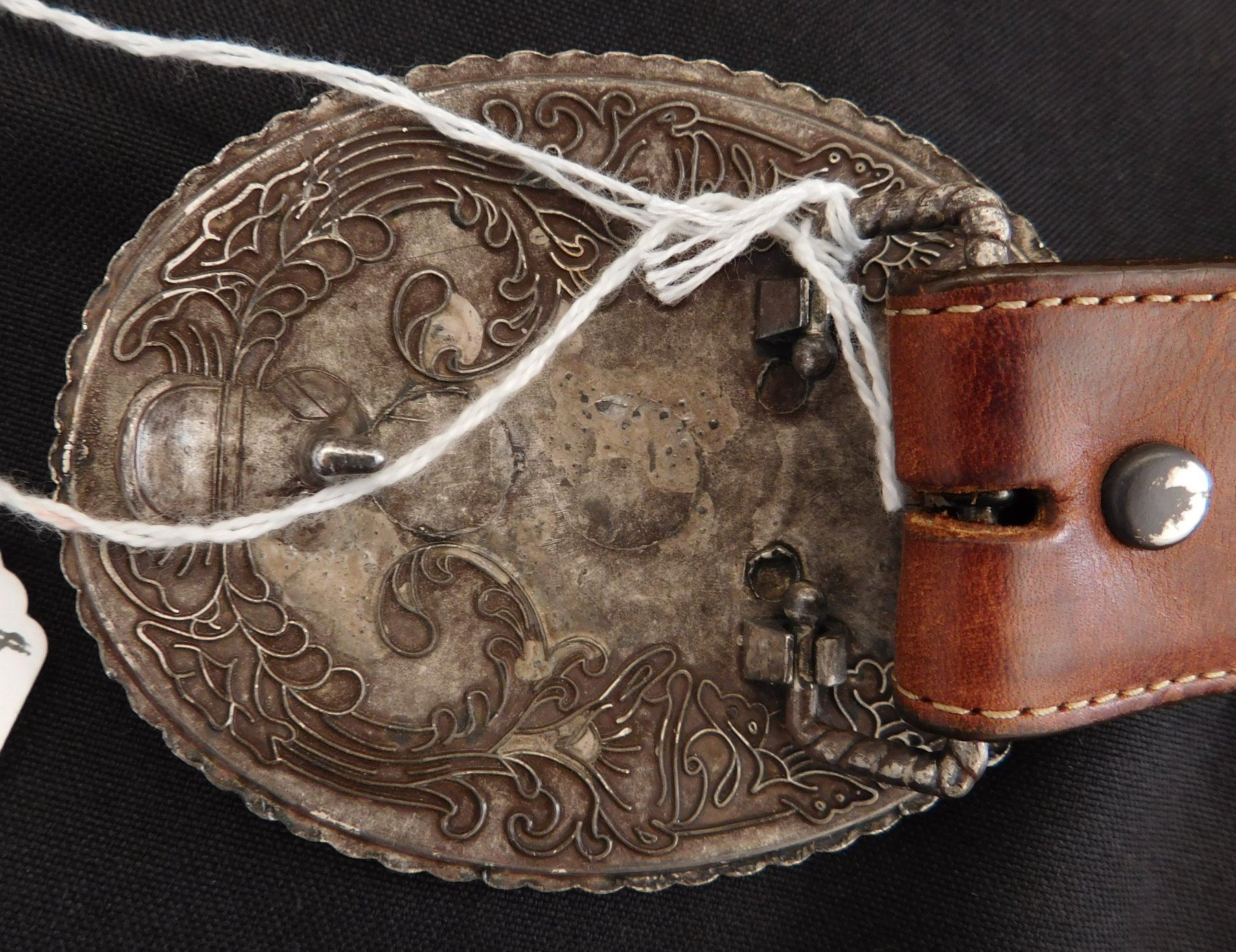 Turquoise Pebble Buckle w/Leather Belt, modern item. Made of turquoise pebbles on metal buckle with brass, steel and leather, the buckle measures 4" x 3" and the belt is a size 30". 2 metal conchos with star design on leather belt, buckle detaches easily from small Chinese leather belt. Condition: Good, see images. Shipping: $14.50 w/insurance and signature.