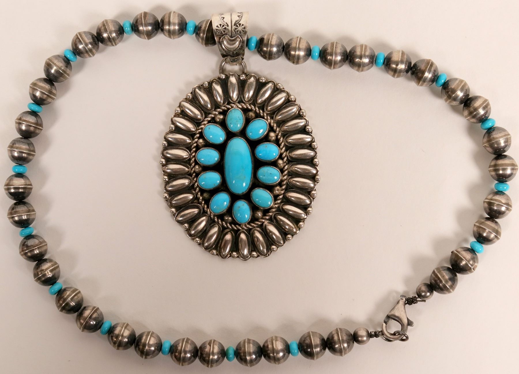 Great silver and turquoise pendant on a silver bead and turquoise chain, this is a Navajo signed piece, signature appears to be single name of Gabby, oval pendant is 2-1/2” by 2” across 11 beautiful turquoise stones in pendant and all sterling silver through-out, top to bottom length measures at 11”.