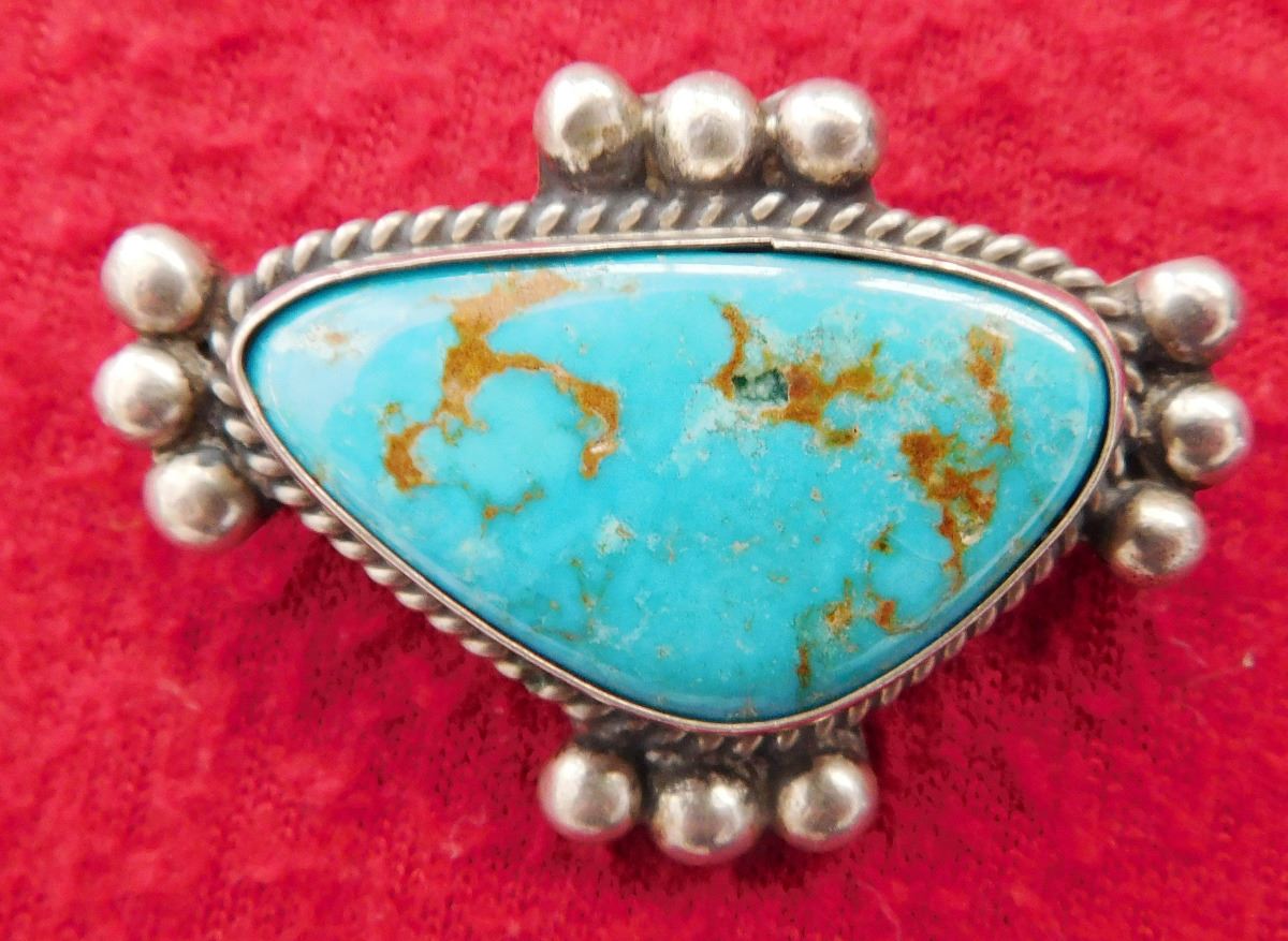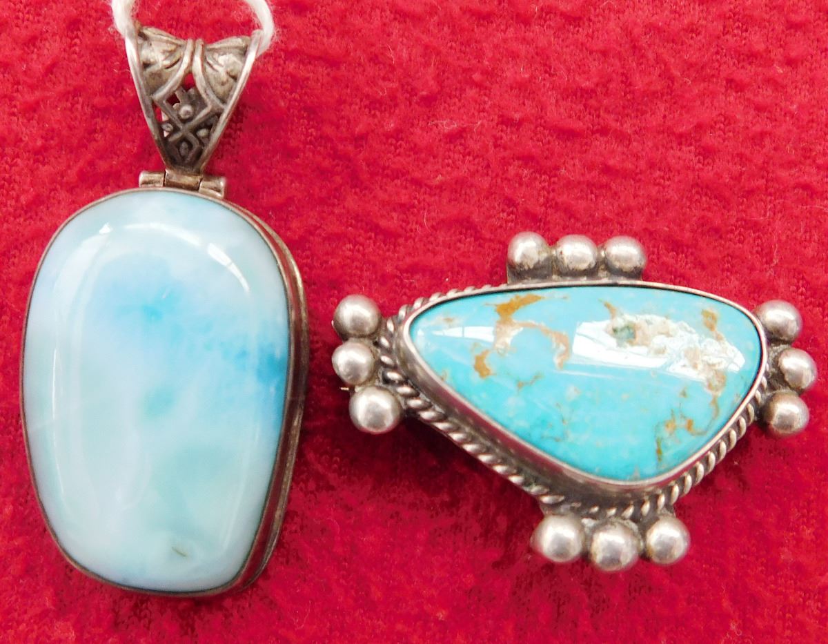 Turquoise Pin & Pendant, circa 1960s. Made of sterling silver and turquoise, the pin measures 1.5" x 1" x 0.25" and the pendant measures 1 3/4" x 7/8" x 1/2". Navajo, and possibly American. Total lot weight is approx. 31 grams. Condition: Very nice, see images. Shipping: $15.50 w/insurance.