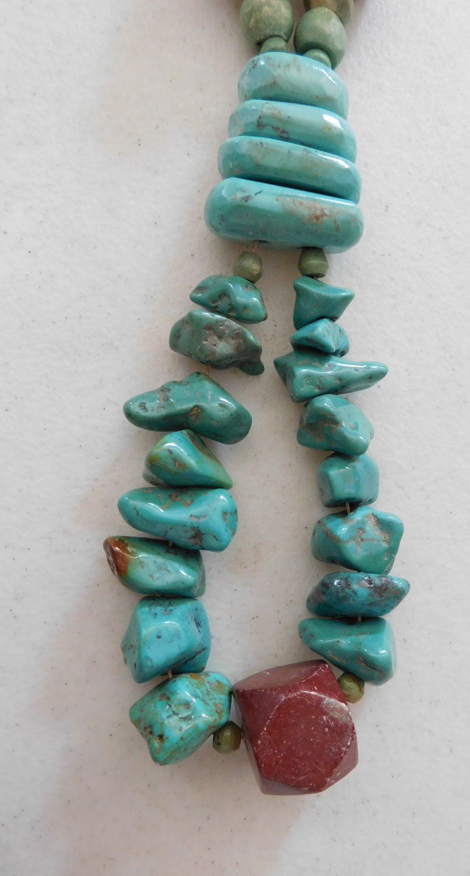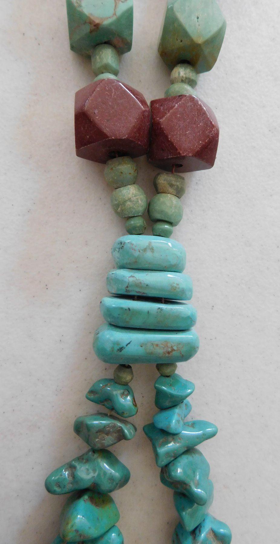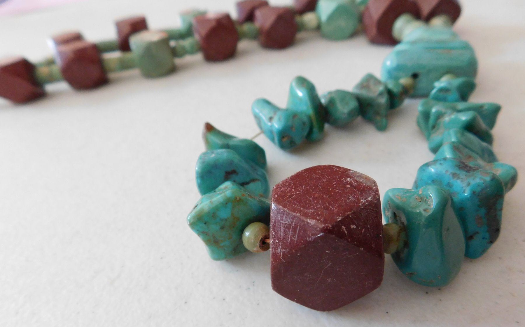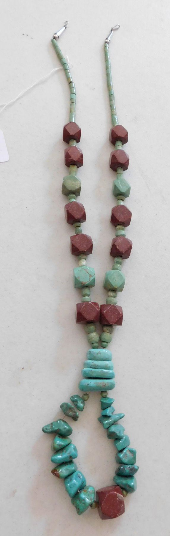 Turquoise & Pipestone Necklace, c. 1960s. Made of turquoise and pipestone, the item hangs 20" as worn, weighing approx. 297.6 grams. Arizona. Condition: Good, minor wear, see images. Shipping: $16.50 w/insurance and signature.