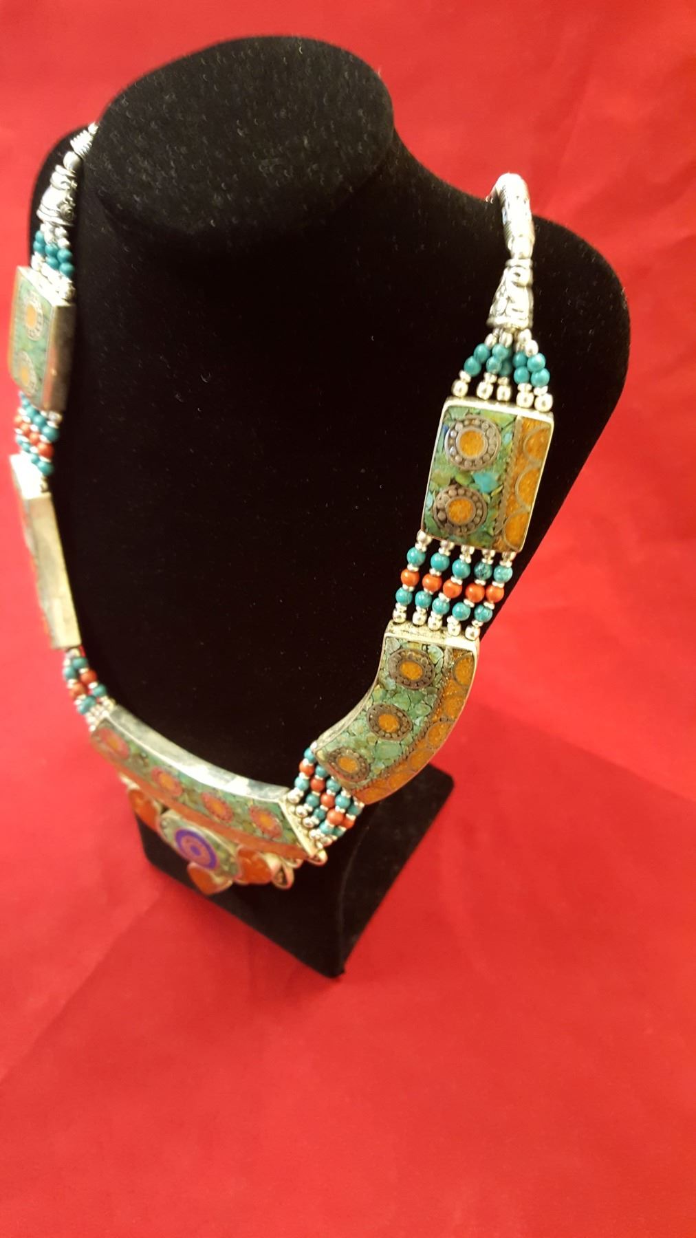 Amazing turquoise red coral and blue lapis lazuli necklace mounted in elaborately designed .925 sterling silver overlay. 18" long. Total approximately 108.1 grams.