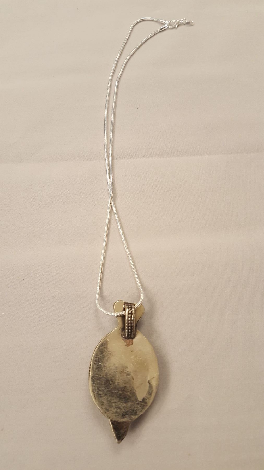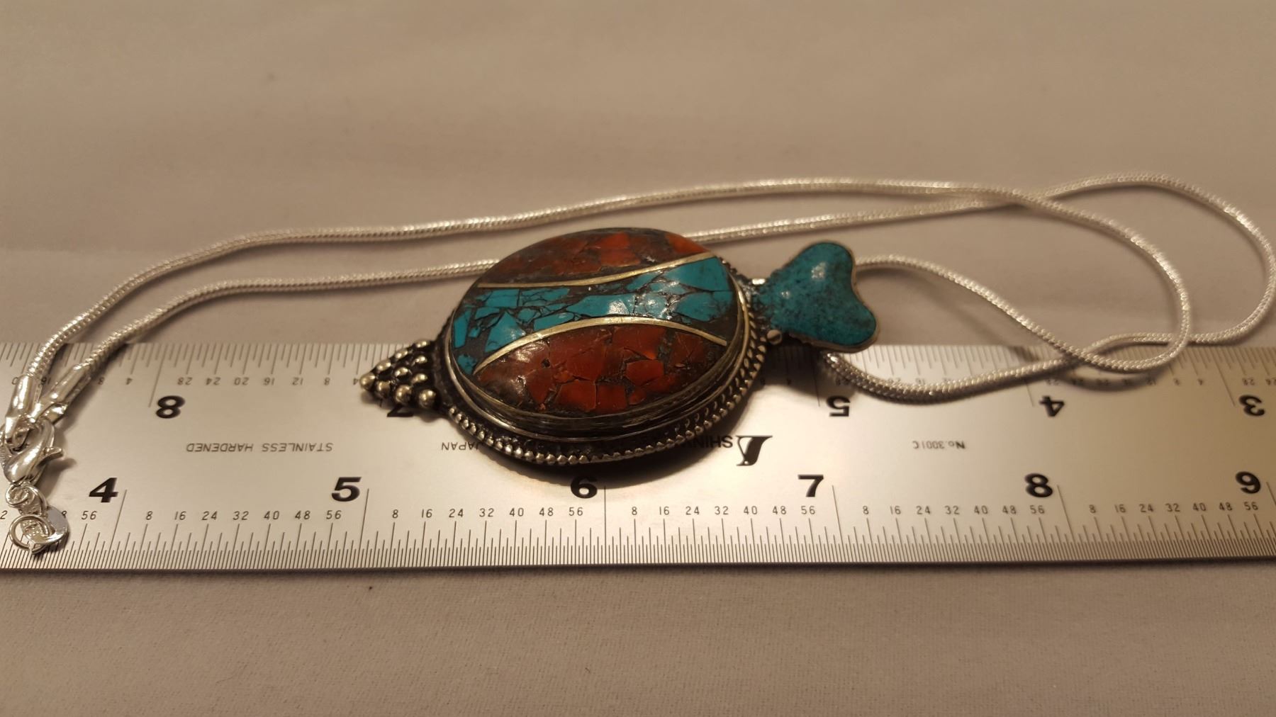 Amazing 32ct turquoise red coral and blue lapis lazuli pendant mounted in elaborately designed .925 sterling silver overlay. Incudes 20" 2 mm. chain. Total weight of this pendant is 49 grams.