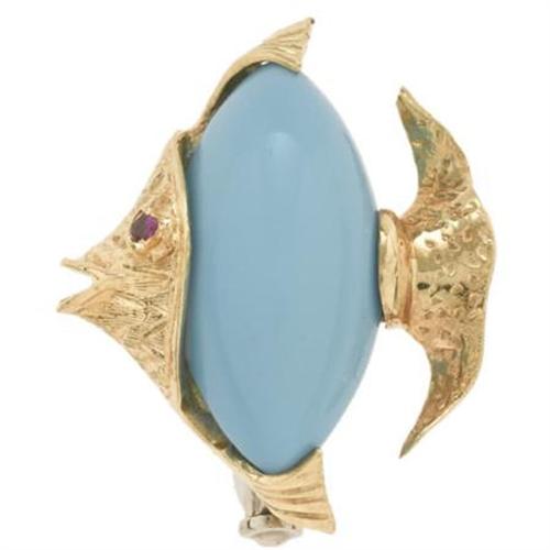 <B>Turquoise, Ruby, Gold Pin</B></I><BR><BR>The pin, designed as a fish, features a marquise-shaped turquoise cabochon, enhanced by a round-cut ruby eye, set in 18k yellow gold. Gross weight 3.40 grams. <BR><I>Dimensions: 7/8 inch x 11/16 inch</B></I> <B>Condition Report:</B> Very good condition.<BR><BR><b>Shipping:</b> Miscellaneous Collectibles, Smal (<a target="_blank" href="http://www.heritageauctions.com/common/shipping.php">view shipping information</a>)