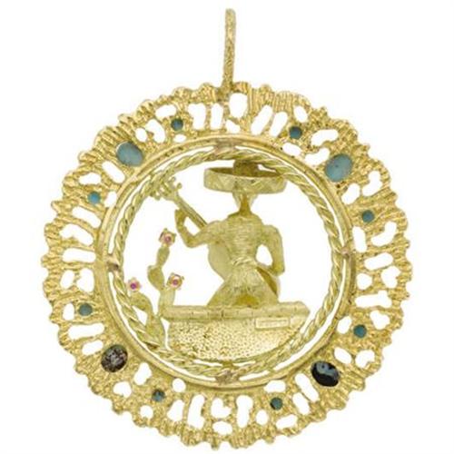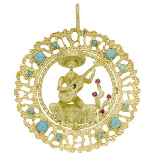 <B>Turquoise, Ruby, Gold Pendant</B></I><BR><BR>The pendant, designed as a Mariachi guitar player, features turquoise cabochons, enhanced by full-cut rubies, set in 18k yellow gold. Gross weight 28.80 grams. <BR><I>Dimensions: 2-5/8 inches x 2-1/4 inches</B></I> <B>Condition Report:</B> Very good condition.<BR><BR><b>Shipping:</b> Miscellaneous Collectibles, Smal (<a target="_blank" href="http://www.heritageauctions.com/common/shipping.php">view shipping information</a>)