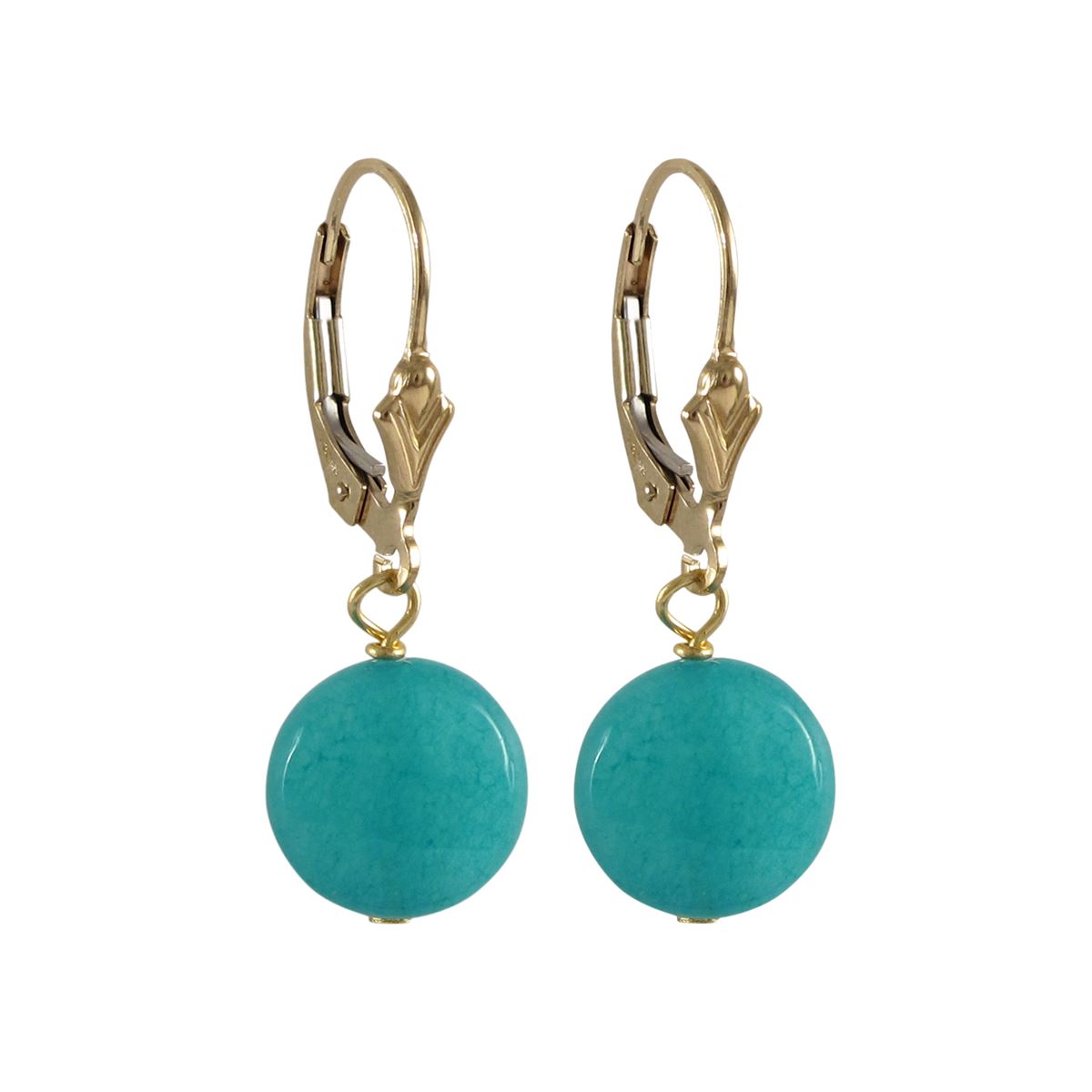 Turquoise Semi Precious 10Mm Round Flat Stone On Gold Filled Lever Back Earrings, 1.18"