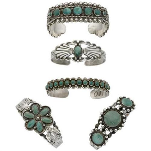 <B>Turquoise, Silver Bracelet Lot</B></I> The lot includes: one cuff, featuring a line of turquoise cabochons, bezel set in silver <I>(Dimensions: 6 inches x 1/2 inch)</B></I>; one cuff, designed as a flower, featuring oval-shaped turquoise cabochons, set in silver <I>(Dimensions: 5-3/4 inches x 1-1/4 inches)</B></I>; one cuff, featuring turquoise cabochons, graduated in size, bezel set in sterling silver accented by twisted cable <I>(Dimensions: 5-1/2 inches x 7/8 inch)</B></I>; one cuff, featuring an oval-shaped turquoise cabochon, enhanced by openwork, bezel set in silver <I>(Dimensions: 5-1/2 inches x 15/16 inch)</B></I>; together with one cuff, featuring turquoise cabochons, enhanced by half-beads, set in silver <I>(Dimensions: 6 inches x 1 inch)</B></I>. Gross weight for the lot is 156.70 grams.<I> </B></I><BR><BR><b>Shipping:</b> Miscellaneous Collectibles, Smal (<a target="_blank" href="http://www.heritageauctions.com/common/shipping.php">view shipping information</a>)
