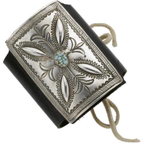 <B>Turquoise, Sterling Silver, Leather Bracelet</B></I> The bracelet features a rectangular-shaped plate, designed with a foliate motif, enhanced by an oval-shaped turquoise cabochon, set in sterling silver, stationed by a wide brown leather strap, completed by a tie. Gross weight 124.20 grams.<BR><I>Dimensions: 9-1/4 inches x 3-9/16 inches</B></I><BR><BR><b>Shipping:</b> Miscellaneous Collectibles, Smal (<a target="_blank" href="http://www.heritageauctions.com/common/shipping.php">view shipping information</a>)