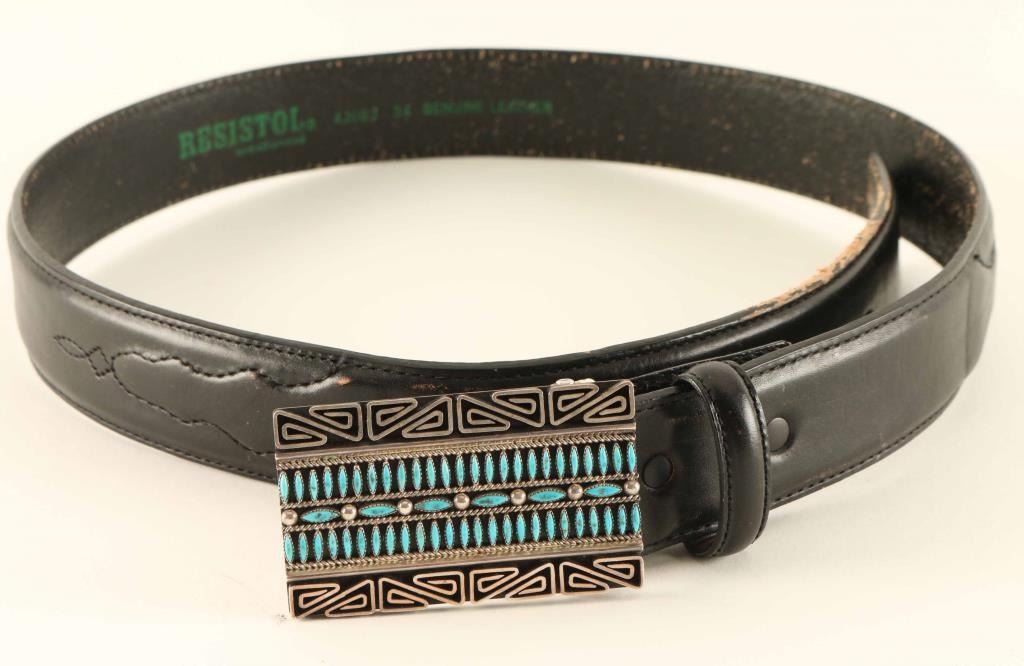Rectangular sterling silver buckle with geometric border and petit point turquoise in the middle. Measures 1 7/8" x 3" Signed by artist on back and marked 'Sterling'. Comes with smooth black leather size 34 belt that shows wear.