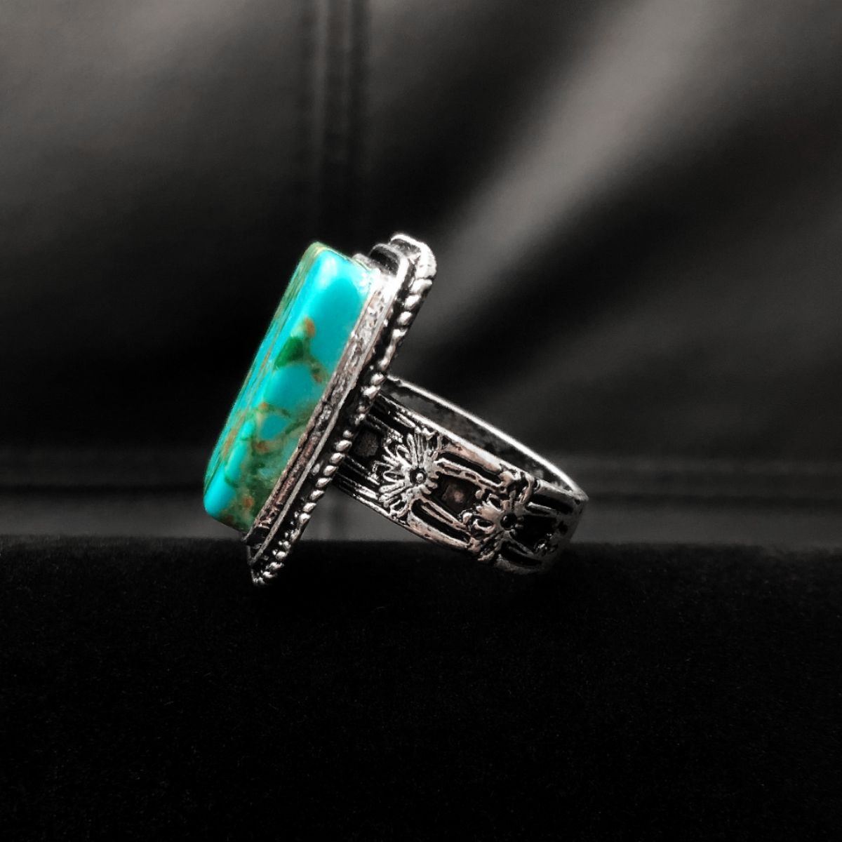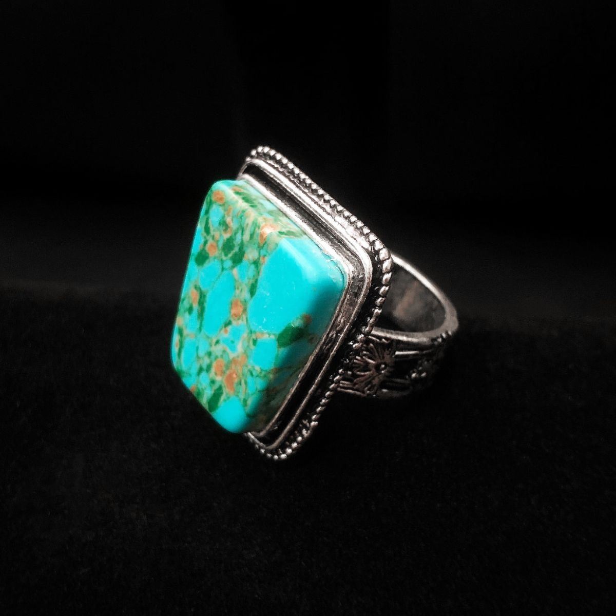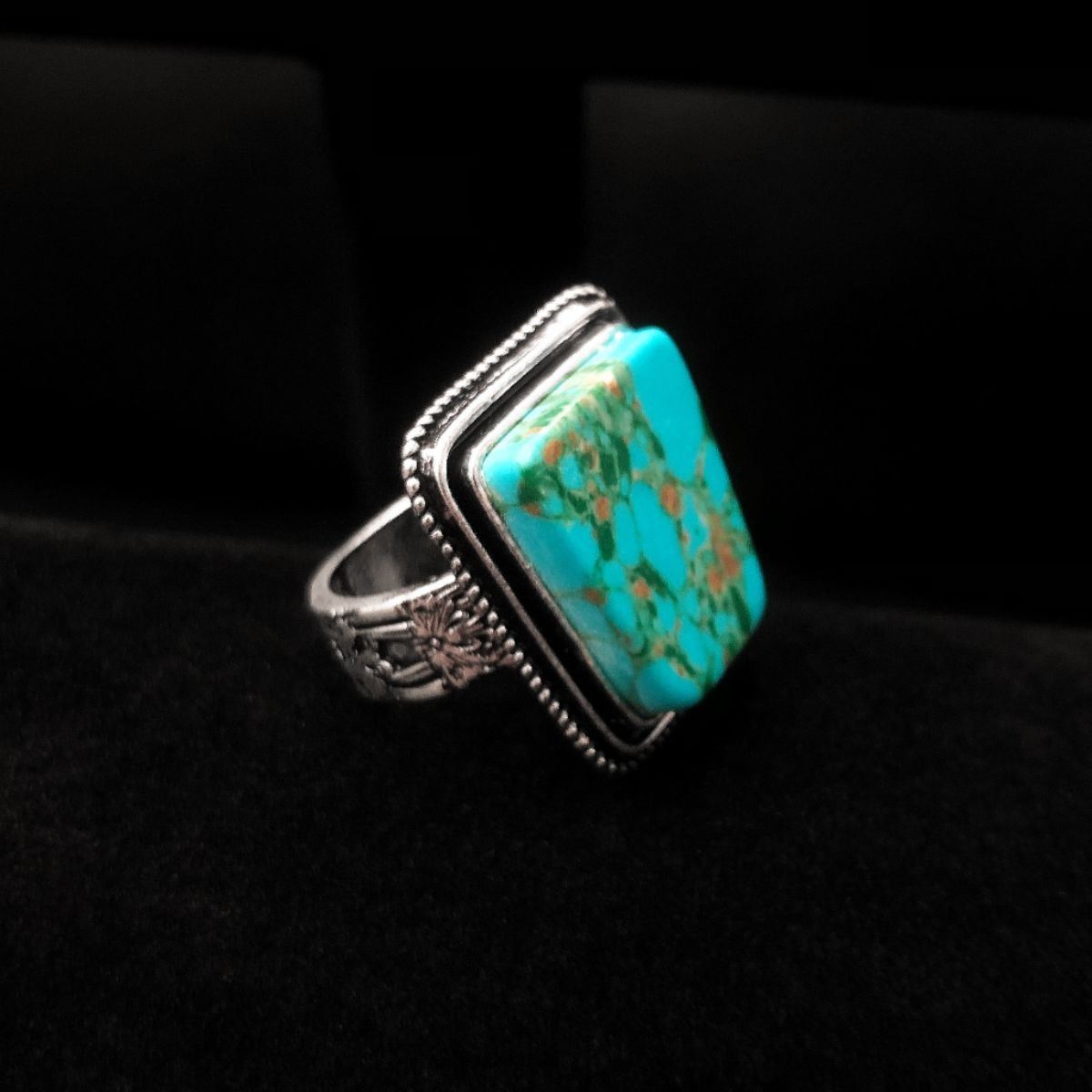 A Turquoise Square Cut Ring with Silver Fitting. See Photos For Further Details. Turquoise is a sky-blue or green translucent to opaque basic aluminum phosphate that contains copper. Turquoise has been a prized stone for varying societies. It was used by the ancient Egyptians and Aztecs as a jewelry gemstone and decorative stone. King Tutankhamun's burial mask and tomb was inlaid with turquoise. The ancient Egyptians believed that the color blue was a symbol of regeneration, so turquoise was treasured for both decorative and superstitious purposes. The Mesoamericans created turquoise mosaics and the Chinese carved turquoise into ornaments. Turquoise was also used by Native Americans in works of art and jewelry, some of whom believed that it possessed protective properties. The Tibetans believe in the healing properties of turquoise and have valued turquoise jewelry for centuries.