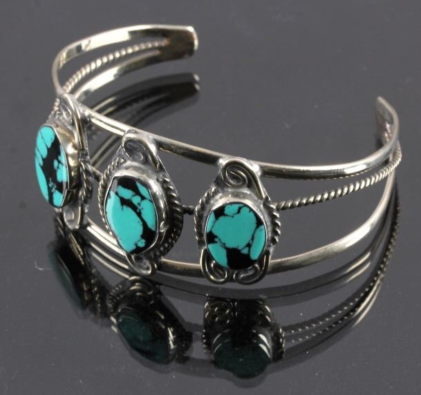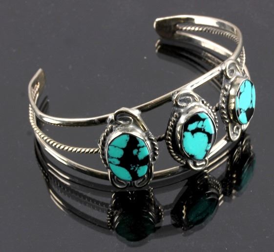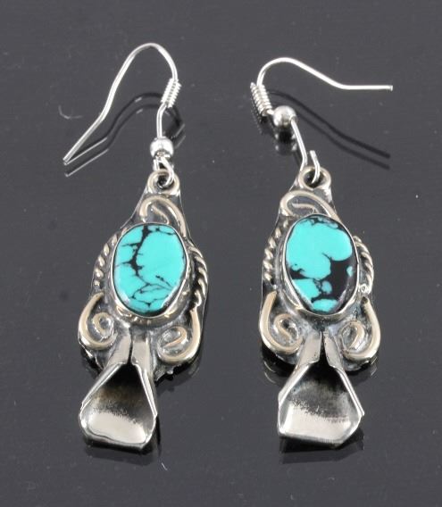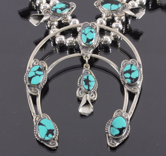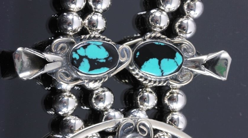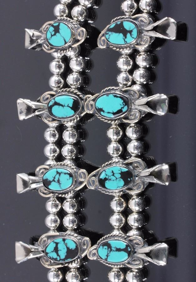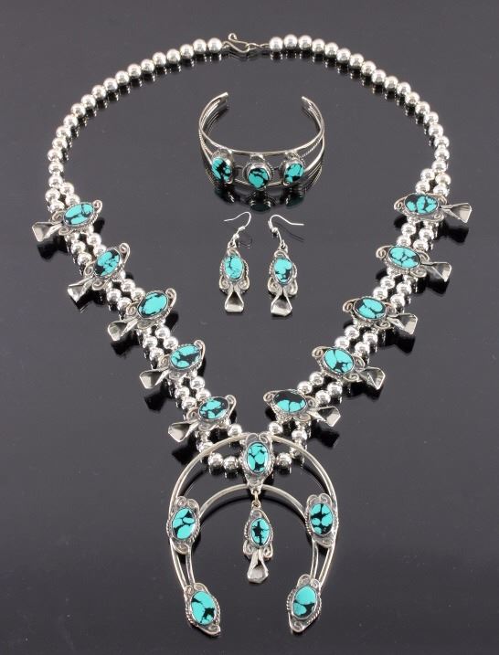This is a silver and turquoise squash blossom, bracelet and earrings. This is a matched set with beautiful stone and excellent workmanship. They are all in good condition. The squash blossom naja measures 3.25" x 4" and the necklace is 24" long. Silver not tested.