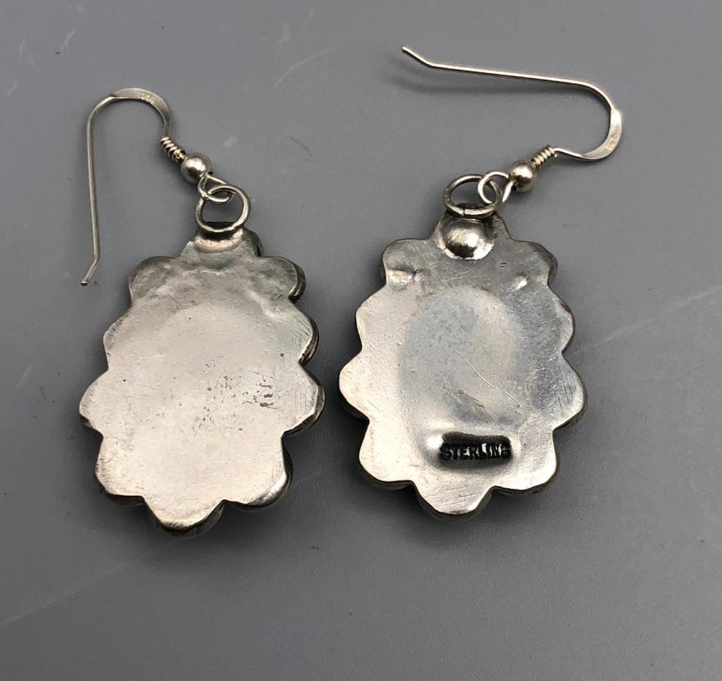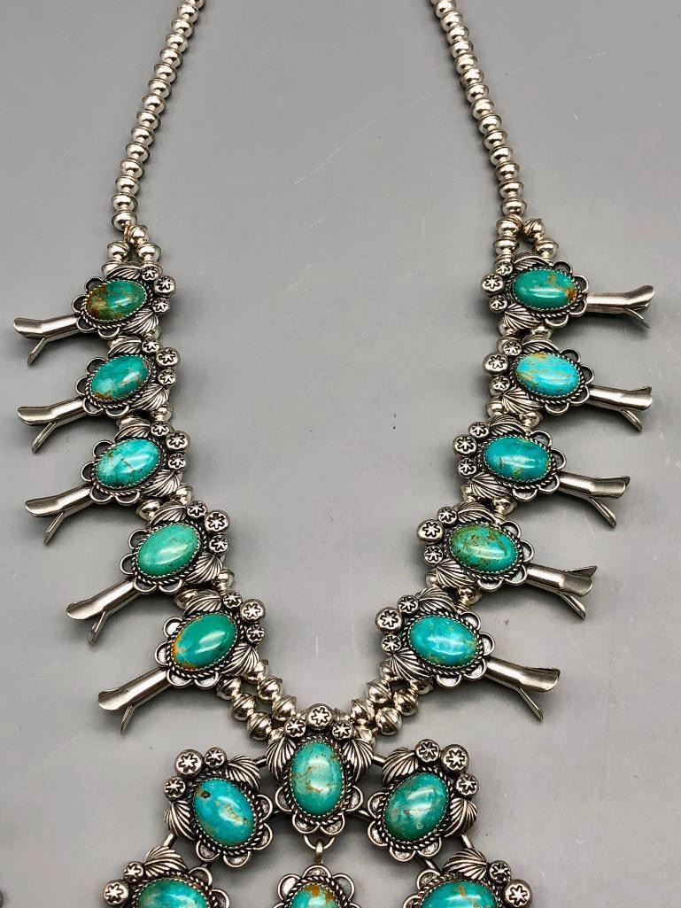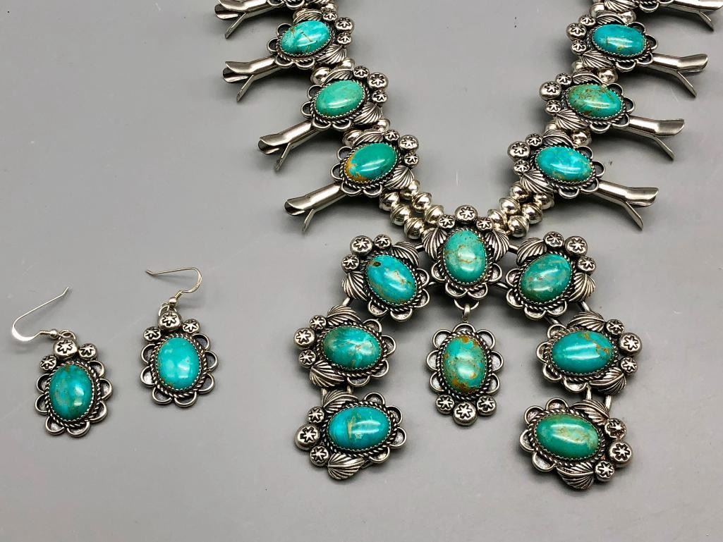 Presented for sale in this lot is a turquoise squash blossom necklace set featuring beautiful blue/green turquoise cabochons. The earrings and necklace have decorative hand stamped silver dots with leaf applique. It is strung on foxtail chain and is stamped as sterling. MAKER: Hallmarked Kenny Ray McNeilley Jr. (Anglo). APPROX AGE: Modern. SIZE: Measures 28 inches end to end. Pendant measures 3-1/2 inches long X 4 inches wide. Earrings measure 1-3/8 inches long X 7/8 inches wide. Weighs 263 grams. CONDITION: Good for its age, normal wear expected. Please look closely at the pictures as they are an important part of our description and are hereby incorporated into the description, specifically with regards to condition. SHIPPING: There will be a $5 handling / packaging fee for shipping this lot. The actual cost of postage will be added on top of that. BUY IT NOW: If you would like to buy this item now, without waiting for the auction day to bid on it, we do offer this option (which is available up to 48 hours before the actual auction starts). The “Buy it Now” price is the high estimate of this lot (plus applicable fees and the Buyer's premium is discounted to 10% when using the Buy it Now option). If you would like to exercise this option, you must contact us by email (or phone as long as you talk to someone live). Reference this lot number and your intention to "Buy it Now."