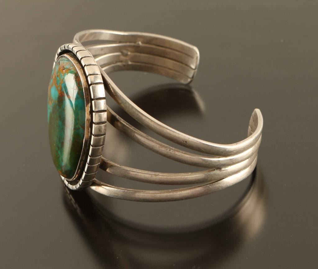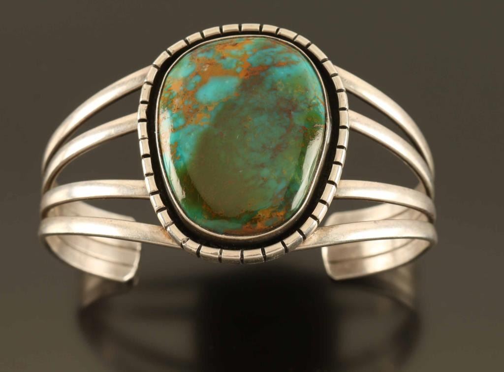 Center 1 3/8" x 1 1/8" of mossy green, blue and brown turquoise set in sterling silver. Signed 'G. Stewart' and 'Sterling'. Size 8 1/2