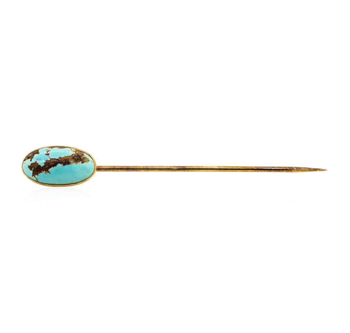 One stick pin featuring: 14KT rose gold weighing 2.4 grams containing one oval cabochon cut turquoise measuring approximately 15.50mm x 8.30mm.