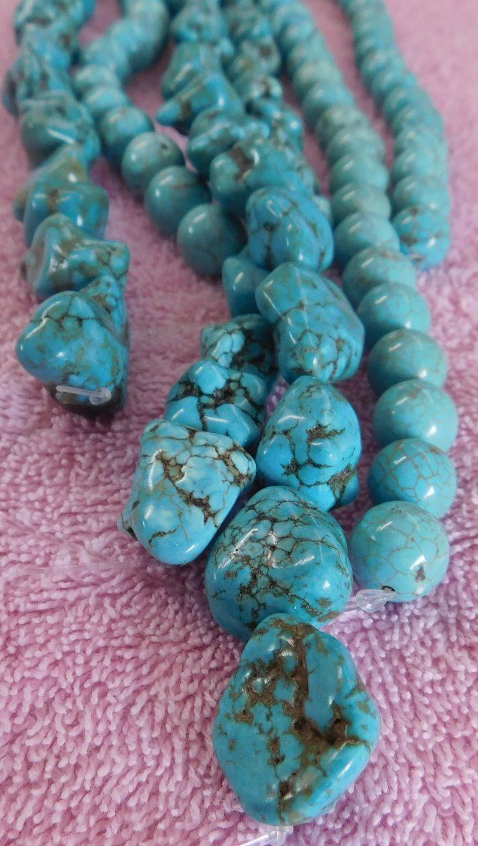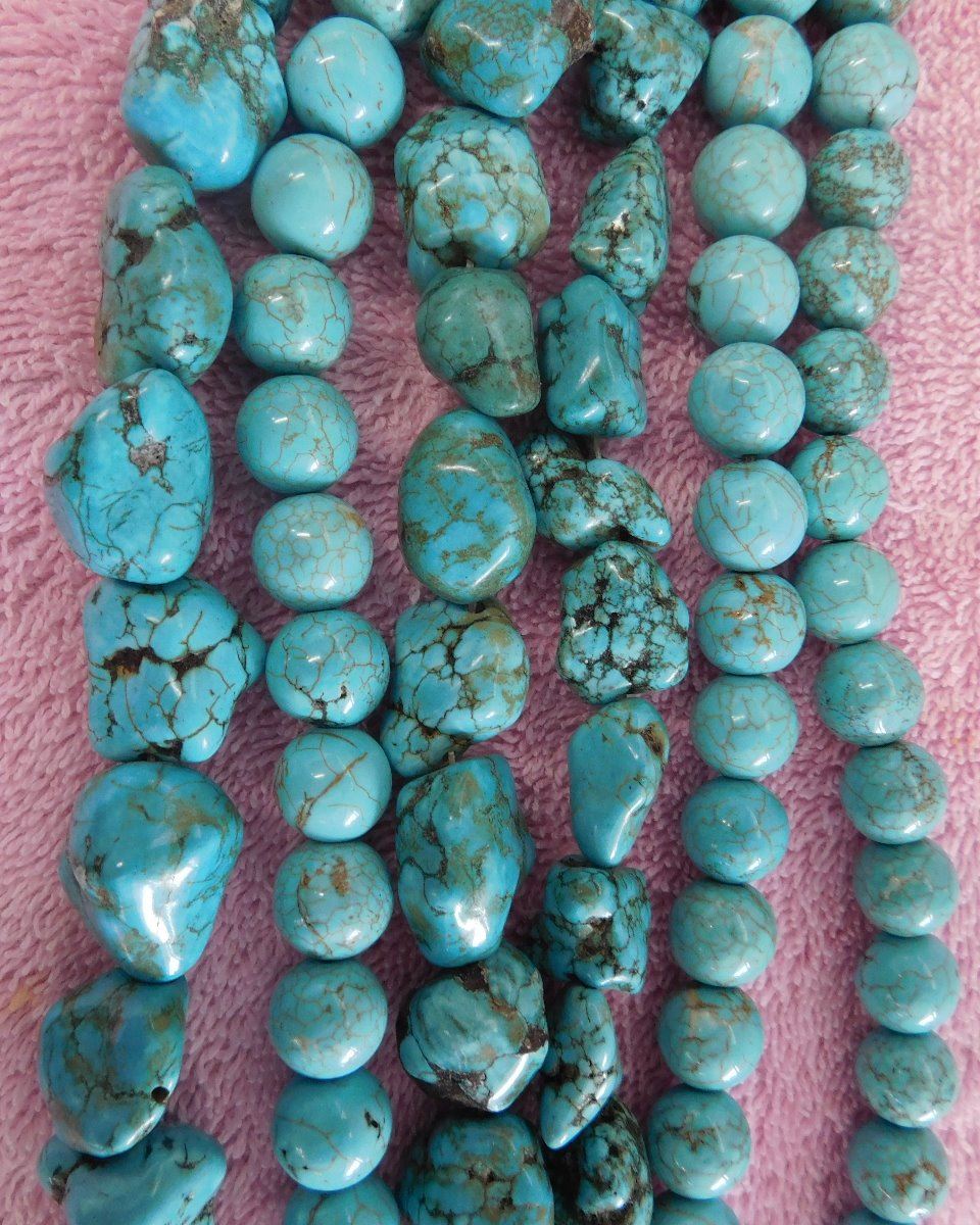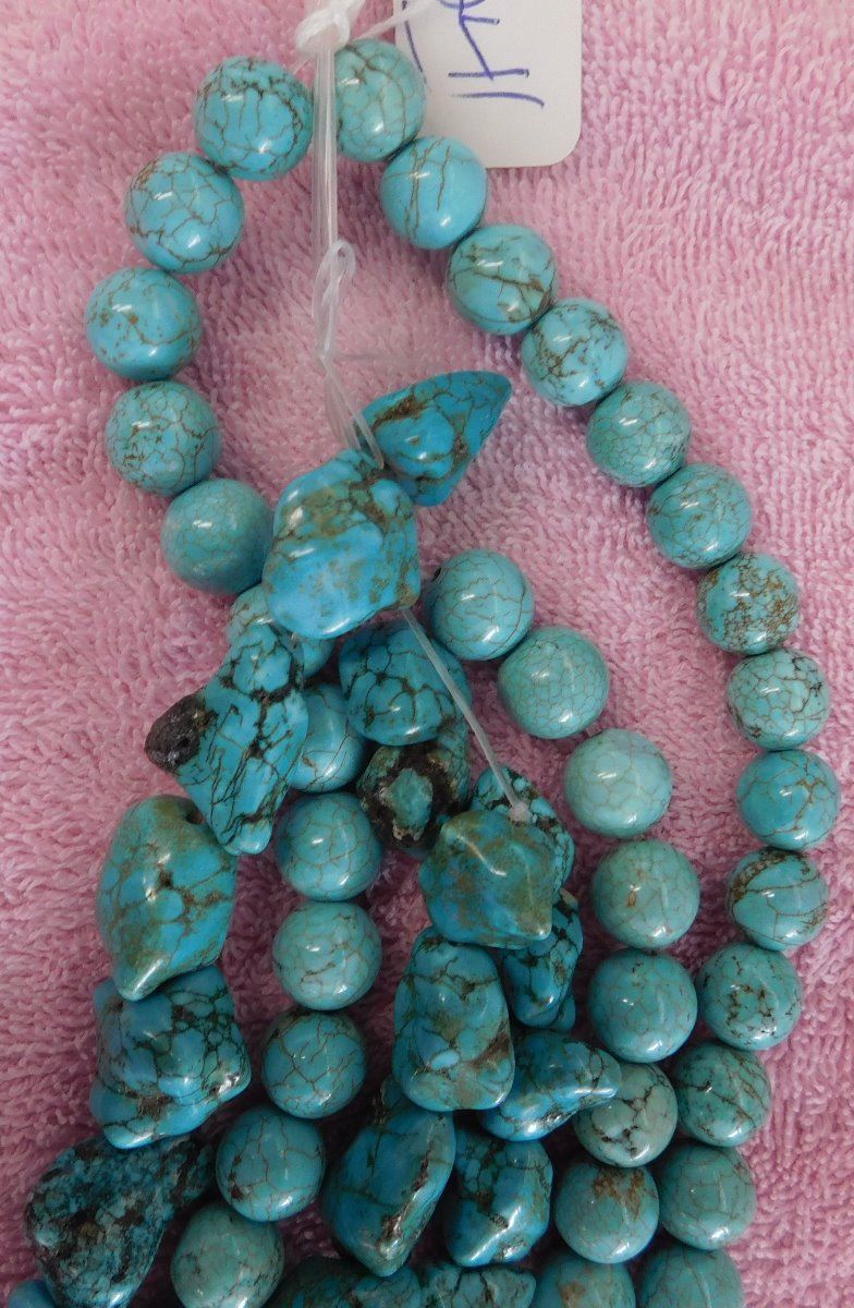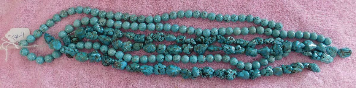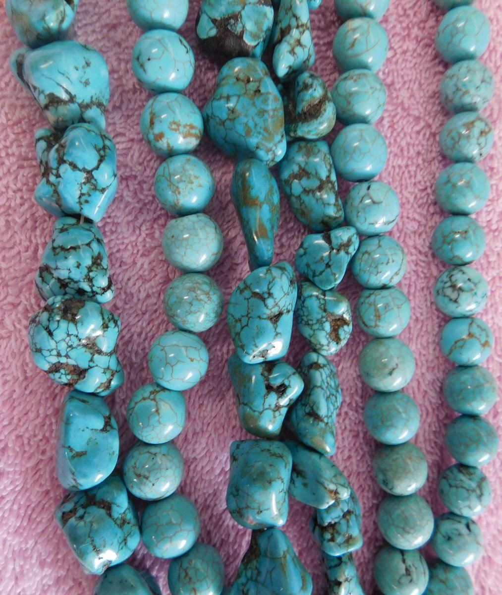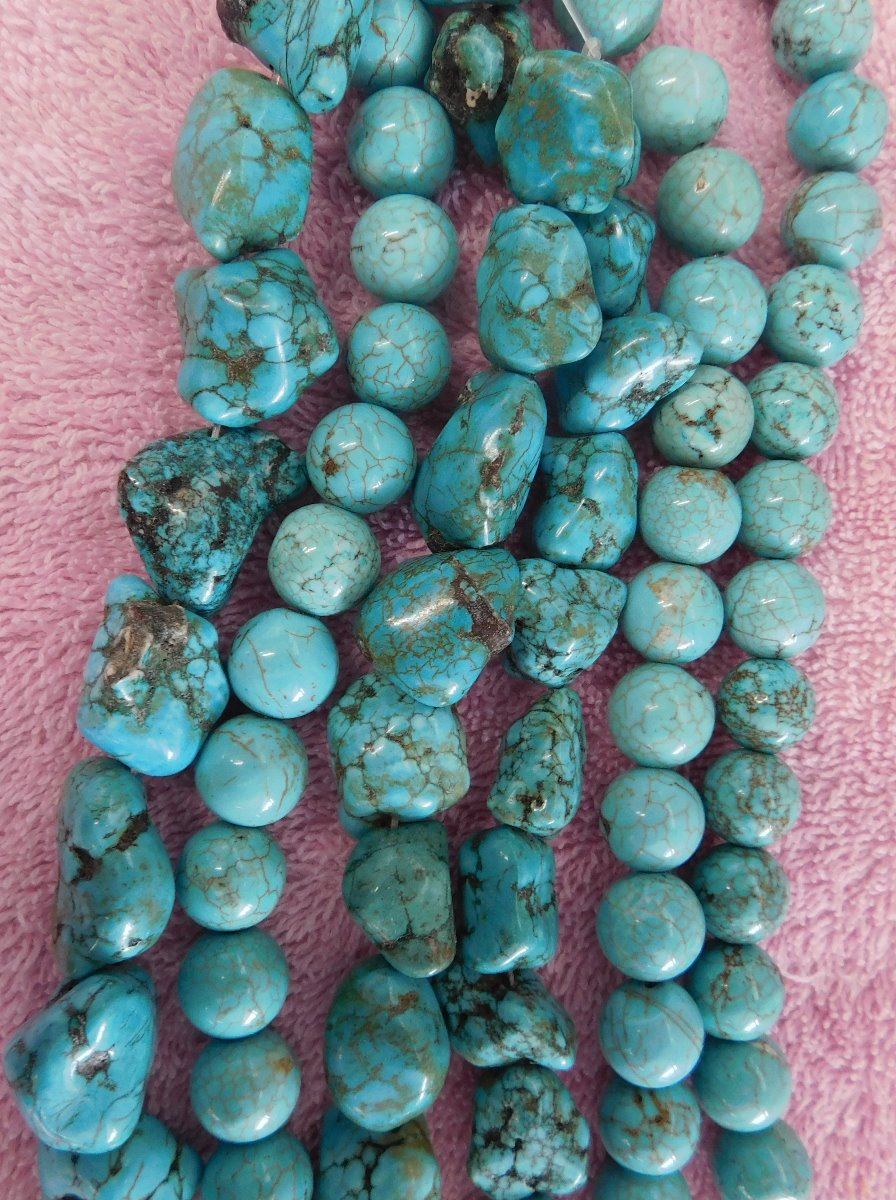 Turquoise & Stone Beads, circa 1960s. Made of turquoise and colored stone, the items are approx. 0.5" each and the strands are about 18" long. From New Mexico. Nice size, good color beads. Condition: Good, see images. Shipping: $16.50 w/insurance and signature.