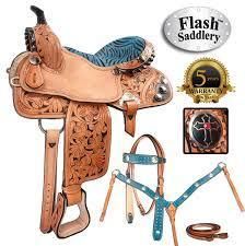 100% Premium Leather Padded Blue Zebra Hair On Hide Seat Black & Red Cross Conchos Rough Out Seat Jockey Hand Painted Black Inlay Leather Wrapped Stirrups Blevins Buckles Well Padded Soft Fleece Underside Well Balanced Fiberglass and Wood Reinforced Tree Saddle Measurements: Gullet: 6.5 Semi-QH Bars Seat: 16 Skirt: 25.5 Horn: 3 Swell: 12.5 Cantle: 4.5 deep Stirrups: 30-38 with room for adjustments. Weight: 25 lbs.