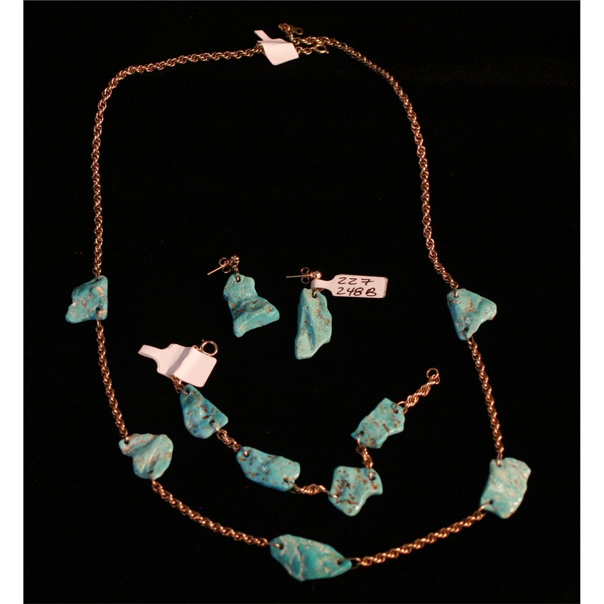 Turquoise and 14k 3pc. Set, Necklace consisting of 5 nuggets on gold plated chain 24" long, Bracelet with 4 nuggets 6-3/4", Pair earrings, -227248-227248a-227248b-