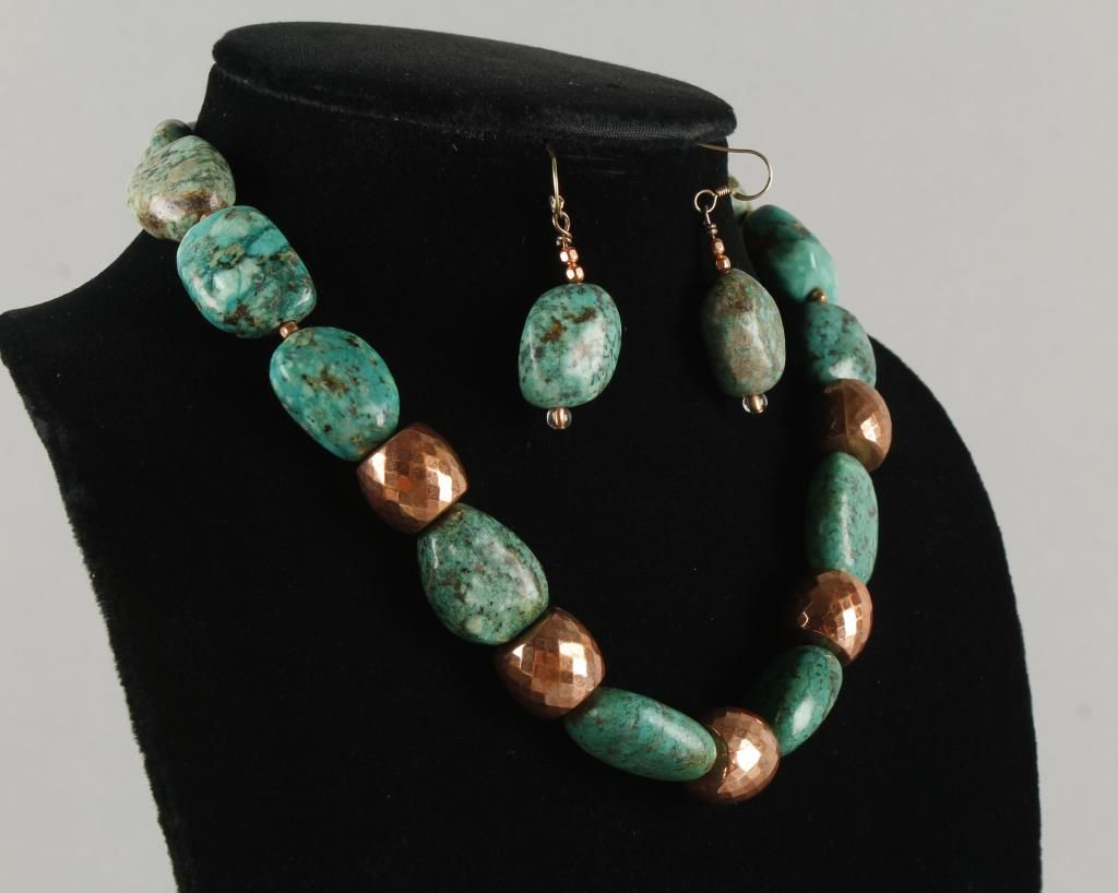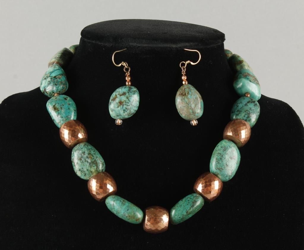 Entitled "Coppers Gift" by Two Feathers with matching earrings. Beautiful natural African turquoise with faceted copper beads, copper bindings and closure.
