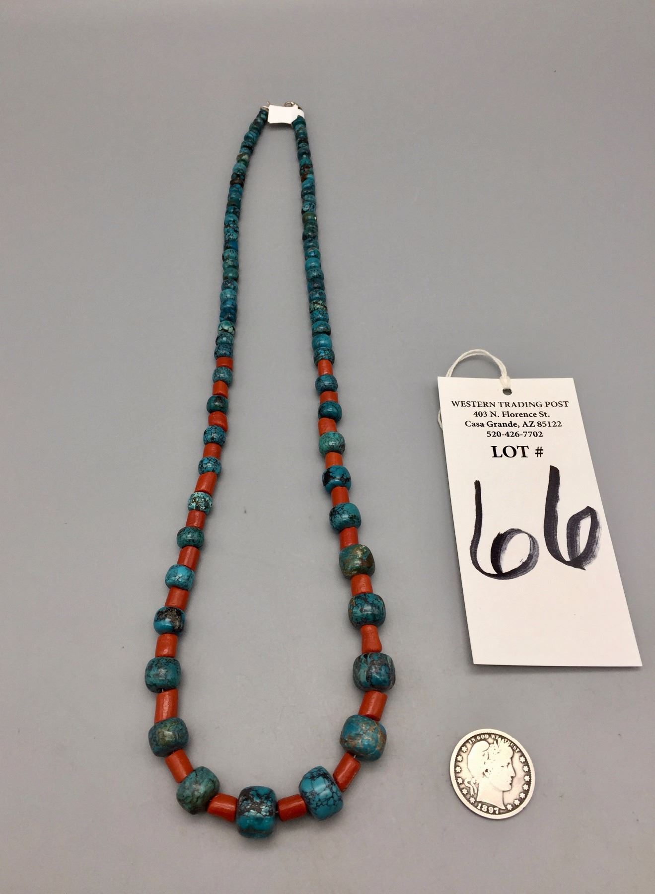 Maker: Unknown. Approx. Age: Fairly modern. Size: Measures 26” around the neck and weighs 64.6 g. Additional Info: Spiderweb turquoise and coral beads with sterling findings. Condition: Good, normal wear expected. Please look closely at the pictures - they are an important part of our description. Shipping: There will be a $5 handling / packaging fee for shipping this lot. The actual cost of postage will be added on top of that.