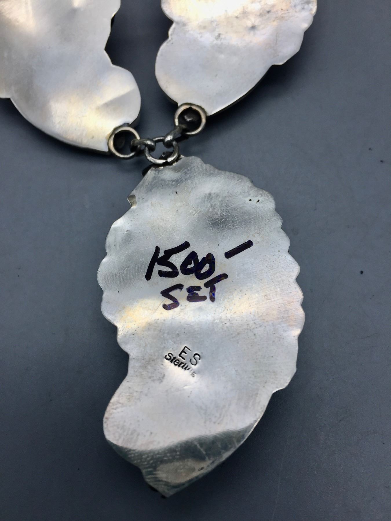 Description: Presented for sale in this lot is a turquoise and coral bear claw (faux claws) necklace and earrings set featuring sterling silver appliqué. Maker: Hallmarked ES. Approx. Age: Modern. Size: Fits a 22-3/4” neck. Pendant measures 1-3/8”w x 2-1/4” tall. Earrings 1-3/8”w x 2-1/2”long. Weighs 78.2 grams. Condition: Good. Please look closely at the pictures - they are an important part of our description. Shipping: There will be a $5 handling / packaging fee for shipping this lot. The actual cost of postage will be added on top of that.