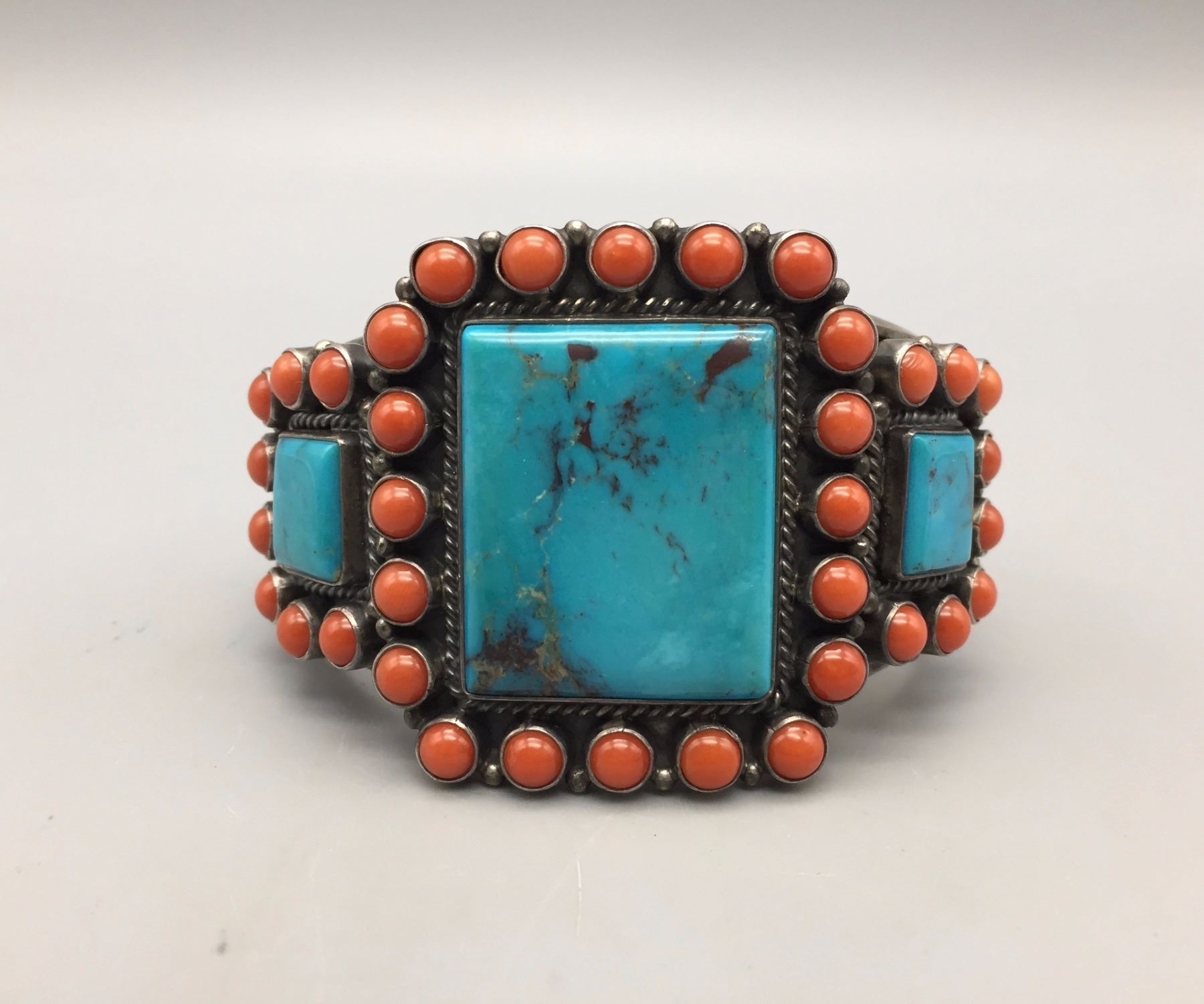Description: Nice turquoise and coral statement bracelet by Kirk Smith. Maker: Hallmarked by Kirk Smith and Sterling. Approx. Age: Circa 1990s. Size: Inside circumference measures approx. 5" with a 1 1/4” gap (making this bracelet fit about a 6 1/4” wrist). It is 1 3/4” wide across the face and weighs 115.5 g. Condition: Good for its age, normal wear expected. Please look closely at the pictures - they are an important part of our description. Shipping: There will be a $5 handling / packaging fee for shipping this lot. The actual cost of postage will be added on top of that.