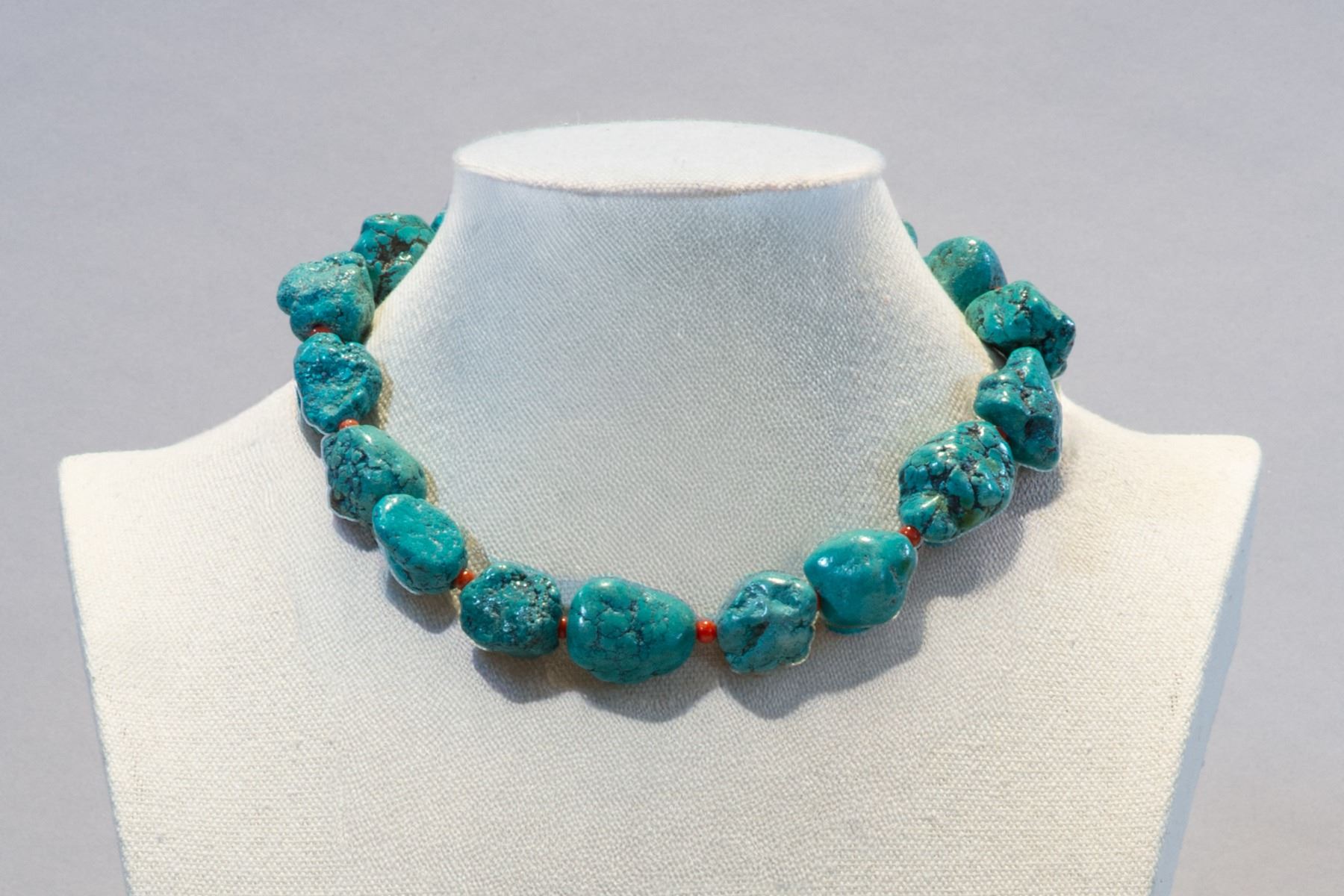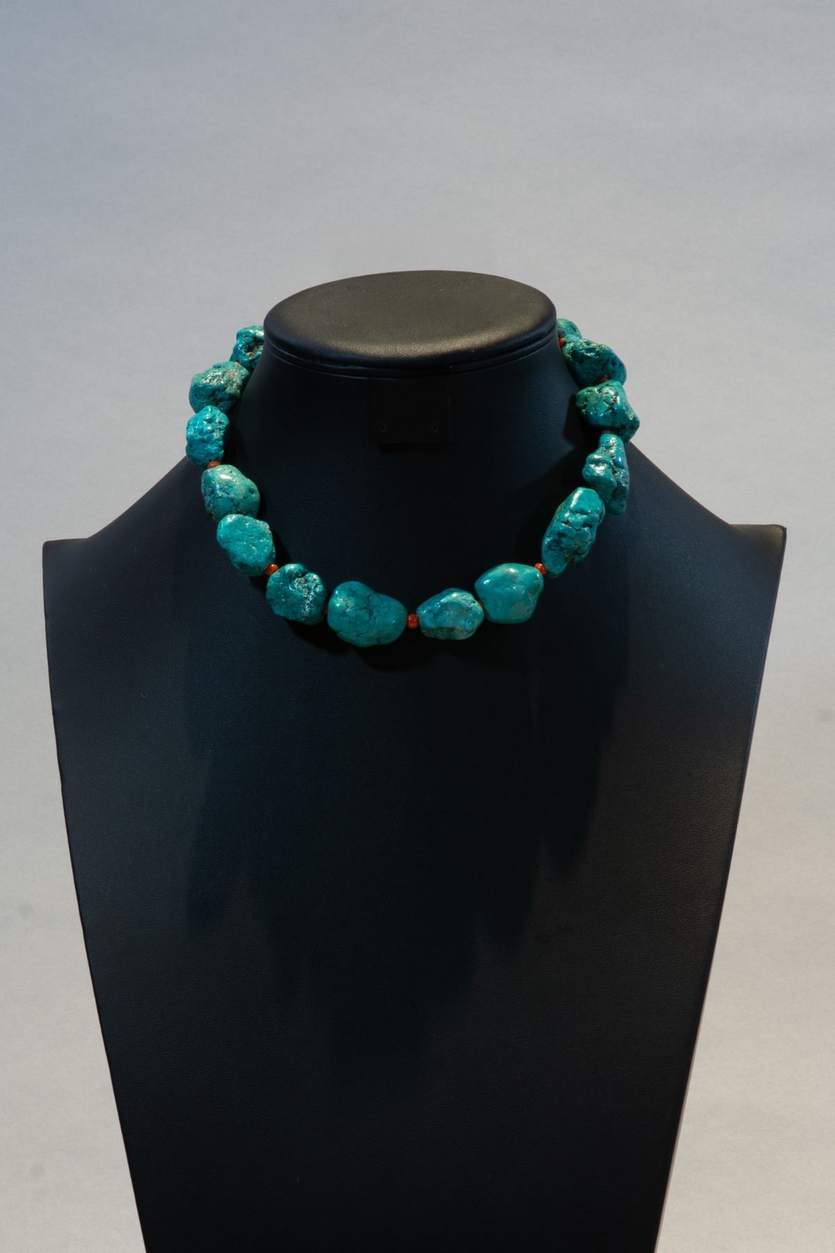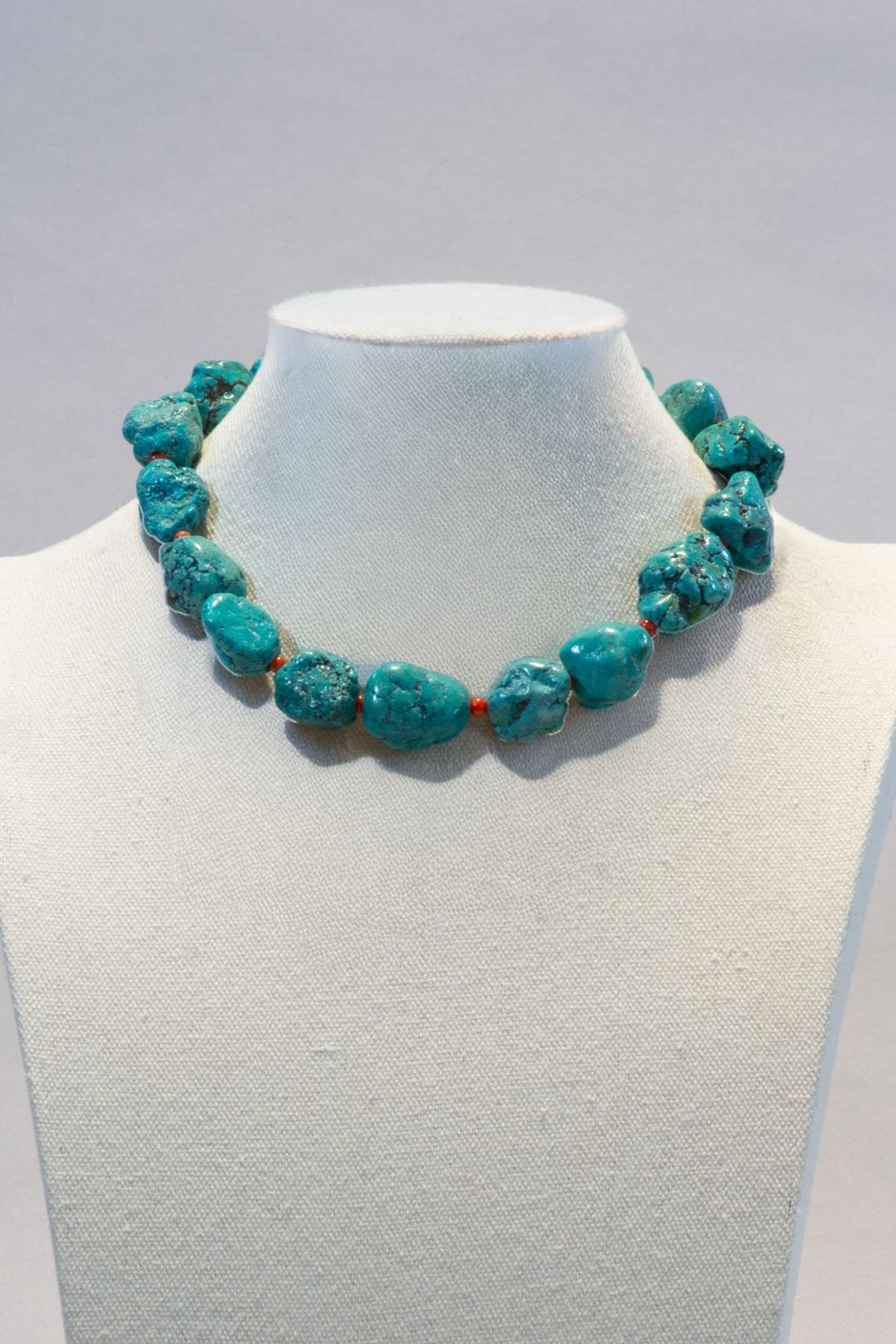 These fifteen rough turquoise stones, each approximately 3/4", are complimented by 16 small, polished coral beads.