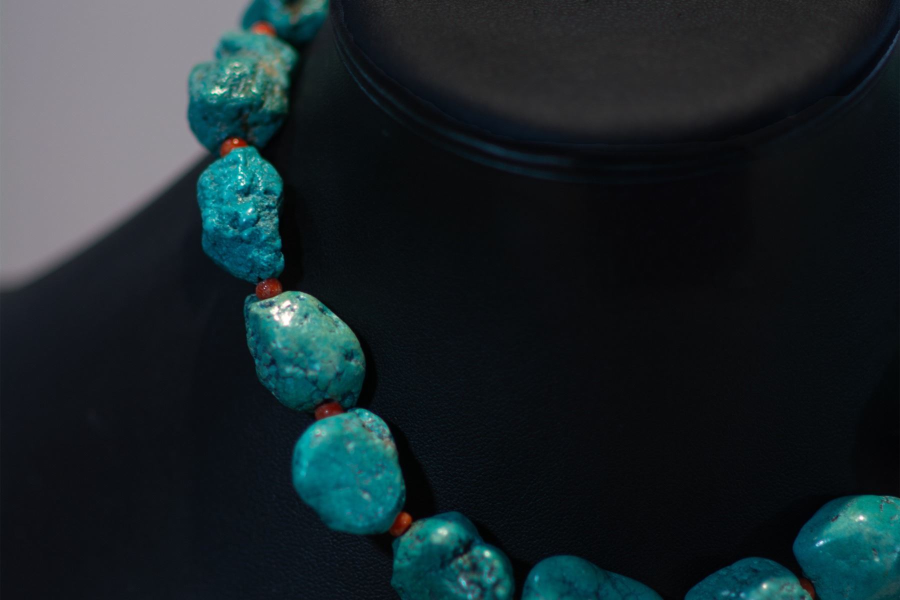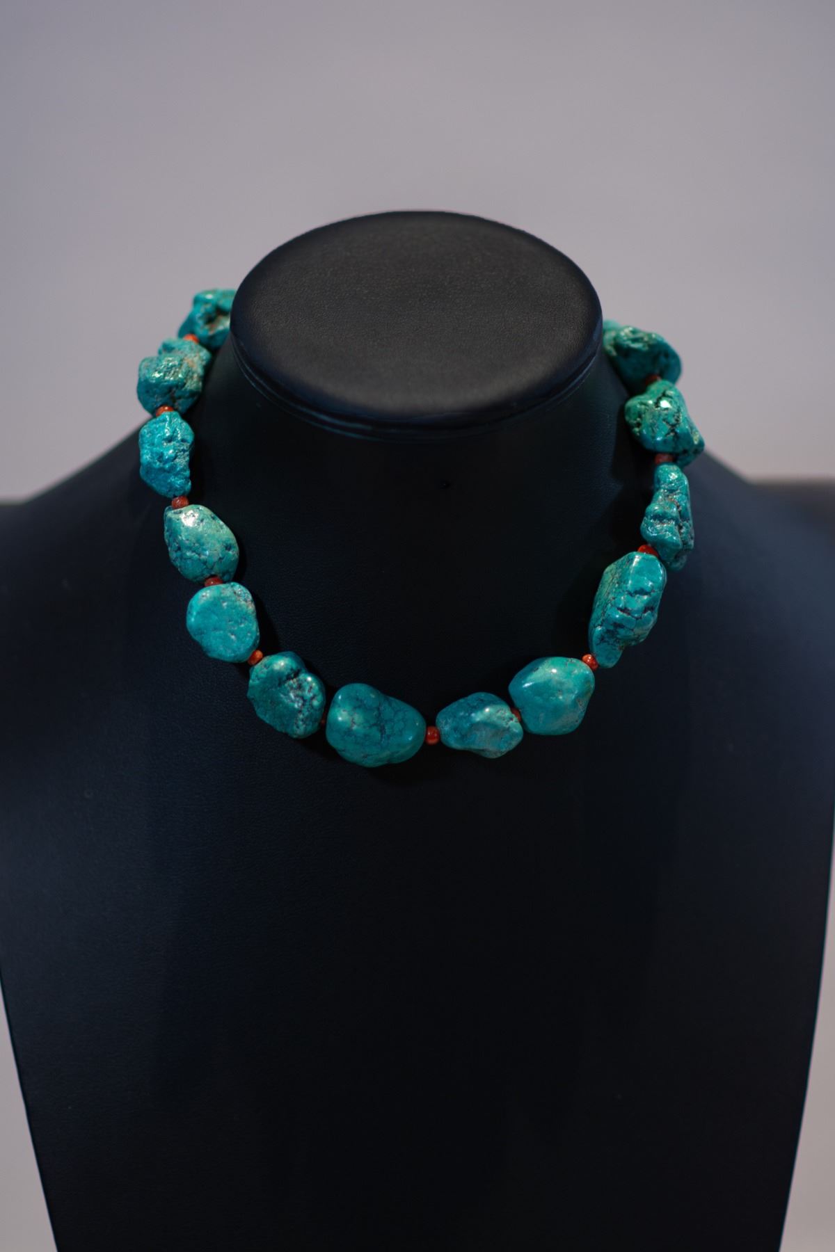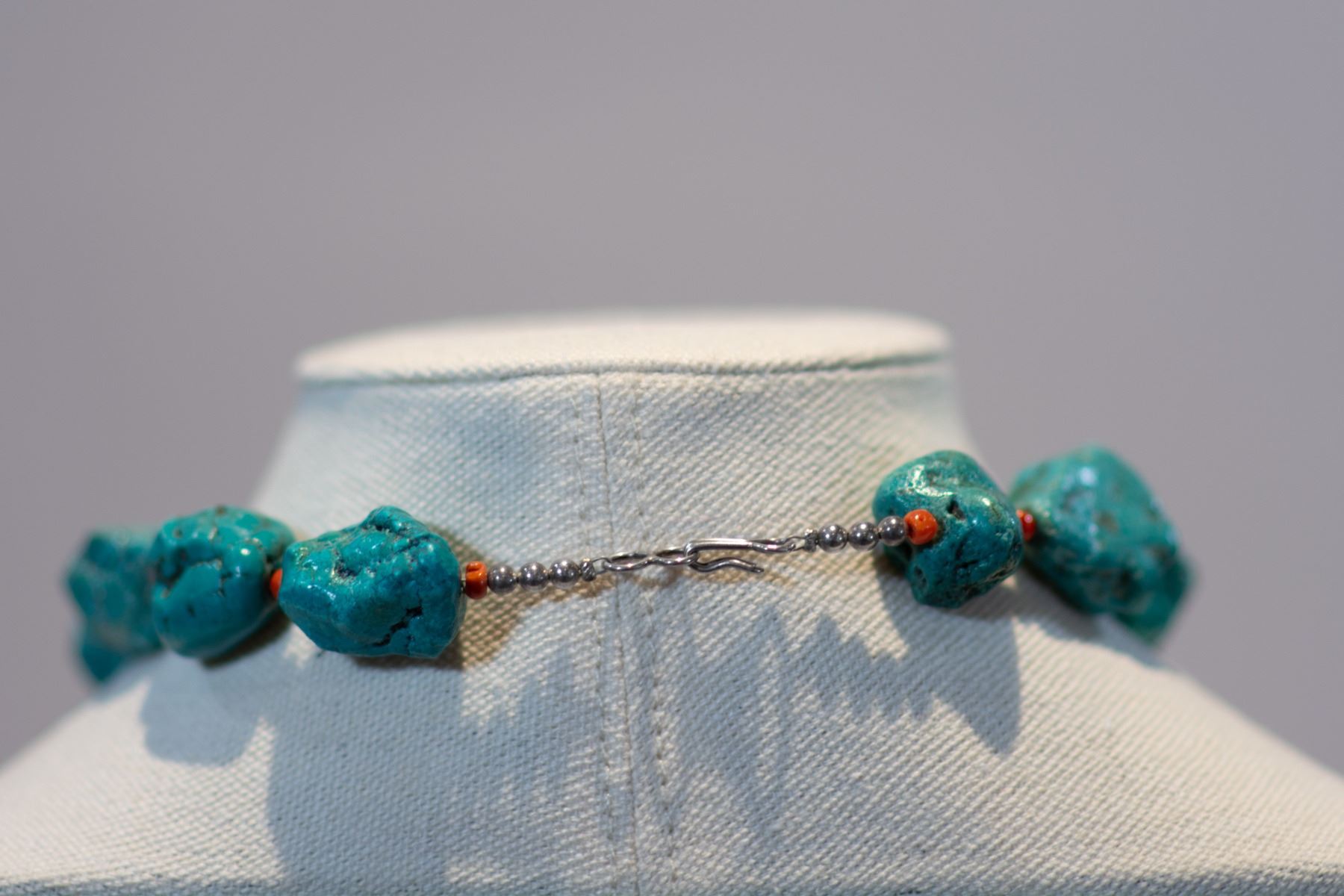 Hand-strung choker necklace featuring natural, uncut turquoise stones and small coral beads.