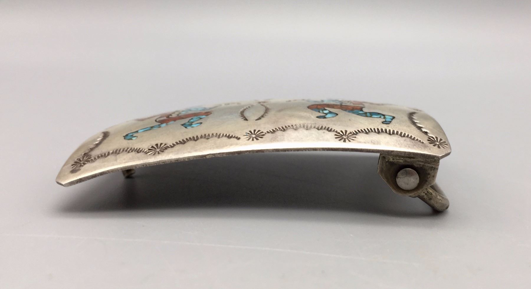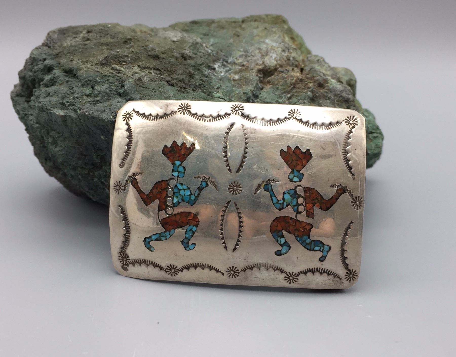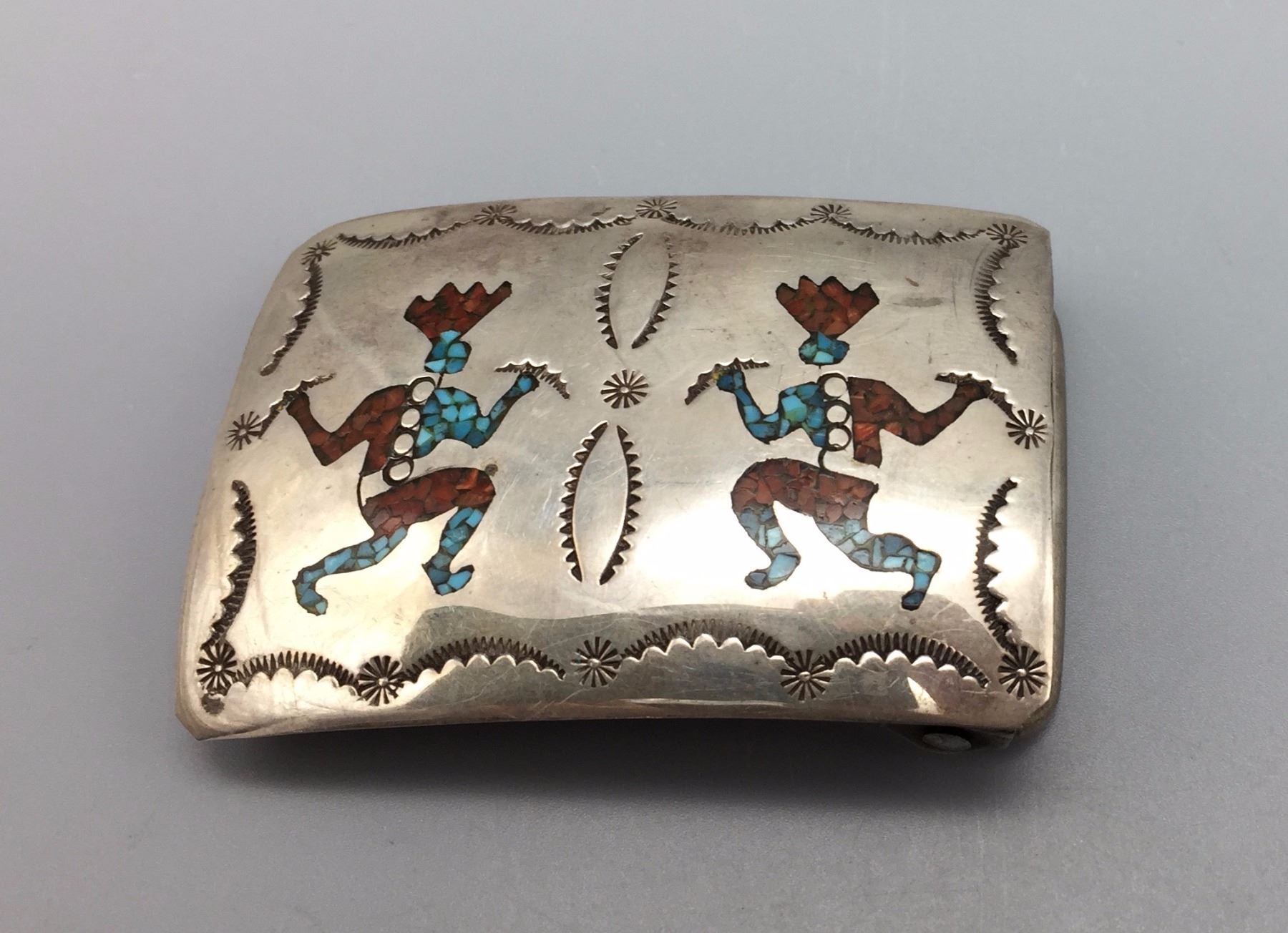 Maker: Unknown, vintage Navajo style. Approx. Age: Circa 1970s. Size: Buckle measures 2 5.8” w x 1 7/8” h and fits a 1 1/2” belt or smaller belt. Weighs 37.5 g. Additional Info: A sterling silver buckle with turquoise and coral chip inlay designs. Condition: Good for it’s age, normal wear expected. Please look closely at the pictures - they are an important part of our description. Shipping: There will be a $5 handling / packaging fee for shipping this lot. The actual cost of postage will be added on top of that.