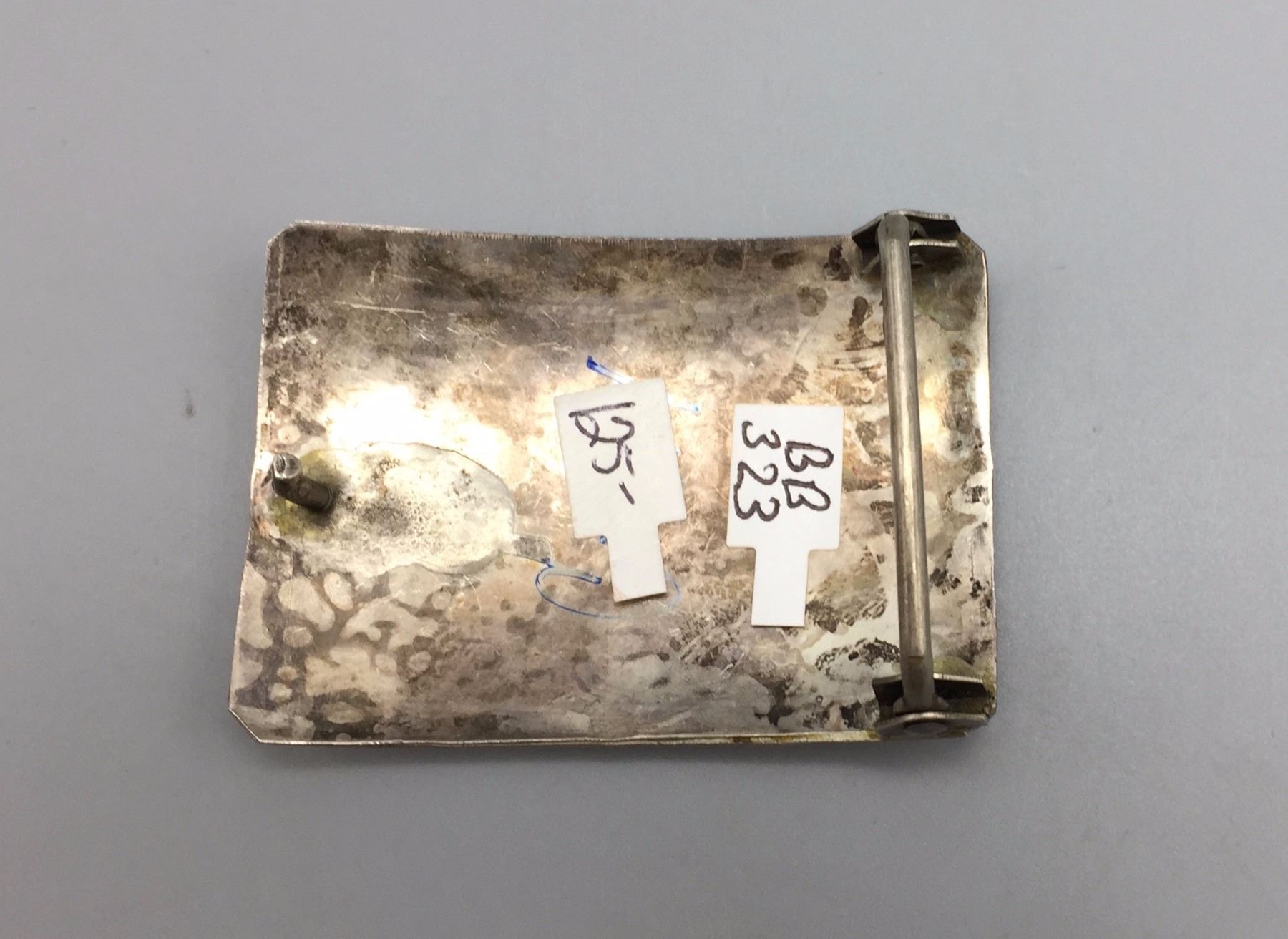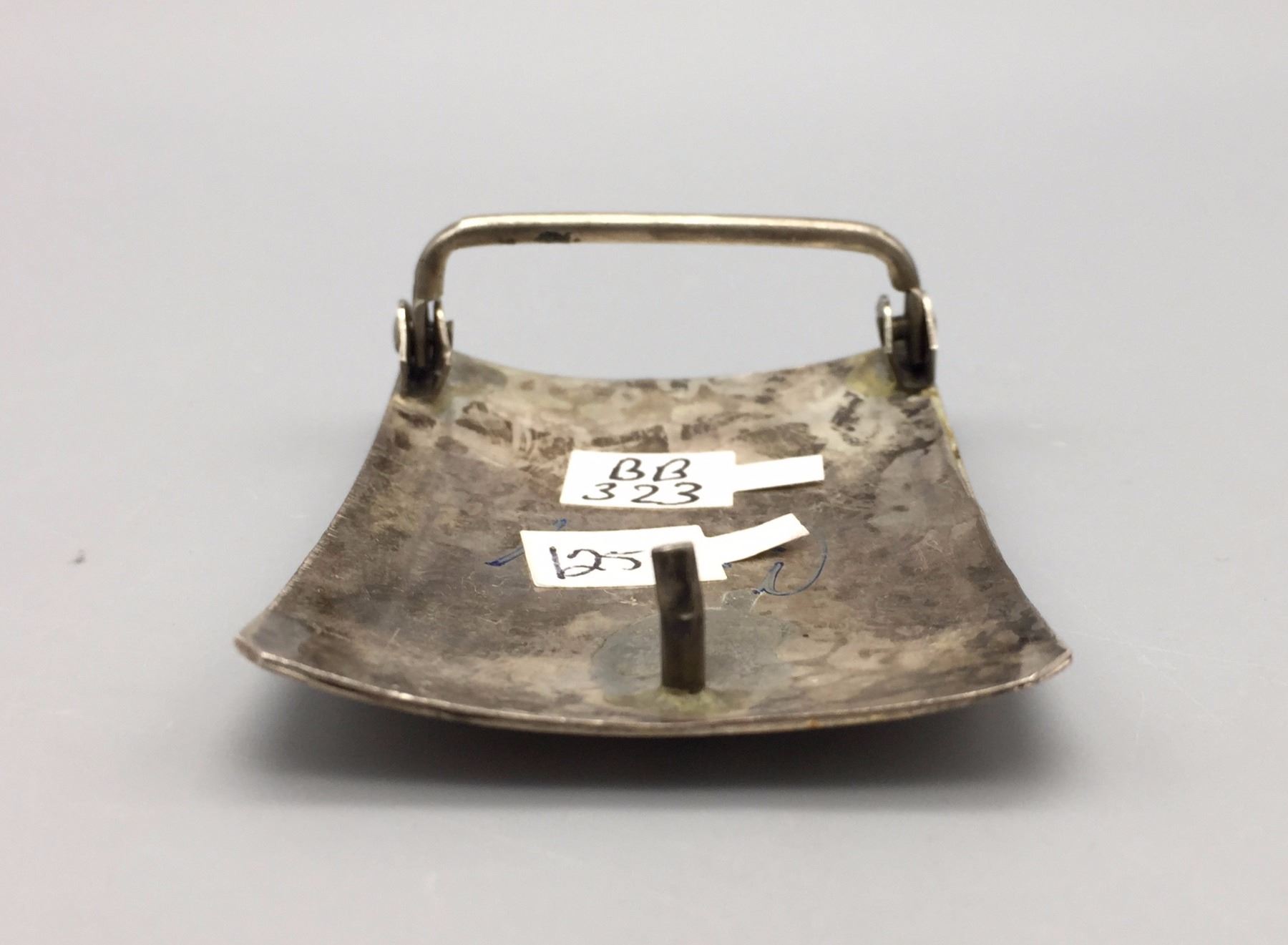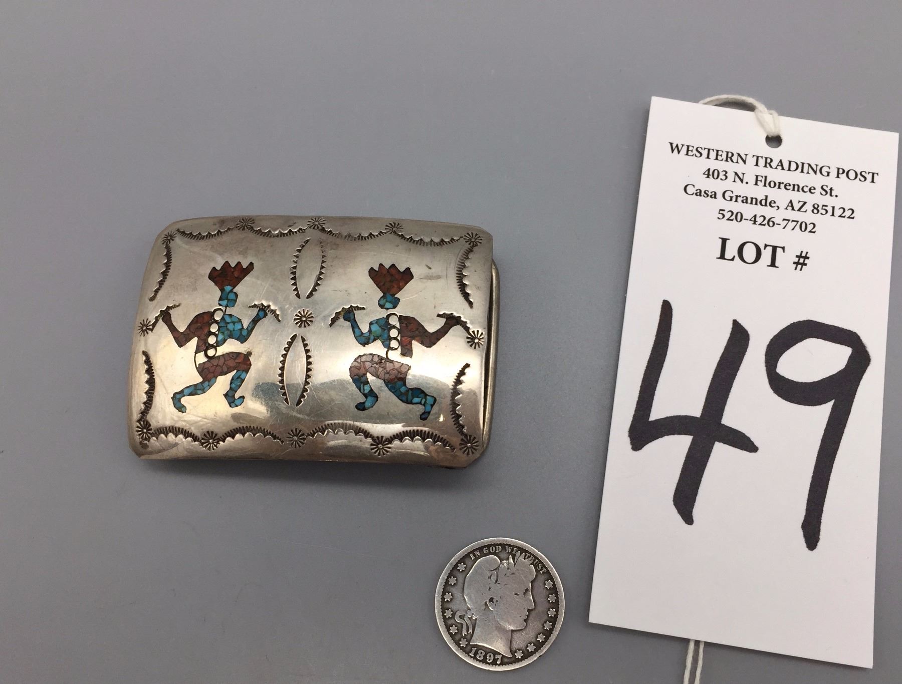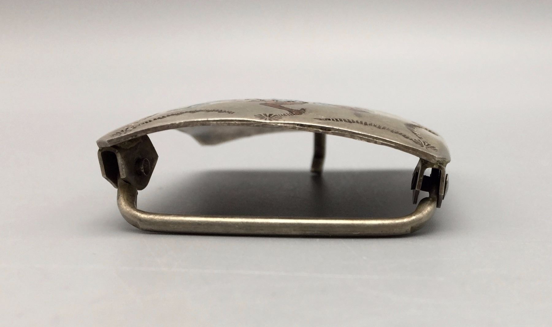Maker: Unknown, vintage Navajo style. Approx. Age: Circa 1970s. Size: Buckle measures 2 5.8” w x 1 7/8” h and fits a 1 1/2” belt or smaller belt. Weighs 37.5 g. Additional Info: A sterling silver buckle with turquoise and coral chip inlay designs. Condition: Good for it’s age, normal wear expected. Please look closely at the pictures - they are an important part of our description. Shipping: There will be a $5 handling / packaging fee for shipping this lot. The actual cost of postage will be added on top of that.