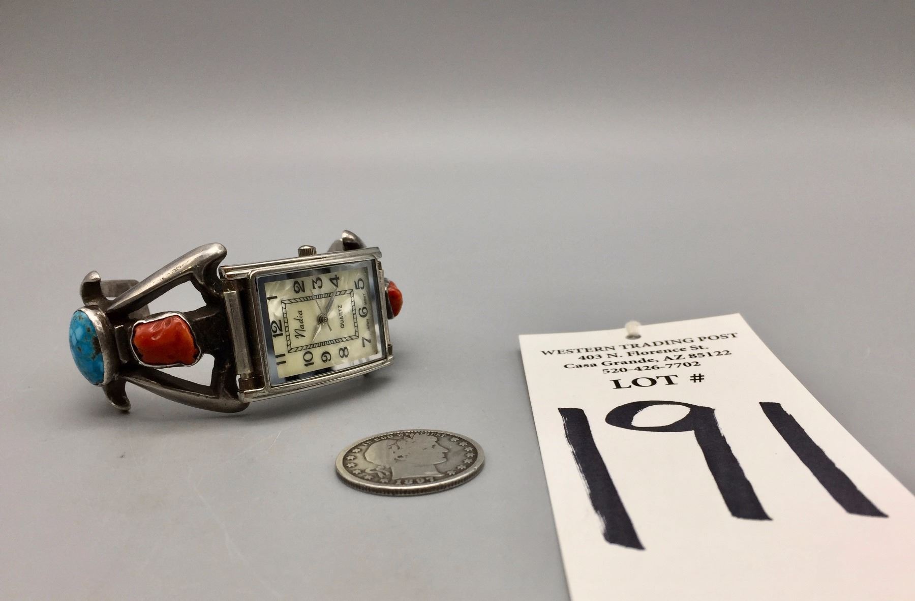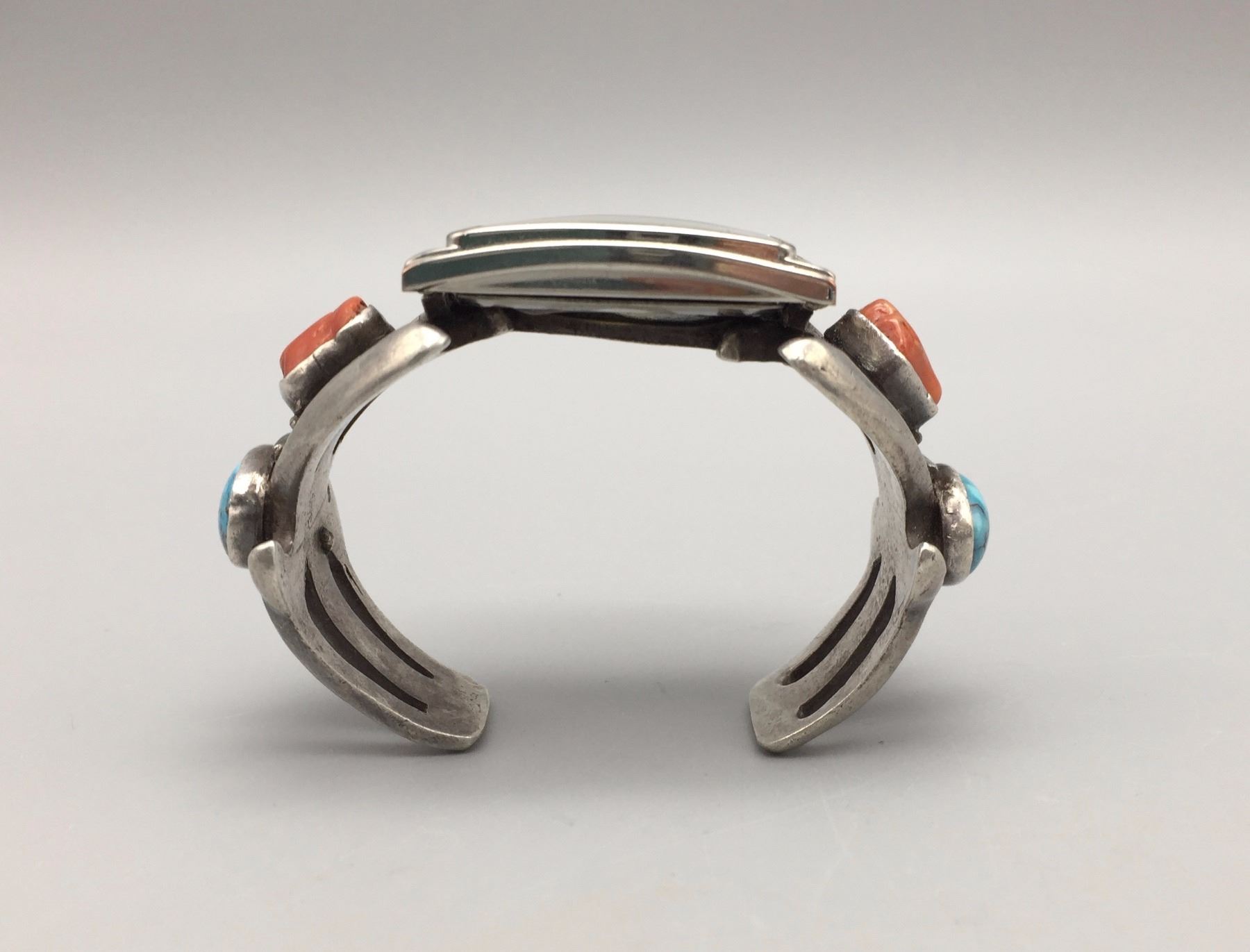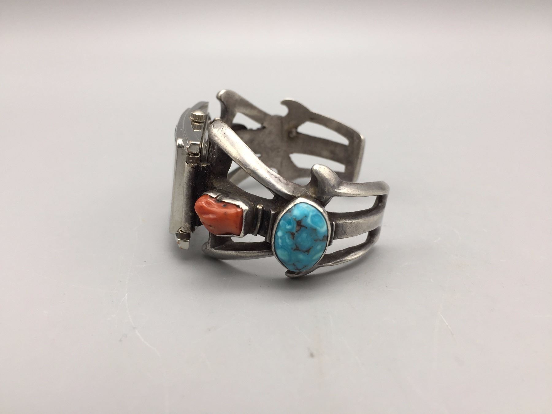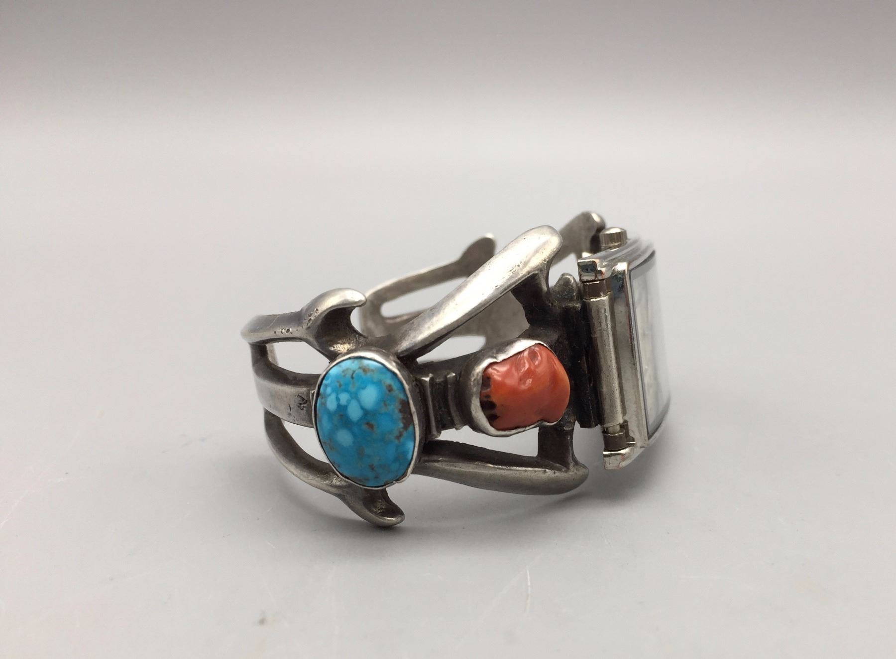 Description: Turquoise, coral and sterling silver watch bracelet. Maker: Hallmarked, RC Blake. Approx. Age: Vintage. Size: Inside circumference measures approx. 4 3/4“ with a 1 1/8” gap (making this bracelet fit about a 5 7/8” wrist). It is 1 1/4” wide across the face and weighs 75.1 g. Condition: Good for its age, normal wear expected. Please look closely at the pictures - they are an important part of our description. Shipping: There will be a $5 handling / packaging fee for shipping this lot. The actual cost of postage will be added on top of that.