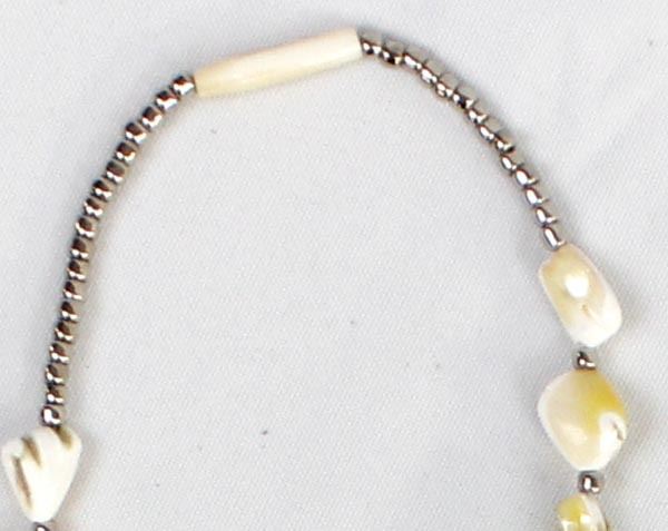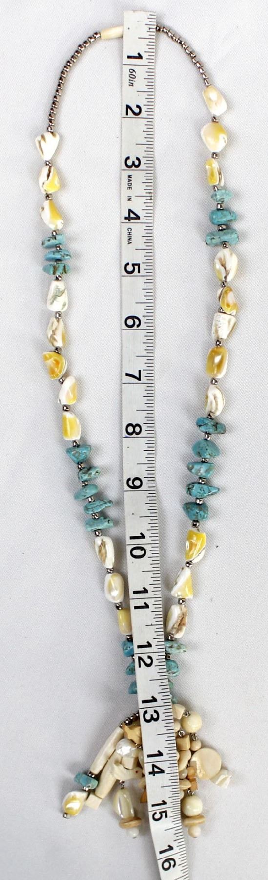 Turquoise and Gold Lip Shell Bead Necklace by Kathy Kills Thunder, measures 32''L end to end, turquoise measures approx. .5'', features bone beads, fetishes, mother of pearl