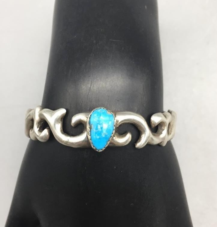 Description: Presented for sale in this lot is a nice turquoise and sand cast sterling silver bracelet with a nice scroll design and a tear drop turquoise stone. Maker: Jackson, Dan A. Jackson, (1944-; Navajo). Active since 1960s. Approx. Age: Circa 1970s-1980s. Size: Inside circumference measures 5-1/8 inches long. Opening is an additional 1-1/8 inch, fitting a 6-1/4 inch wrist. Width is 1/2 inch. Weighs 22.6 grams. Condition: Good for its age, normal wear expected. Please look closely at the pictures - they are an important part of our description. Shipping: There will be a $5 handling / packaging fee for shipping this lot. The actual cost of postage will be added on top of that.