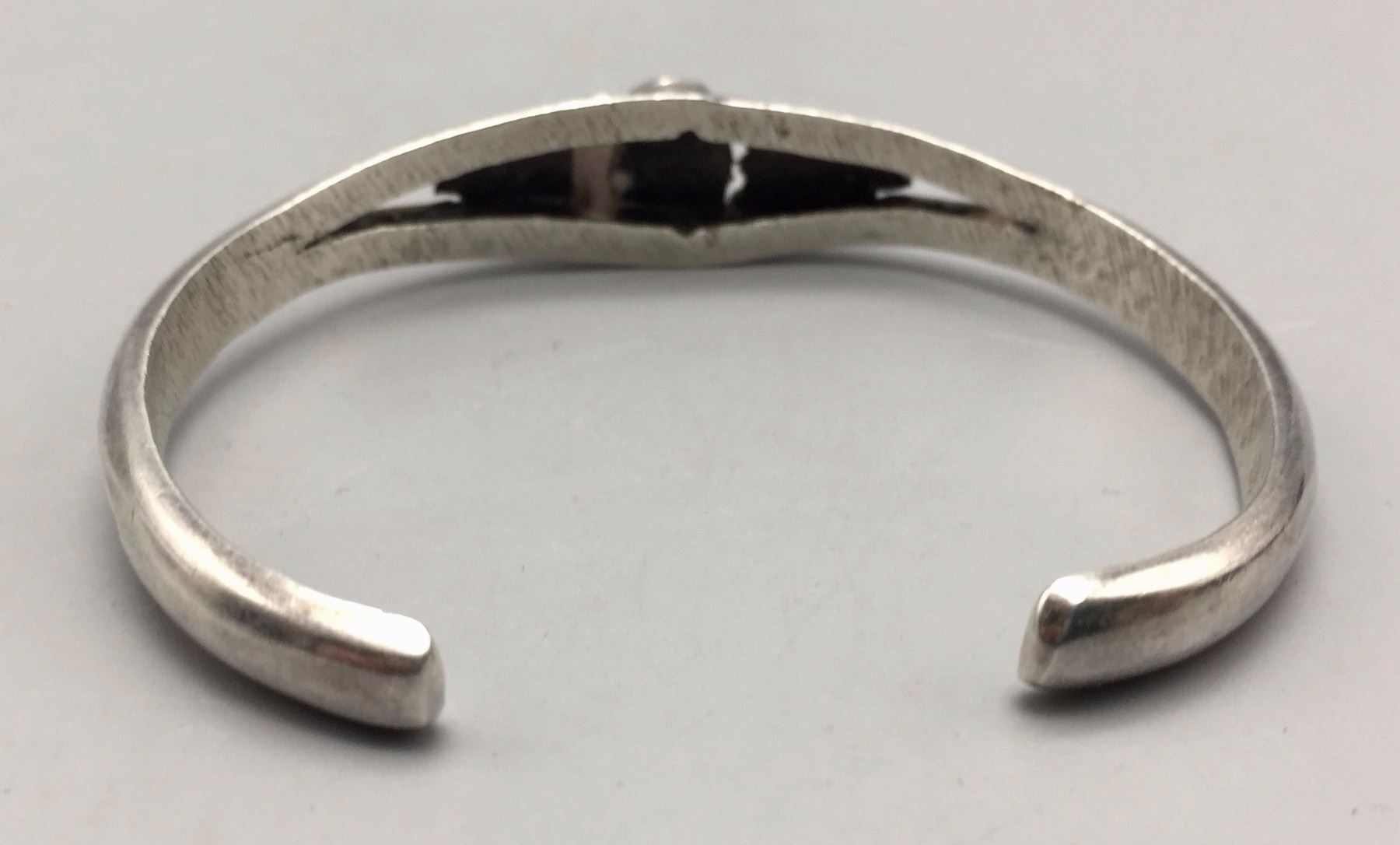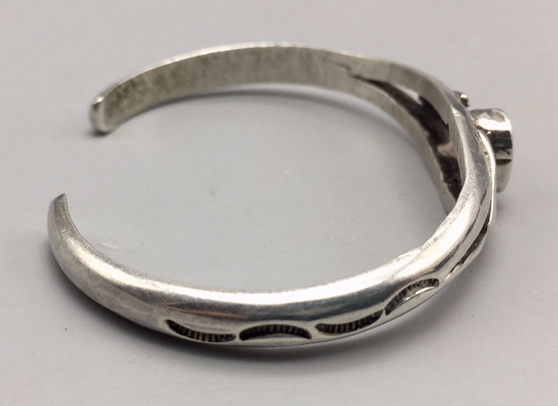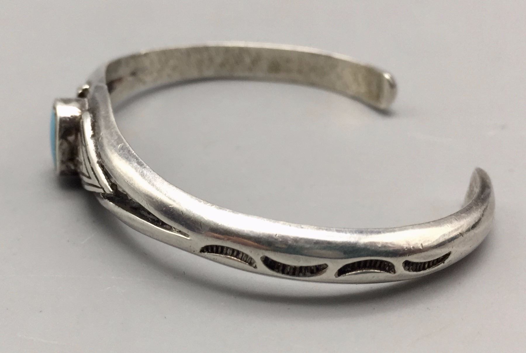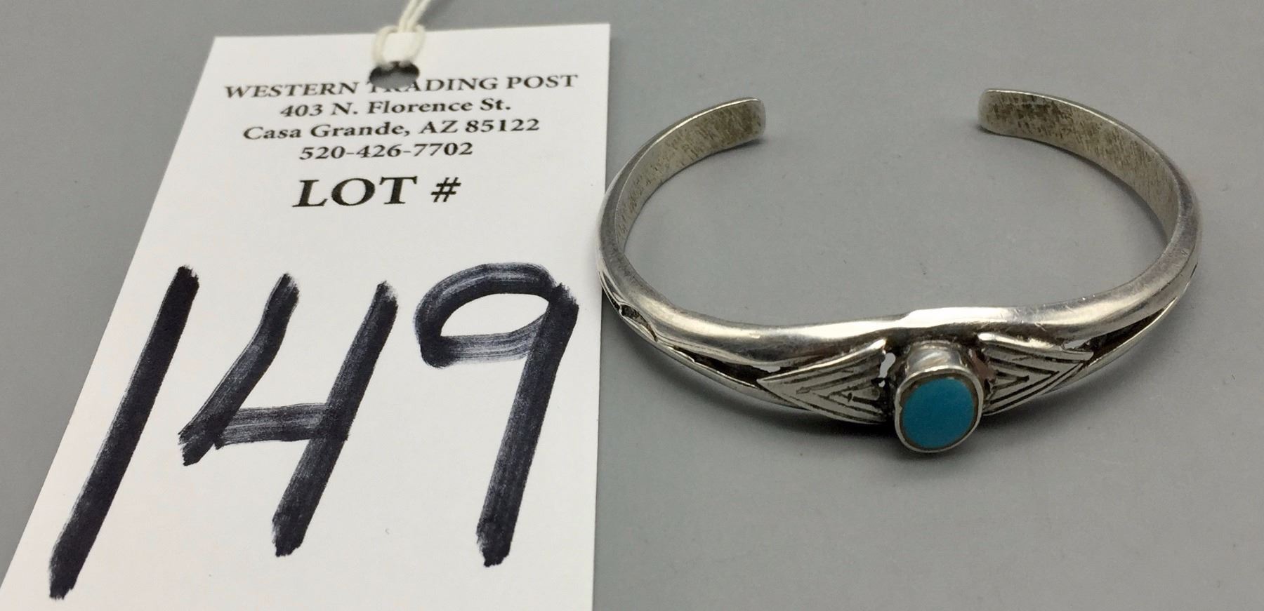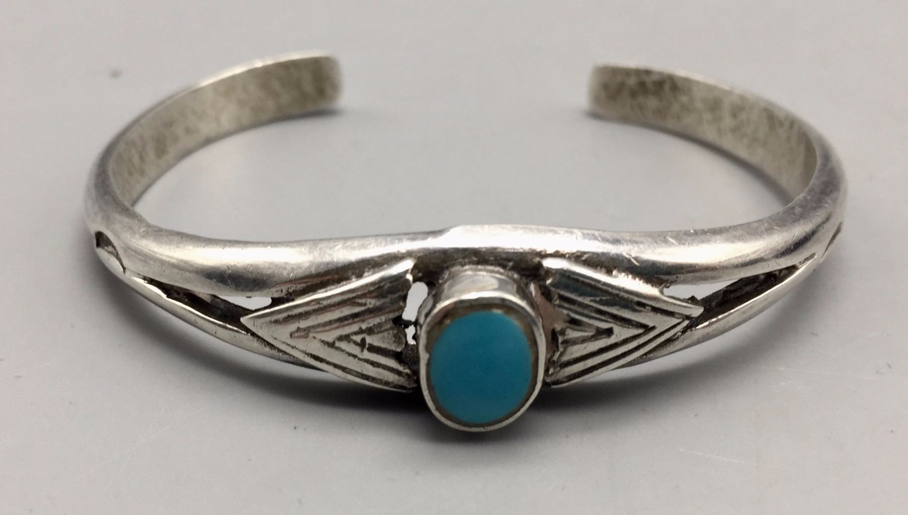 Maker: Unmarked, most likely Navajo. Approx. Age: Fairly Modern Size: Inside circumference of bracelet is 5 1/4” plus it has a 1” opening (making it fit a 6 1/4” wrist). Bracelet is almost 1/2” at it’s widest point and weighs 19.9 g. Additional Info: Turquoise stone set in sterling silver cuff. Condition: Good, normal wear expected. Please look closely at the pictures - they are an important part of our description. Shipping: There will be a $5 handling / packaging fee for shipping this lot. The actual cost of postage will be added on top of that.