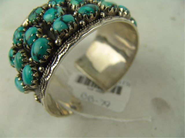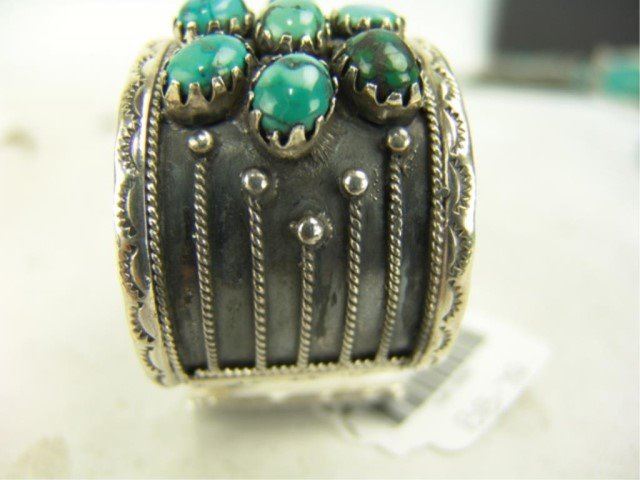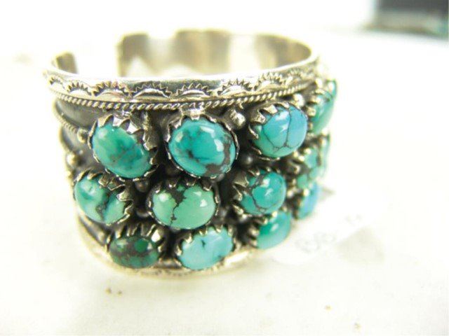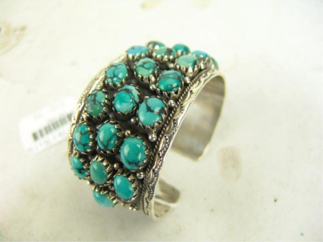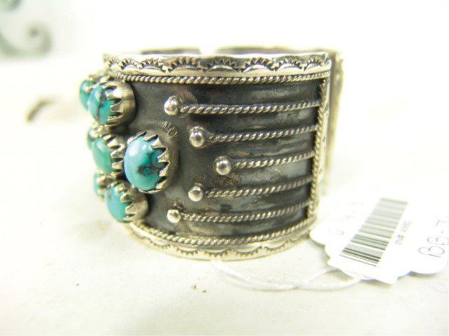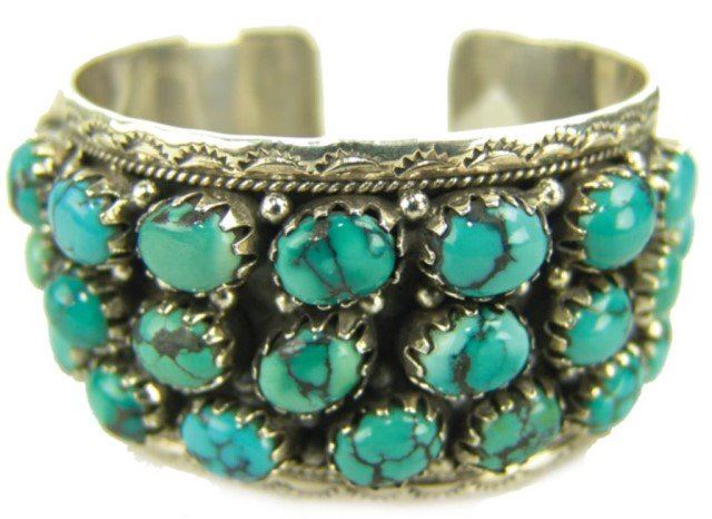 Ca. 1980s-1990s Wide high quality all silver cuff with fine rope accents and stamped edges and with 25 raised oval black matrix turquoise stone. Very good condition. Unsigned. 6-3/8" + 3/4" x 1-1/2"