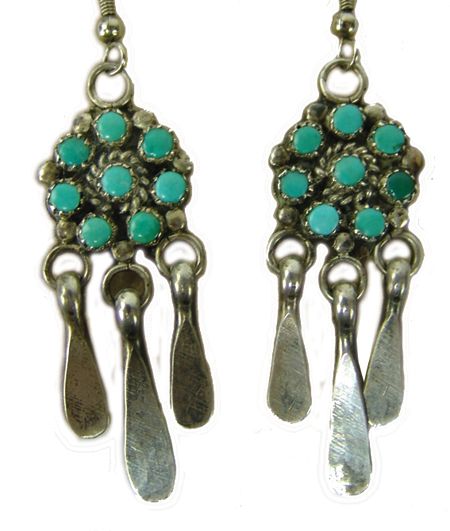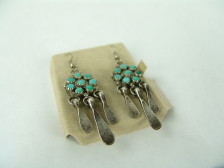 Ca. 1970s, Vintage pair of Navajo/Zuni earrings each with nine small stones and flattened "spoon" suspensions. Very good condition. 2-3/4"