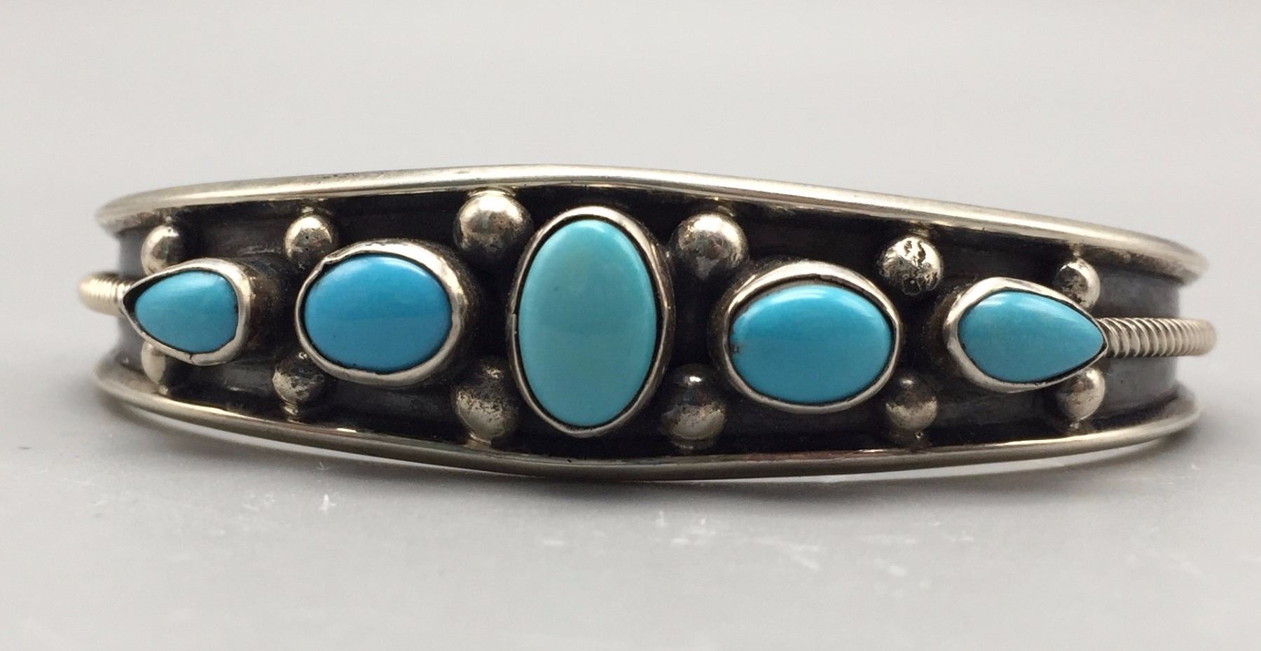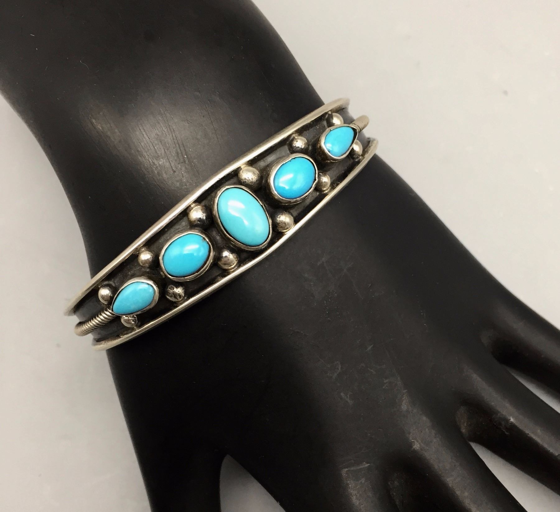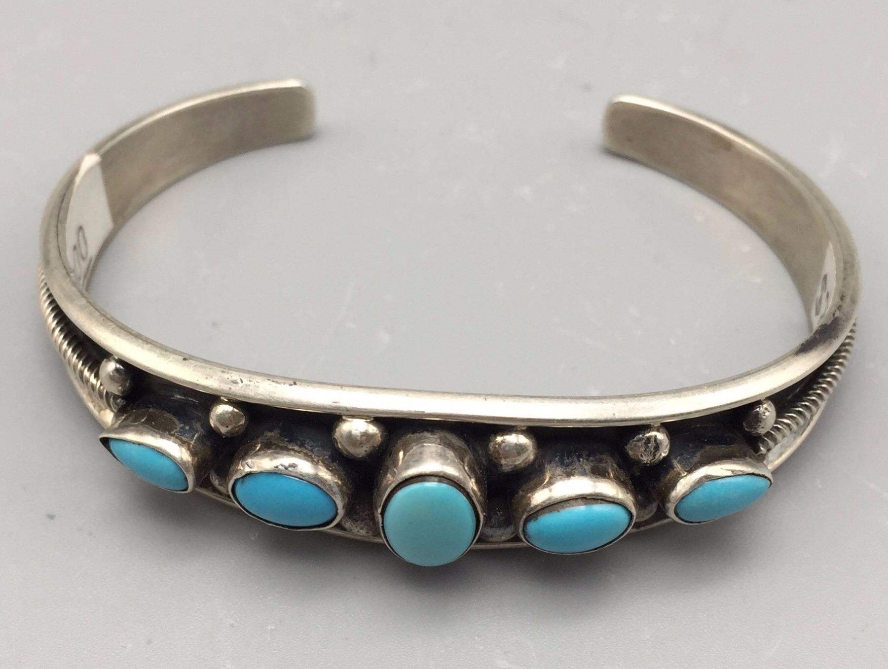 Maker: B. Johnson, Navajo. Approx. Age: Fairly modern. Size: Inside circumference 5 1/2” with an additional 1” opening (fits 6 1/2” wrist). approx. 1/2” at it’s widest and weighs 22.1 g. Additional Info: 5-stone retro style Navajo turquoise and sterling silver cuff bracelet. Condition: Good, normal wear expected. New, old stock (NOS). Please look closely at the pictures - they are an important part of our description. Shipping: There will be a $5 handling / packaging fee for shipping this lot. The actual cost of postage will be added on top of that.