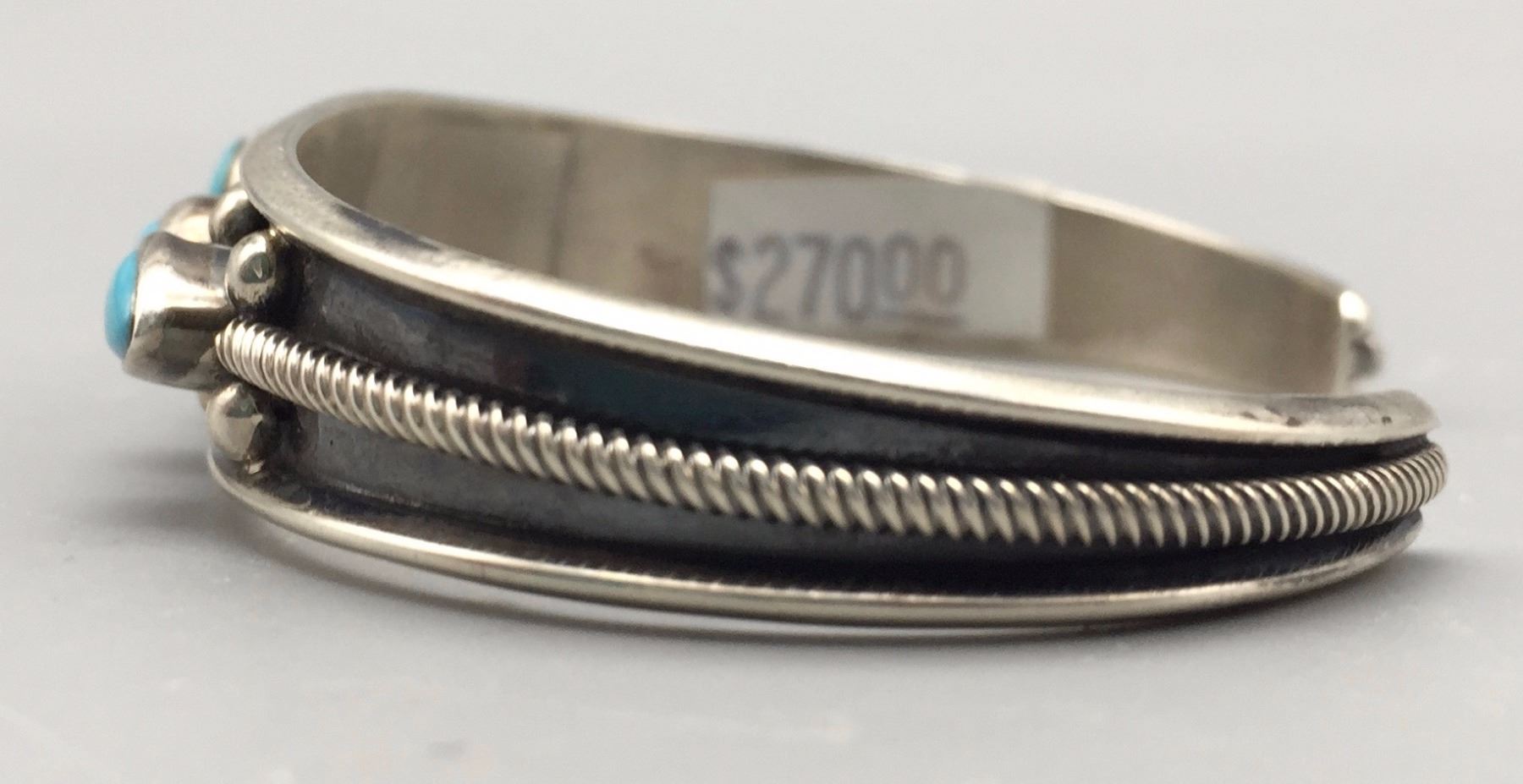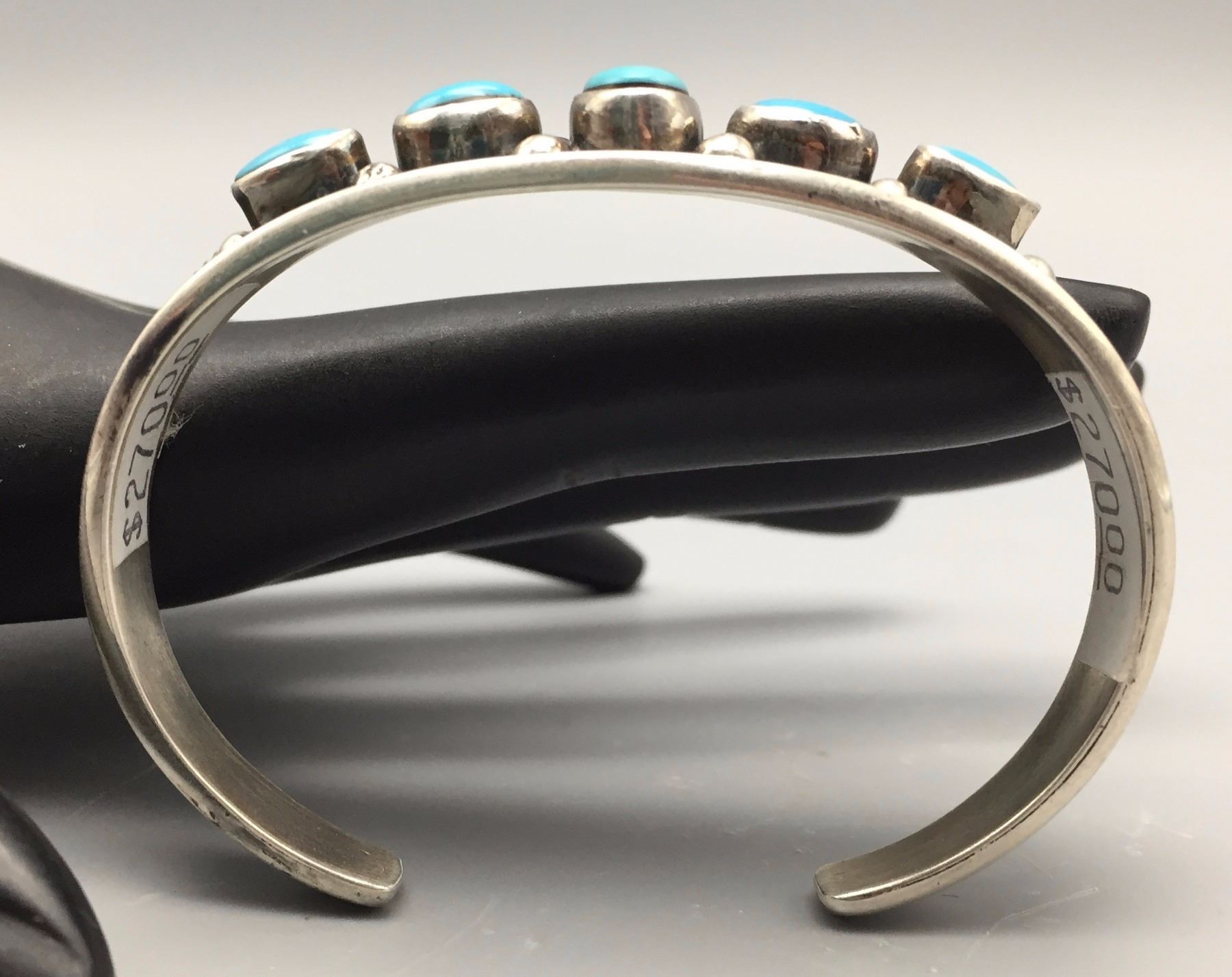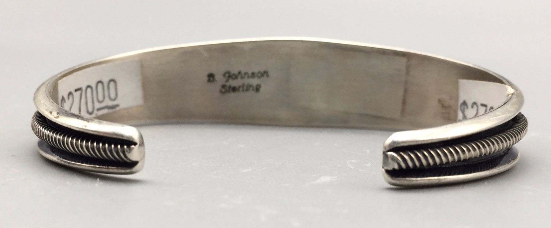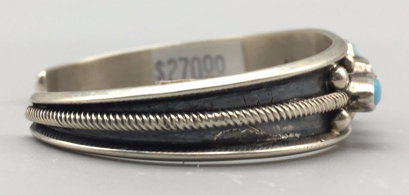 Maker: B. Johnson, Navajo. Approx. Age: Fairly modern. Size: Inside circumference 5 1/2” with an additional 1” opening (fits 6 1/2” wrist). approx. 1/2” at it’s widest and weighs 22.1 g. Additional Info: 5-stone retro style Navajo turquoise and sterling silver cuff bracelet. Condition: Good, normal wear expected. New, old stock (NOS). Please look closely at the pictures - they are an important part of our description. Shipping: There will be a $5 handling / packaging fee for shipping this lot. The actual cost of postage will be added on top of that.
