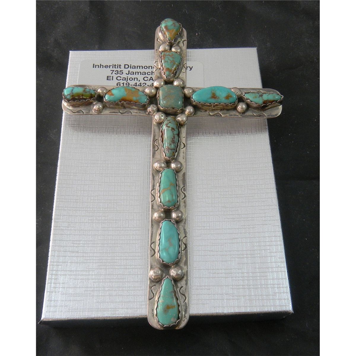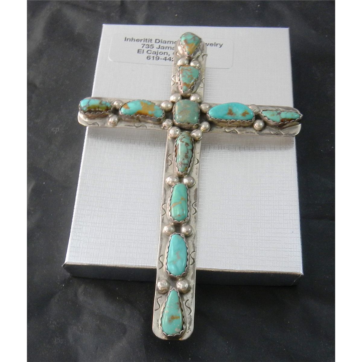 Turquoise and Sterling Cross. Total Weight is 74.8 Grams. Cross is marked Sterling and Signed JJ Cross Measures 6"x 4" x1/2" There are eleven turquoise cabs. Shipping $15.00