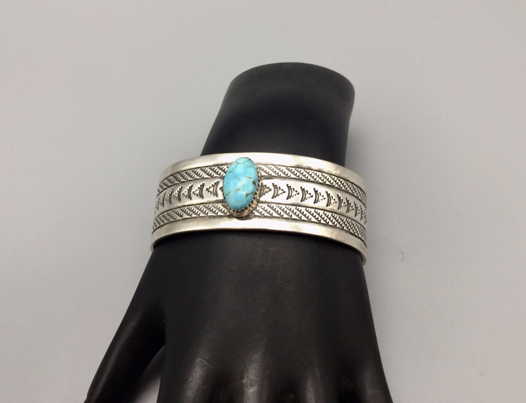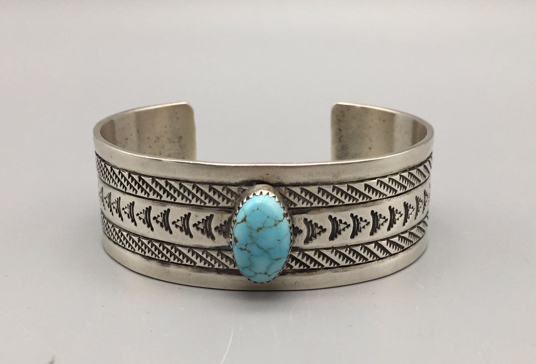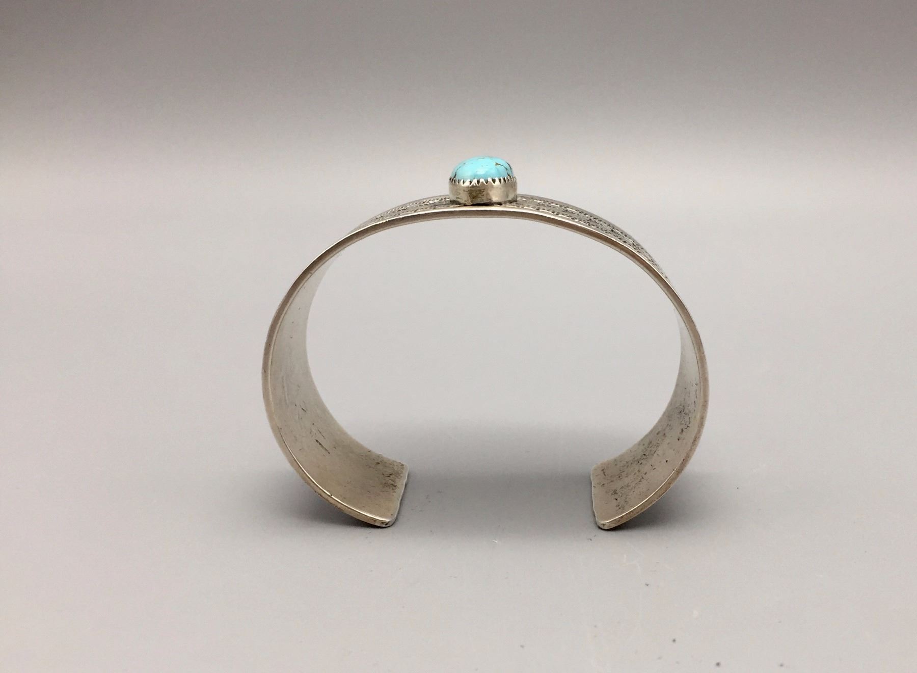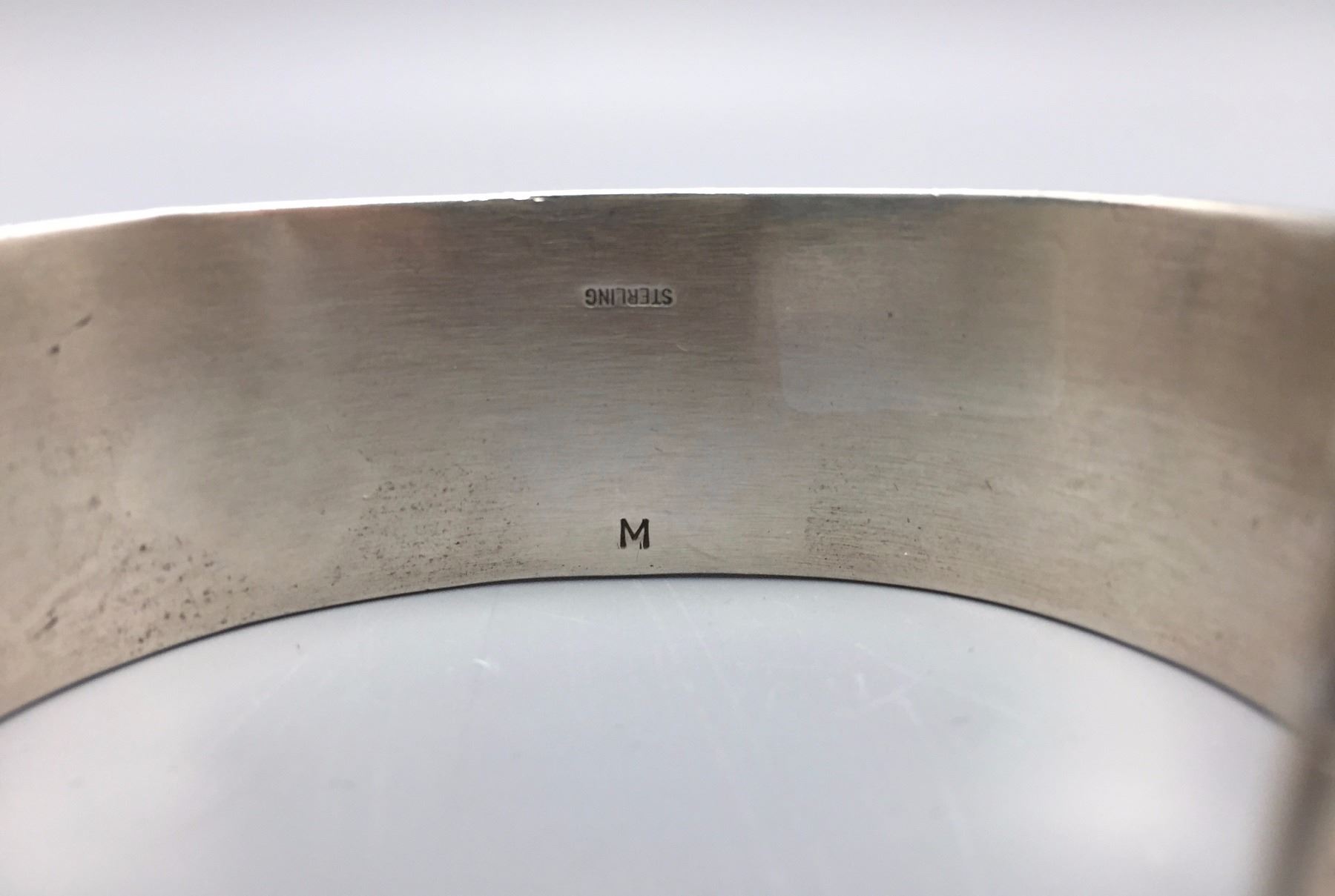 Maker: Hallmarked with an M. Approx. Age: Fairly modern. Size: Inside circumference measures 5 7/8” 1 1/4” (fits 7 1/8” wrist), 7/8” w and 56 g. Additional Info: Stamped sterling silver cuff bracelet with a nice turquoise cabochon. Condition: Good for it’s age, normal wear expected. Please look closely at the pictures - they are an important part of our description. Shipping: There will be a $5 handling / packaging fee for shipping this lot. The actual cost of postage will be added on top of that.