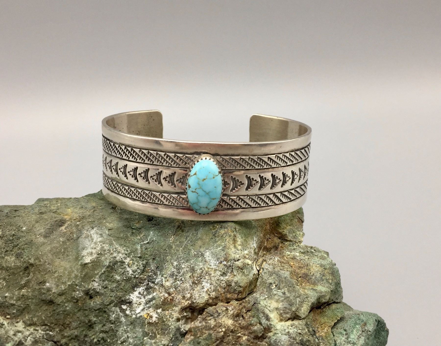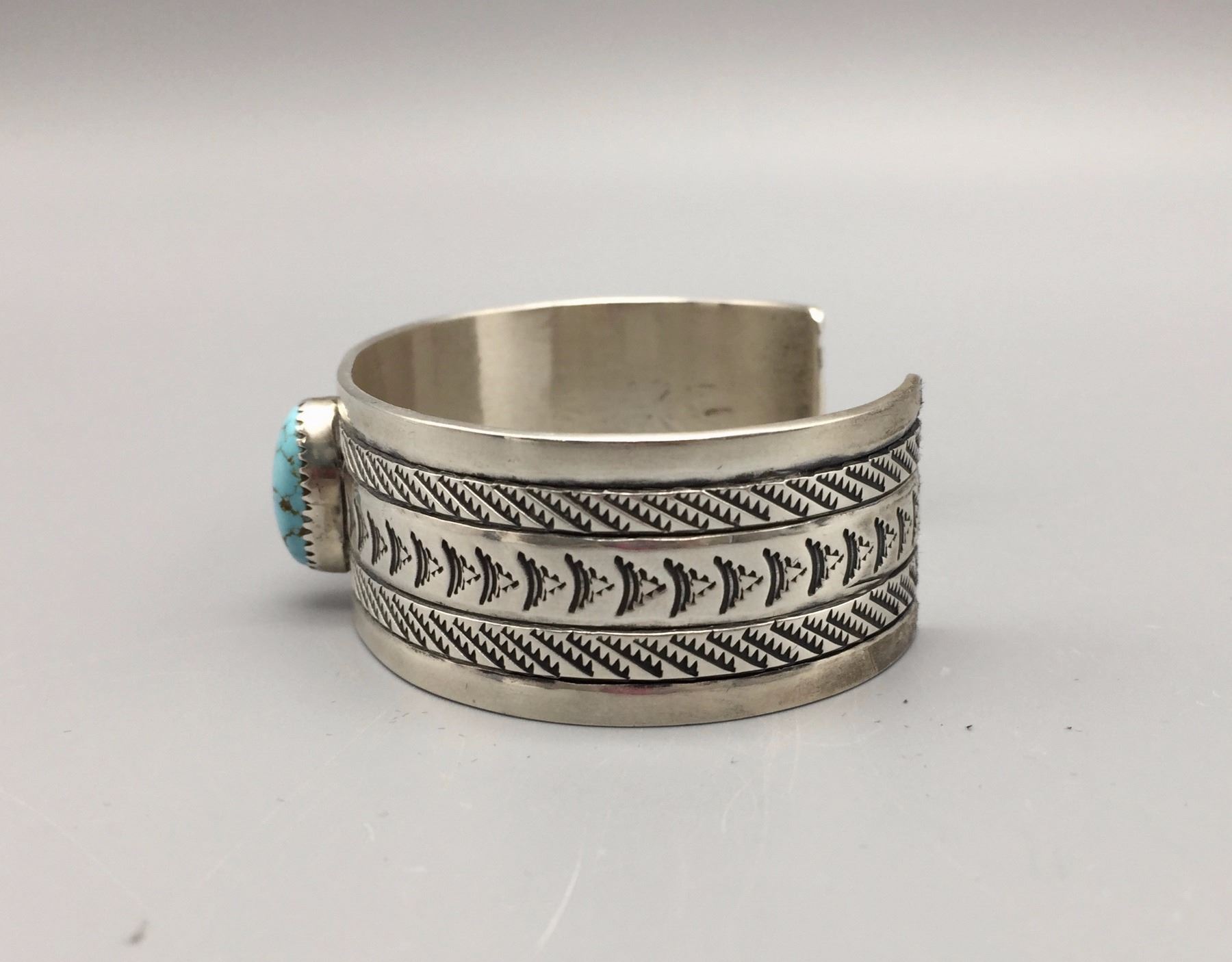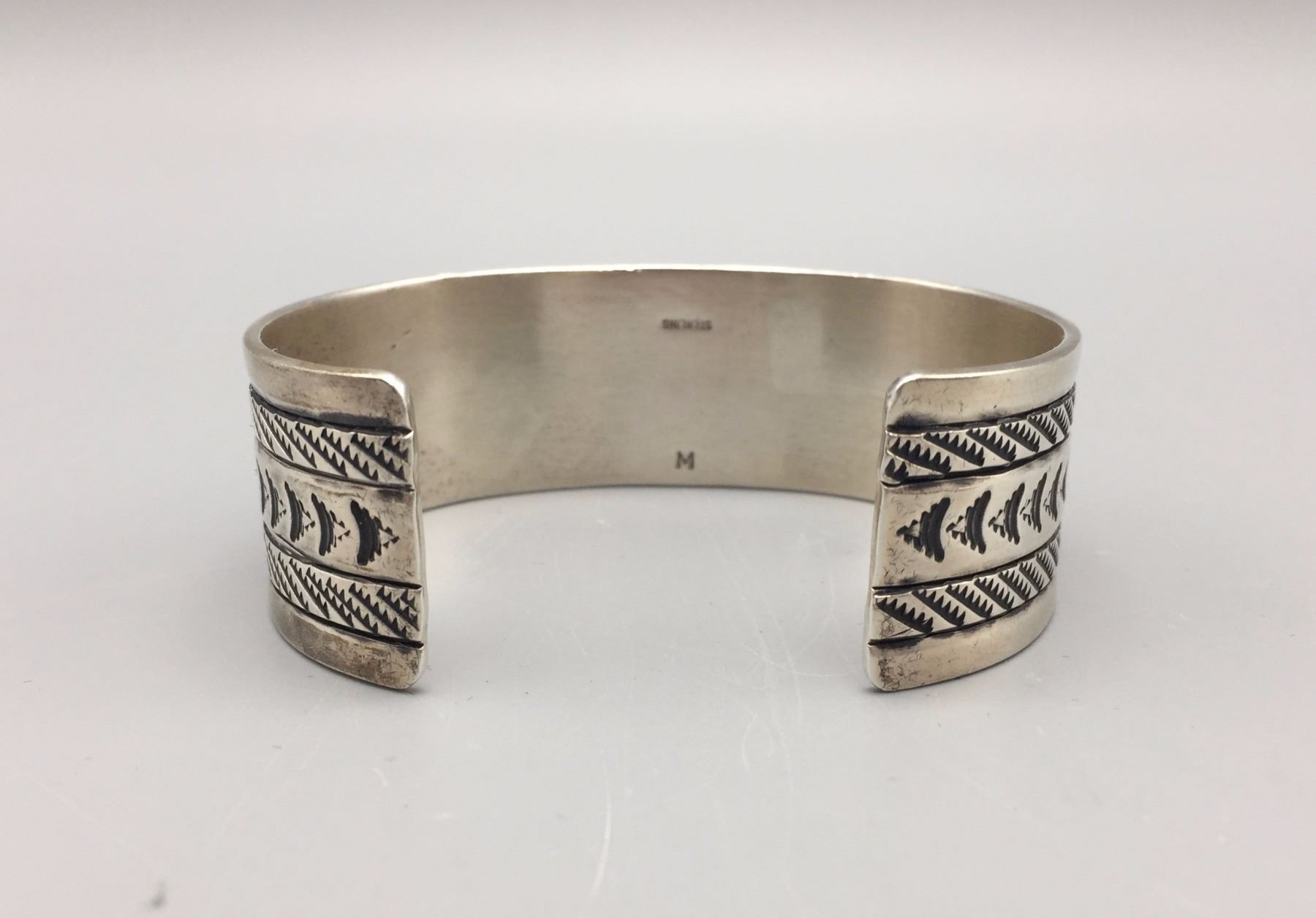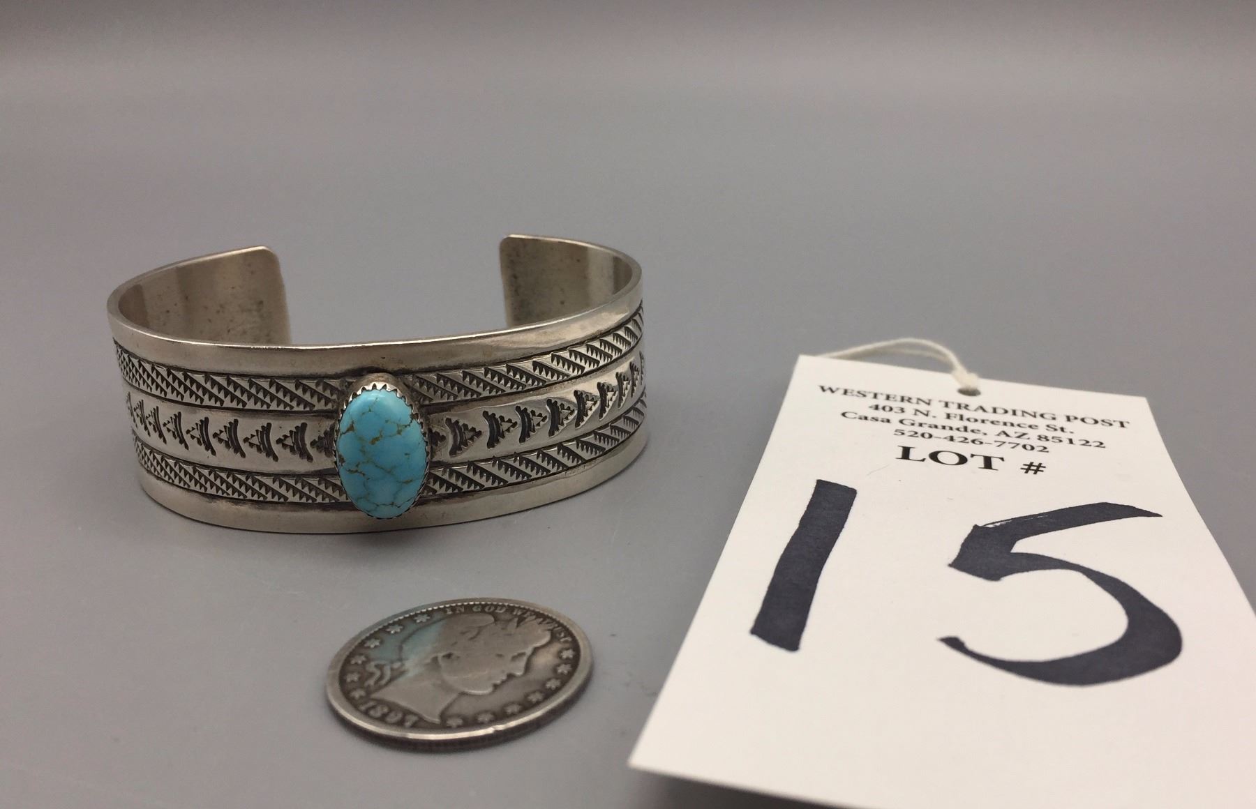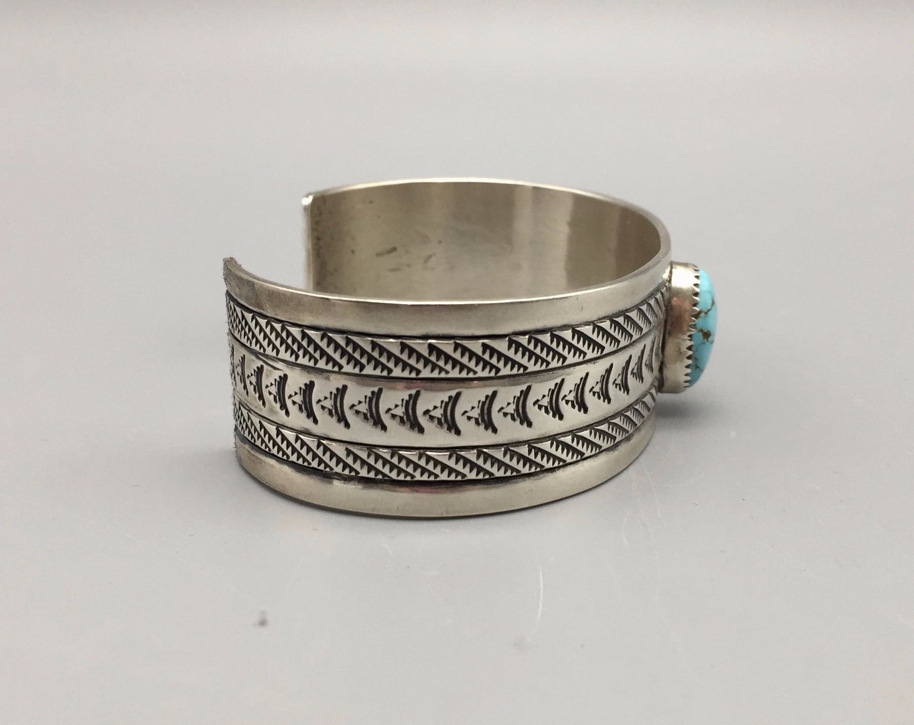 Maker: Hallmarked with an M. Approx. Age: Fairly modern. Size: Inside circumference measures 5 7/8” 1 1/4” (fits 7 1/8” wrist), 7/8” w and 56 g. Additional Info: Stamped sterling silver cuff bracelet with a nice turquoise cabochon. Condition: Good for it’s age, normal wear expected. Please look closely at the pictures - they are an important part of our description. Shipping: There will be a $5 handling / packaging fee for shipping this lot. The actual cost of postage will be added on top of that.