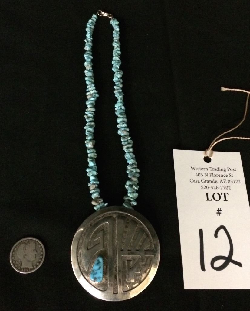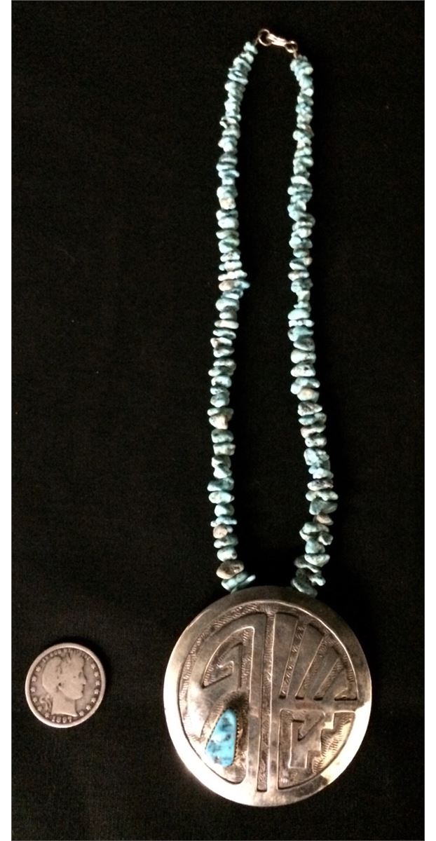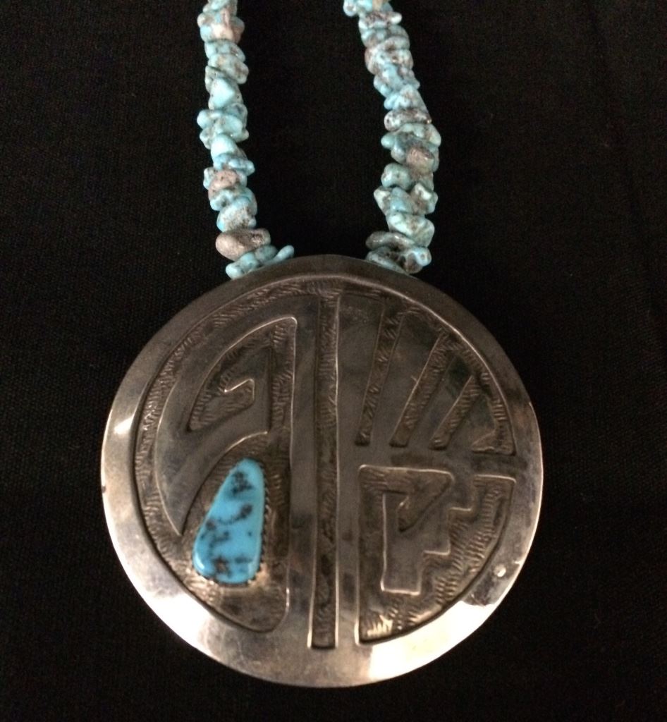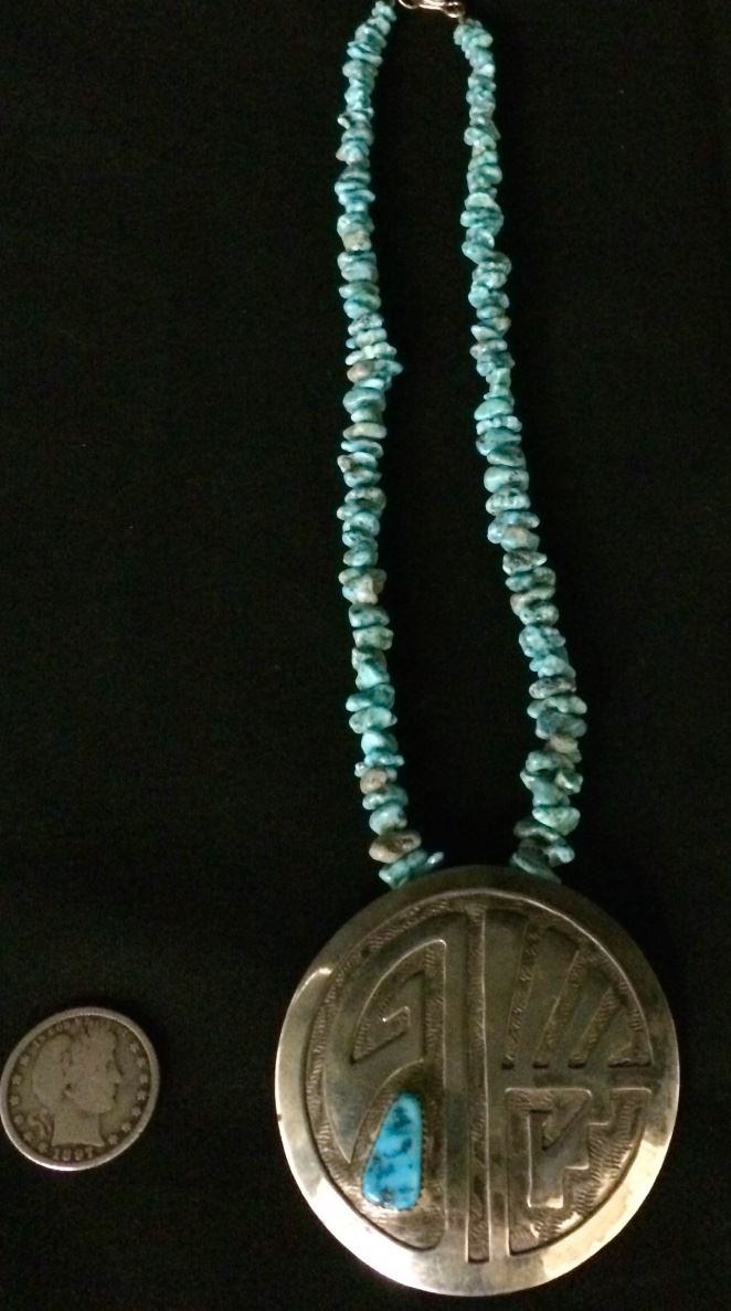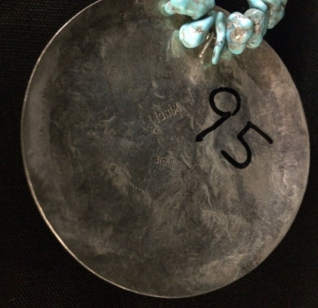 This vintage Navajo necklace is signed Windi and stamped sterling. The necklace fits approx. 16” around the neck. Looks like Kingman turquoise. Good condition. Shipping: There will be a $5 handling / packaging fee for shipping this lot. The actual cost of postage will be added on top of that.