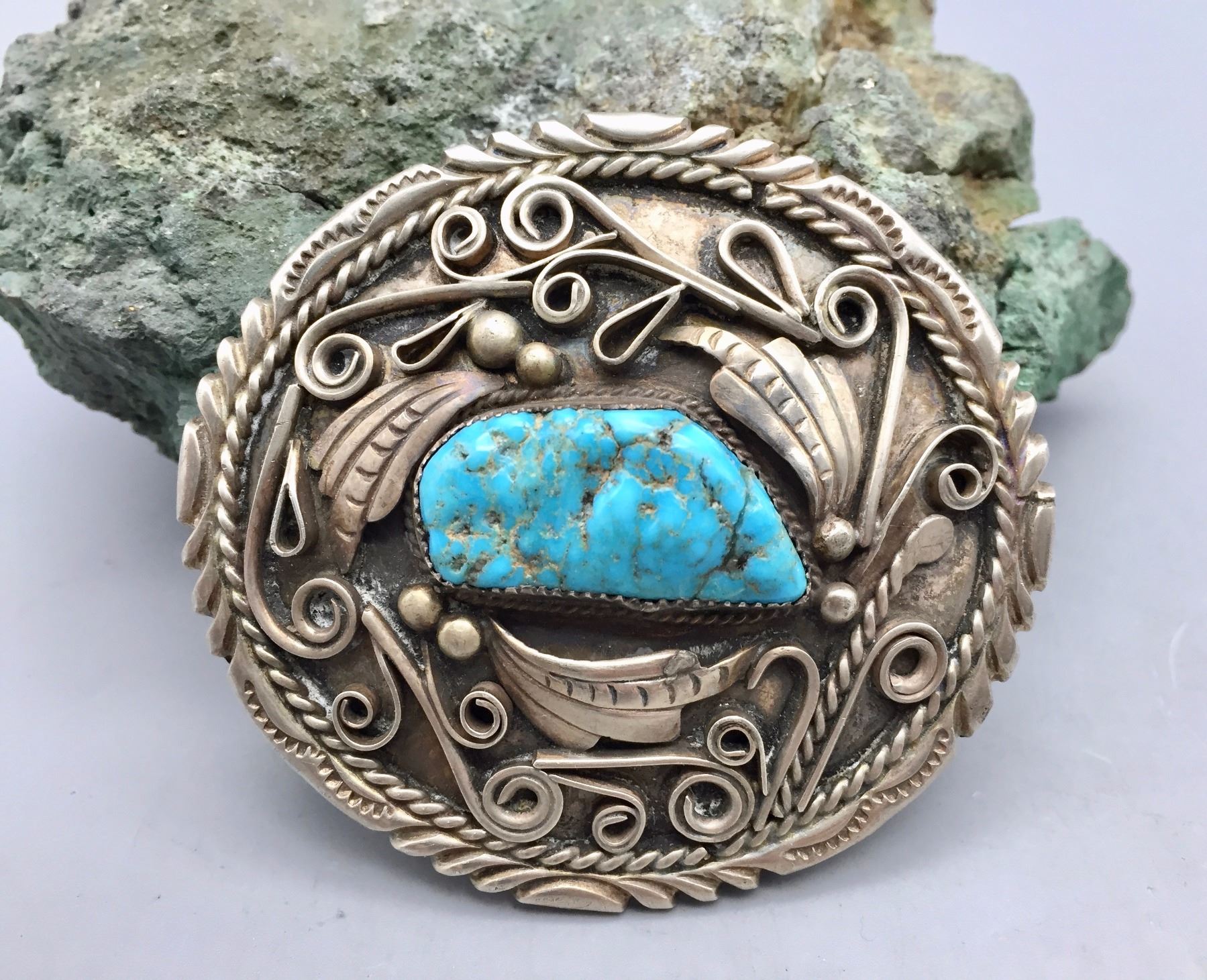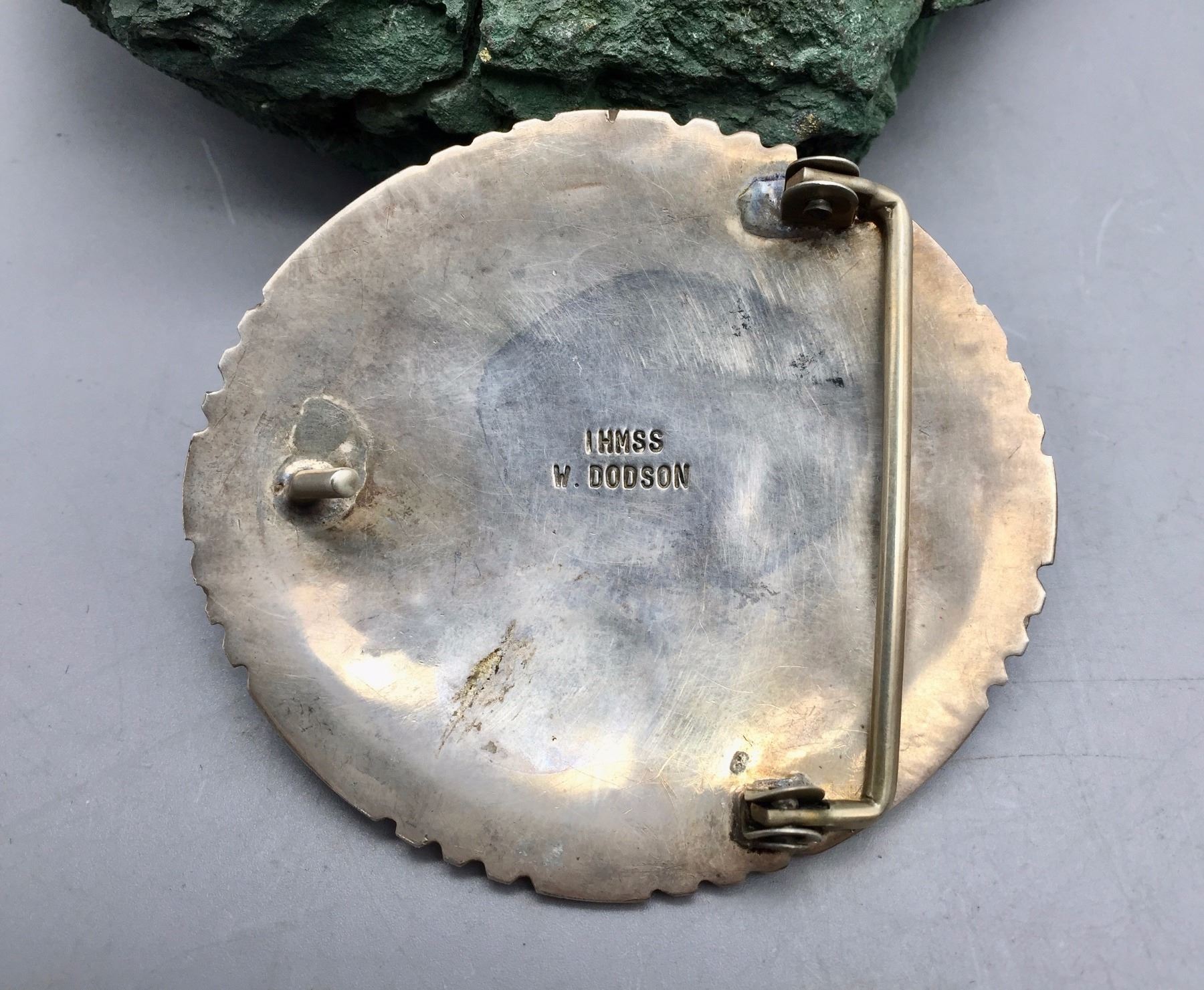 Description: Nice sterling silver belt buckle featuring a nugget style turquoise stone surrounded by appliqué silver work. Maker: Hallmarked W. Dodson. Approx. Age:Circa 1970s - 80. Size: 3”w x 2-3/4h. Fits an approx. 2” belt. Condition: Good for its age, normal wear expected. Please look closely at the pictures - they are an important part of our description. Shipping: There will be a $5 handling / packaging fee for shipping this lot. The actual cost of postage will be added on top of that.
